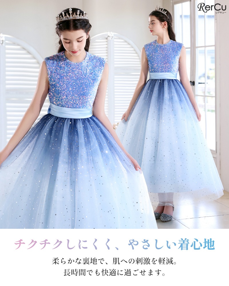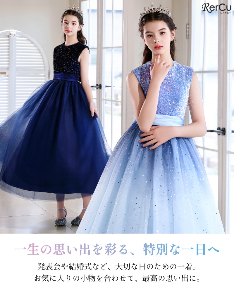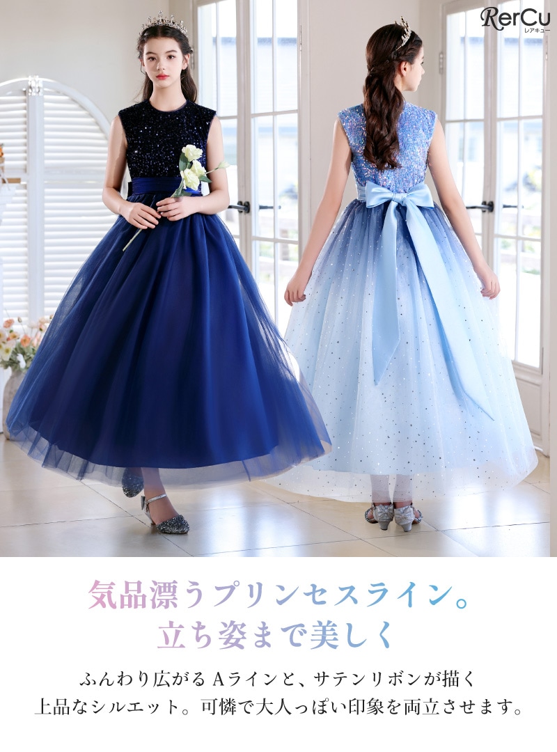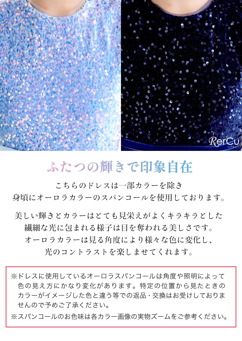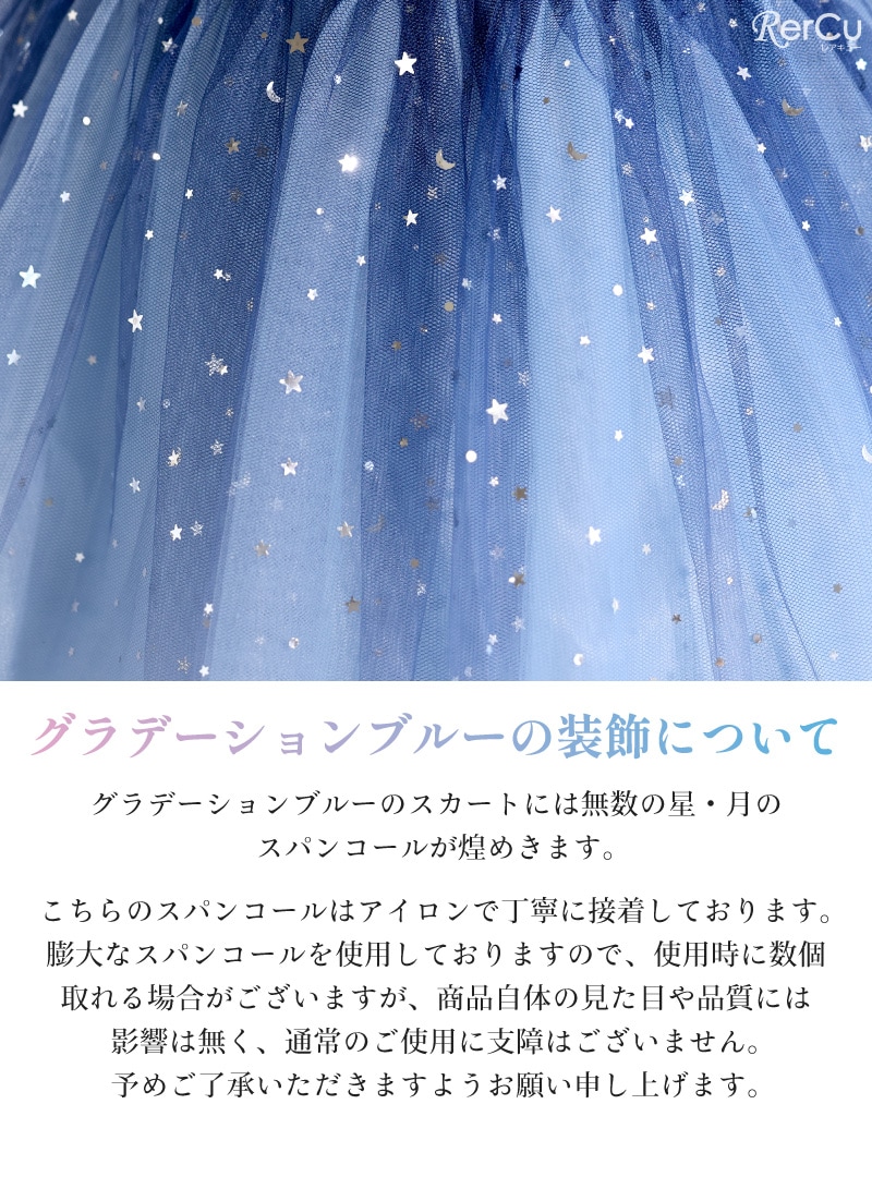 身頃全体にあしらわれたスパンコールが光を浴びてきらめき、まるで主役のように輝くドレス。光の角度で色が変化するオーロラスパンコールを使用したカラーもあり、幻想的な美しさを際立たせます。ふんわりと広がるチュールスカートは、無数の星や月を散りばめたようなデザイン(※グラデーションブルーのみ)。ウエストのサテンリボンが上品なシルエットを完成させます。
