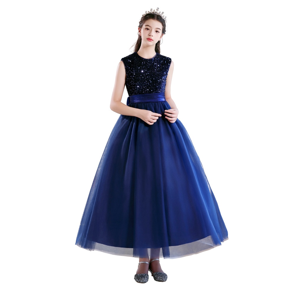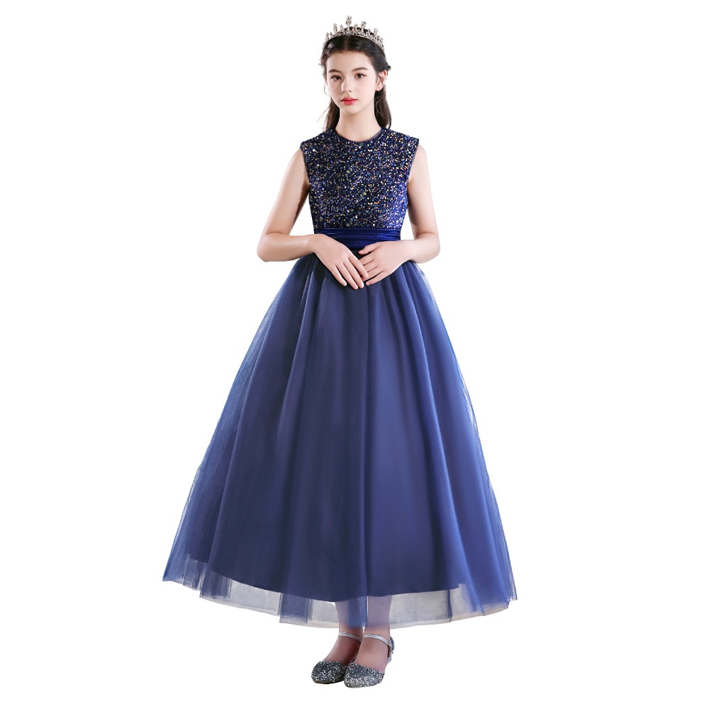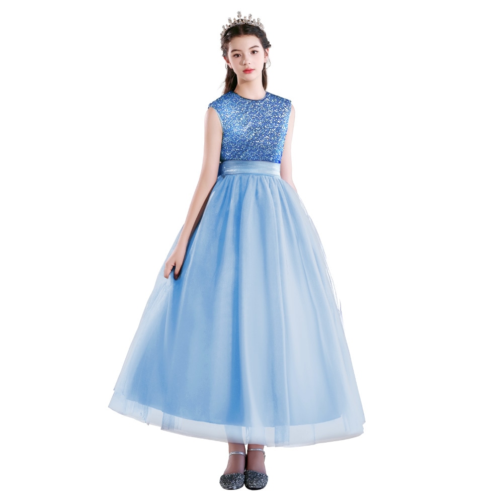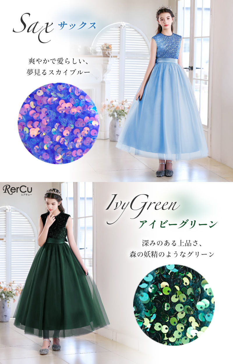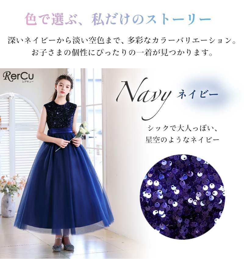 身頃全体にあしらわれたスパンコールが光を浴びてきらめき、まるで主役のように輝くドレス。光の角度で色が変化するオーロラスパンコールを使用したカラーもあり、幻想的な美しさを際立たせます。ふんわりと広がるチュールスカートは、無数の星や月を散りばめたようなデザイン(※グラデーションブルーのみ)。ウエストのサテンリボンが上品なシルエットを完成させます。