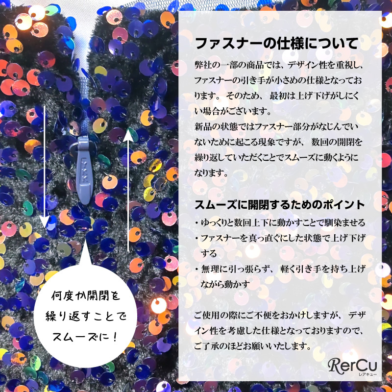 ・スパンコールはデリケートなため、着用時や洗濯時に数個取れる場合がございますが、商品自体の欠陥や品質には問題ございません。