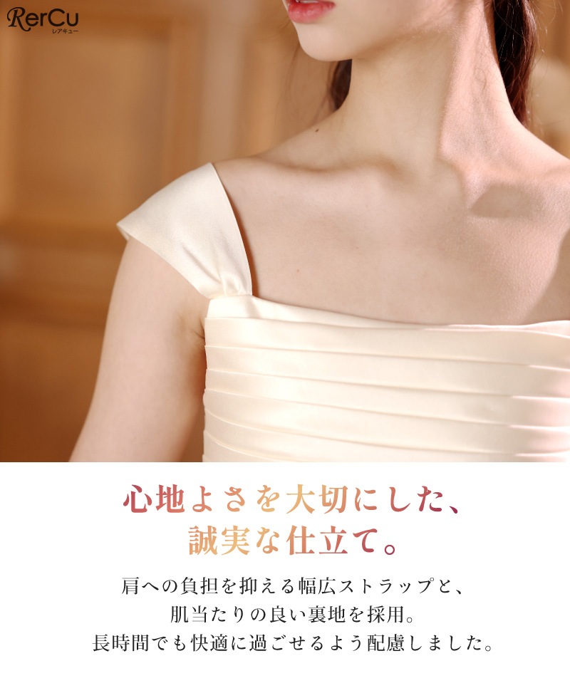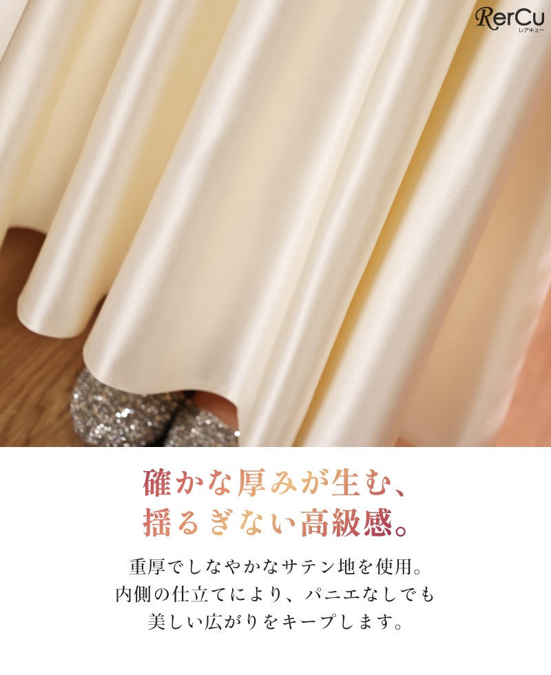 肩が疲れにくい「幅広ストラップ」と、肌当たりの良い裏地で長時間でも快適。贅沢な生地厚により、パニエなしでも美しい広がりをキープします。シワになってもスチームアイロンでサッと復元できるため、お手入れも簡単。サテン本来のなめらかな光沢をすぐに取り戻せます。