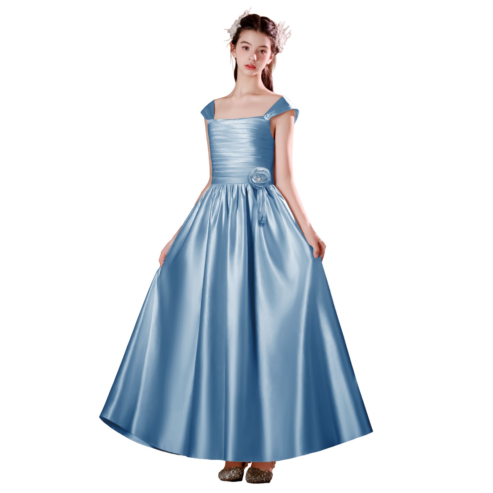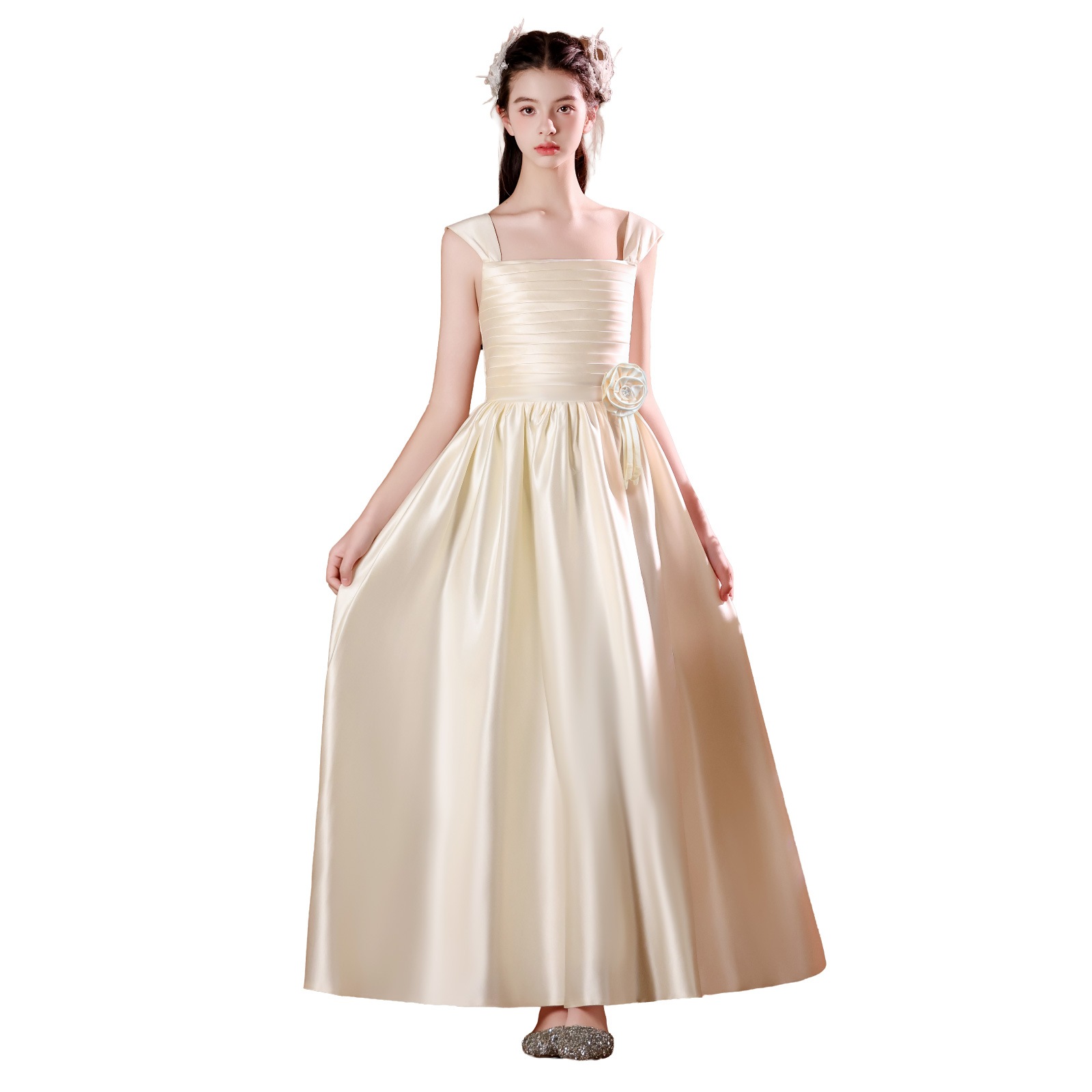 真珠のような光沢をまとう、多面的な造形美のサテンドレス