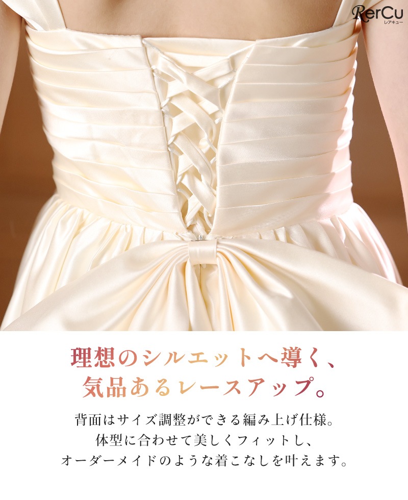 光を美しく反射する「高密度サテン」を使用。胸元の「水平プリーツ」が、お顔周りを知的で端正に彩ります。背面はサイズ調整ができる「編み上げ仕様」で、オーダーメイドのような美しいフィット感を実現。着脱可能な大ぶりリボンとコサージュで、シーンに合わせたアレンジも自在です。