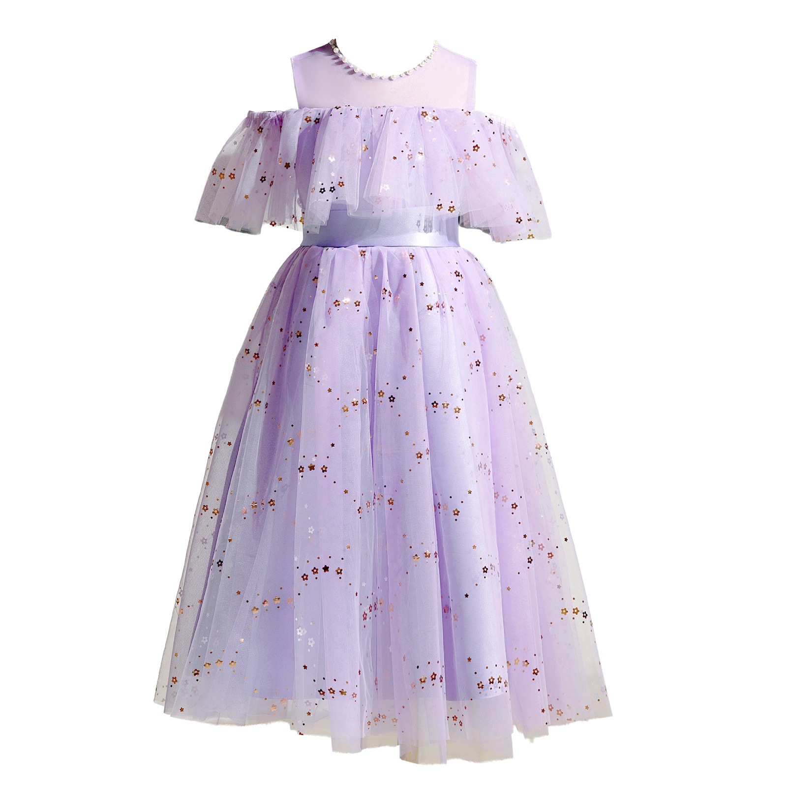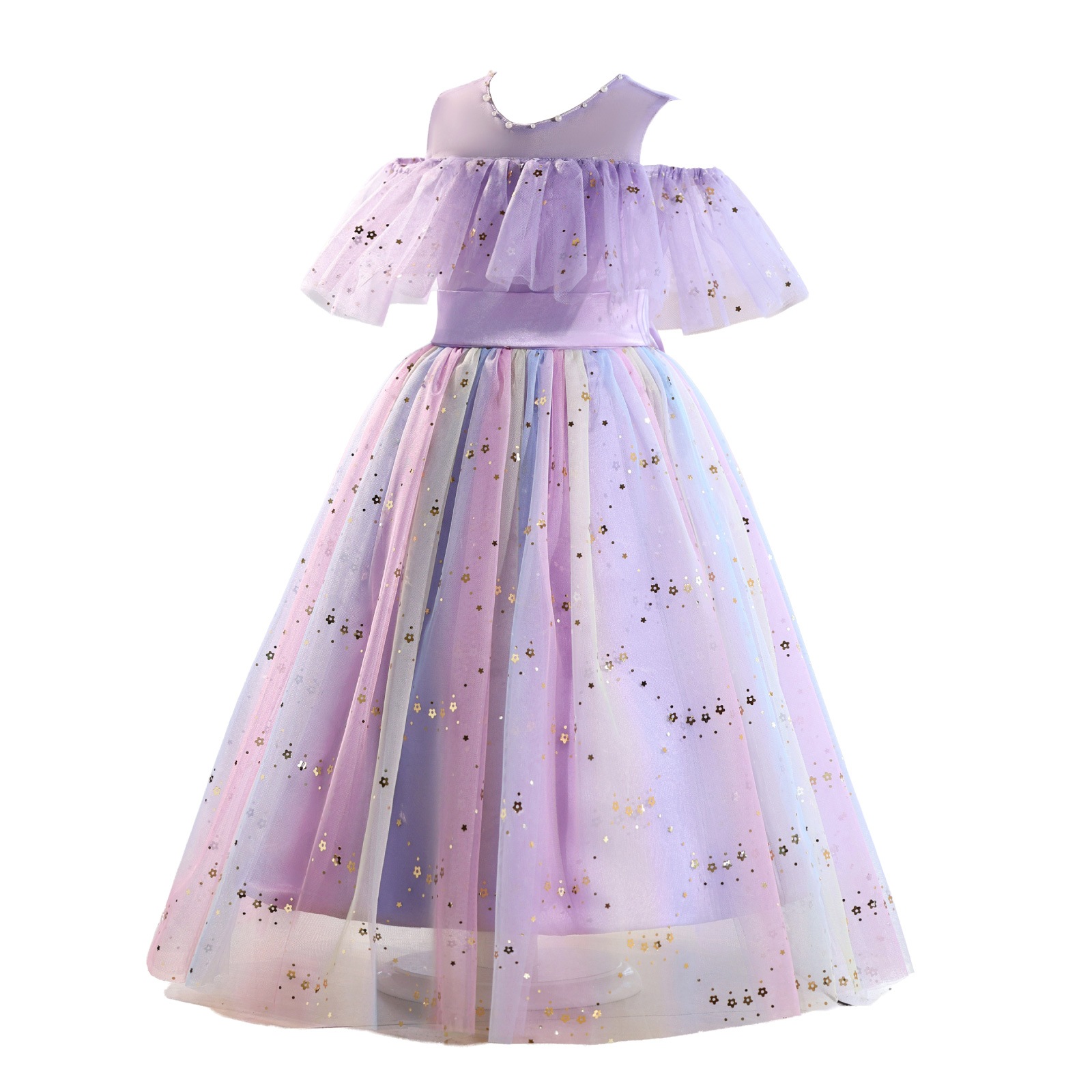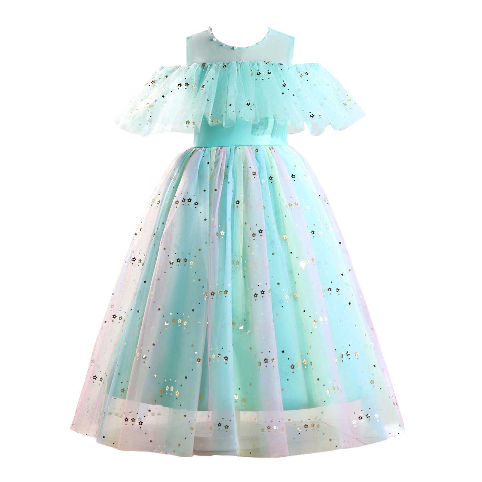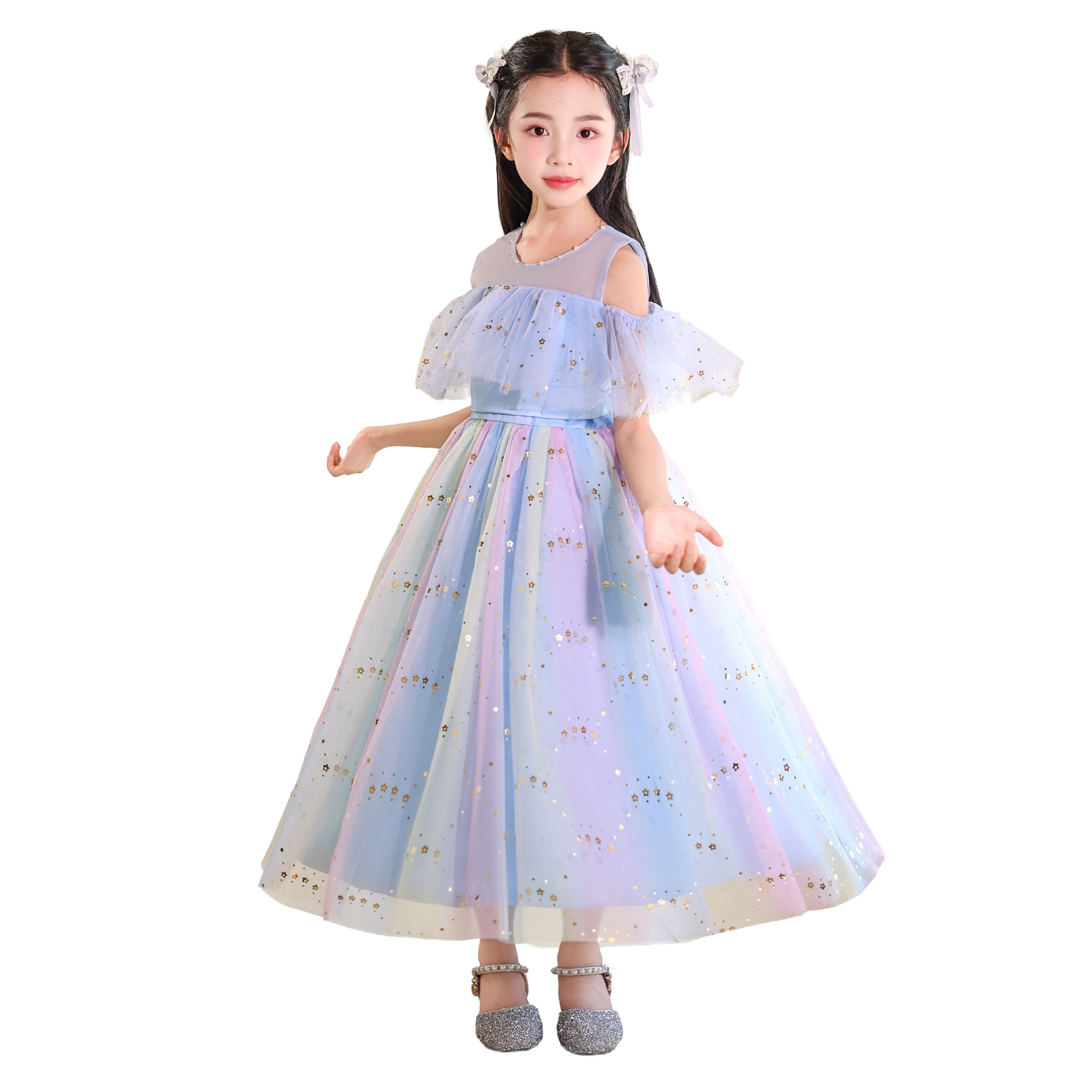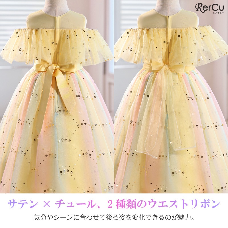 レインボーラメがきらめくチュール素材のスカートに、オフショルダーの肩開きデザインを取り入れた華やかドレス。星柄スパンコールが光を受けて美しく輝き、動きに合わせて存在感がアップ。首元には縫い付けパールを施し、上品で繊細な印象に。選べる16色のカラーバリエーションで、個性やシーンに合わせたスタイリングが楽しめます。