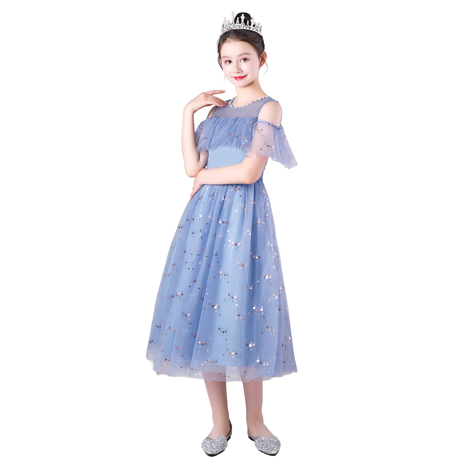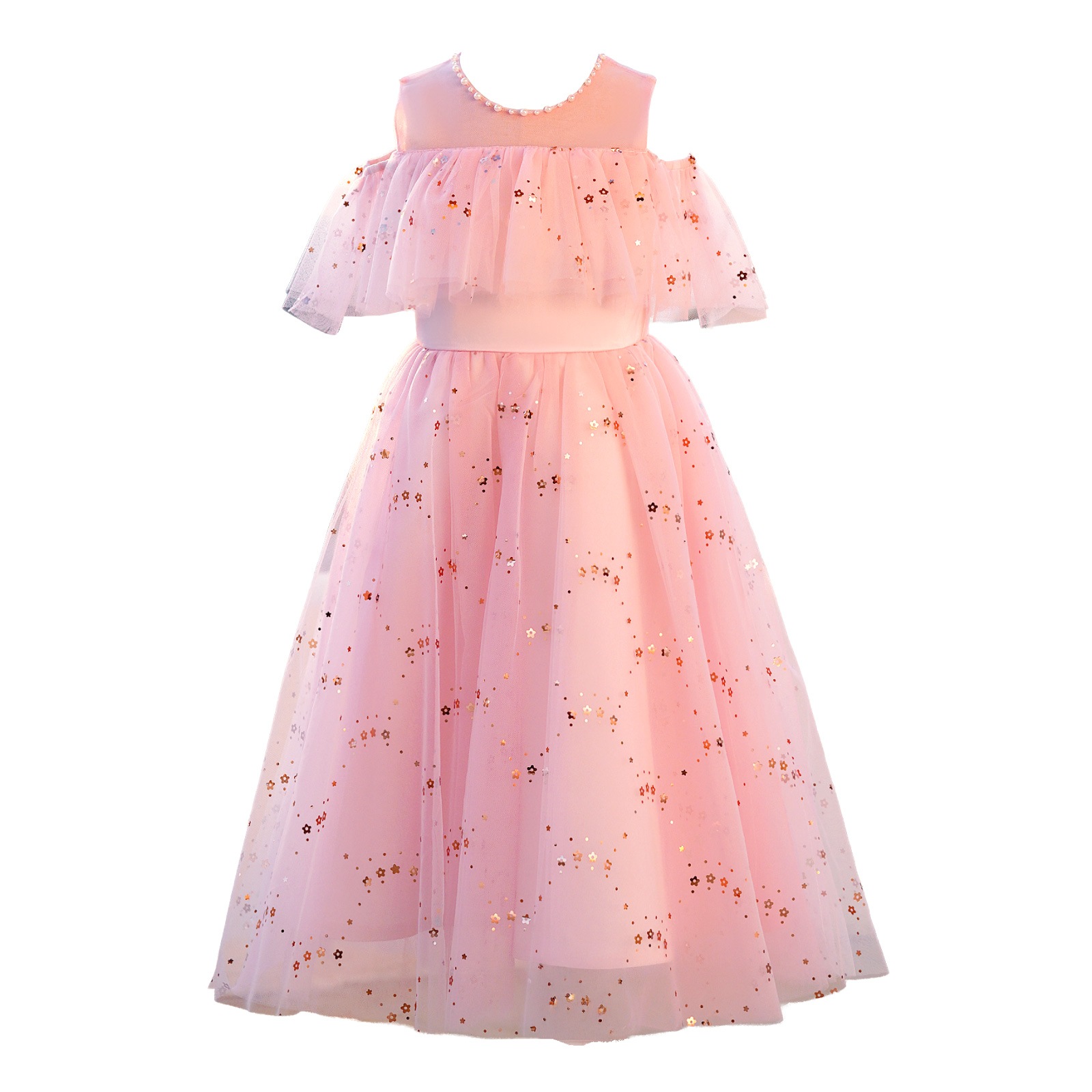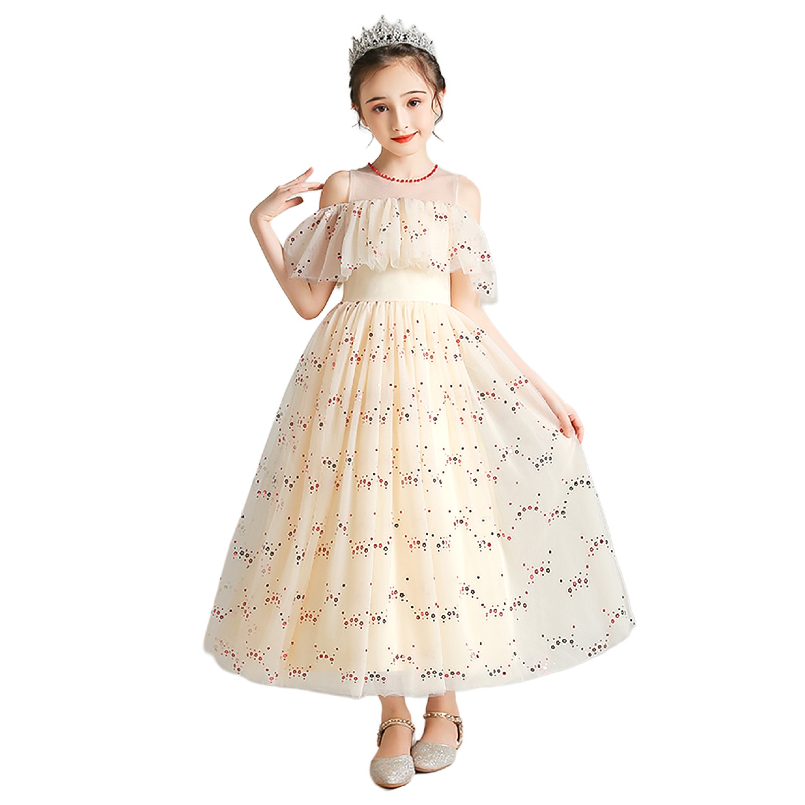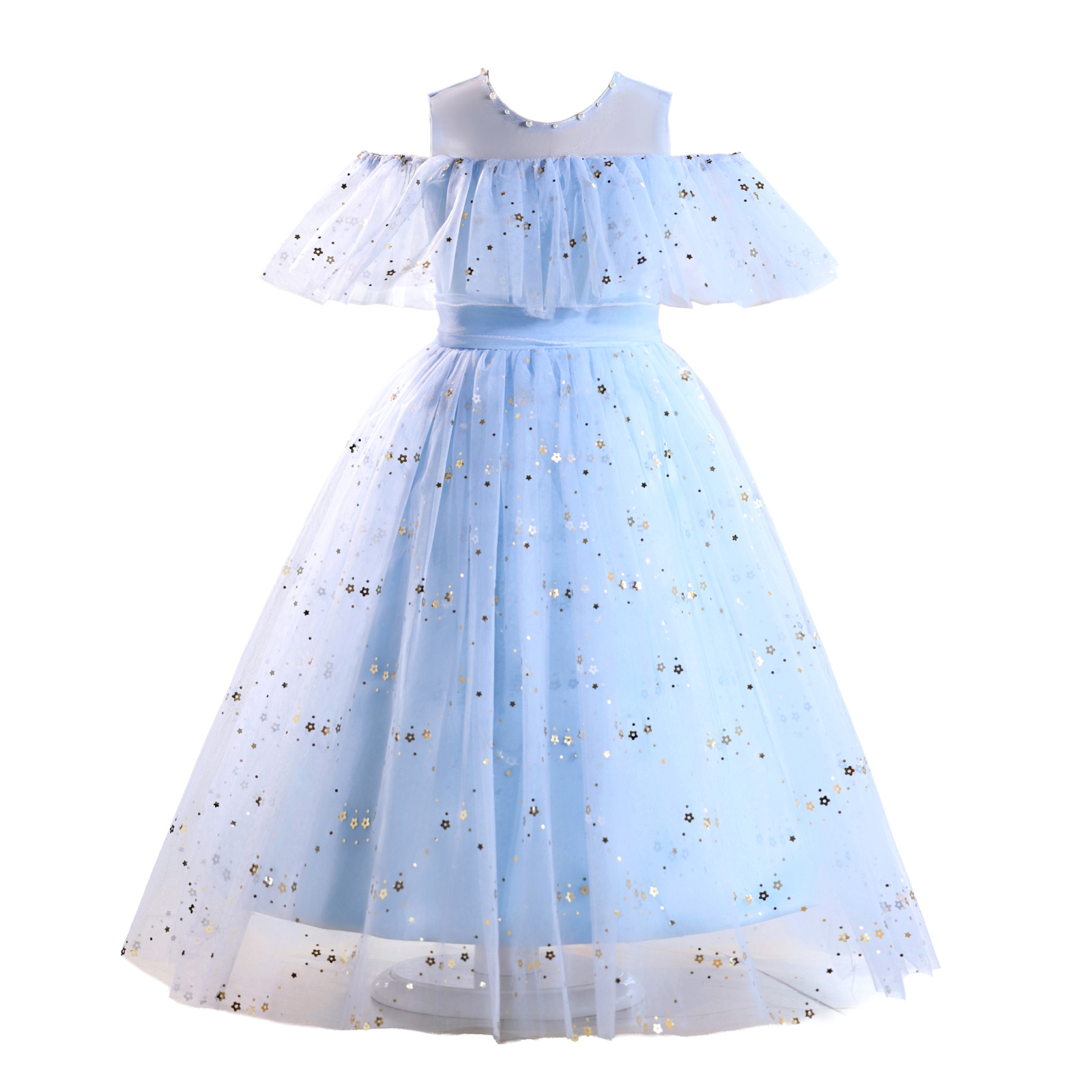 レインボーラメがきらめくチュール素材のスカートに、オフショルダーの肩開きデザインを取り入れた華やかドレス。星柄スパンコールが光を受けて美しく輝き、動きに合わせて存在感がアップ。首元には縫い付けパールを施し、上品で繊細な印象に。選べる16色のカラーバリエーションで、個性やシーンに合わせたスタイリングが楽しめます。