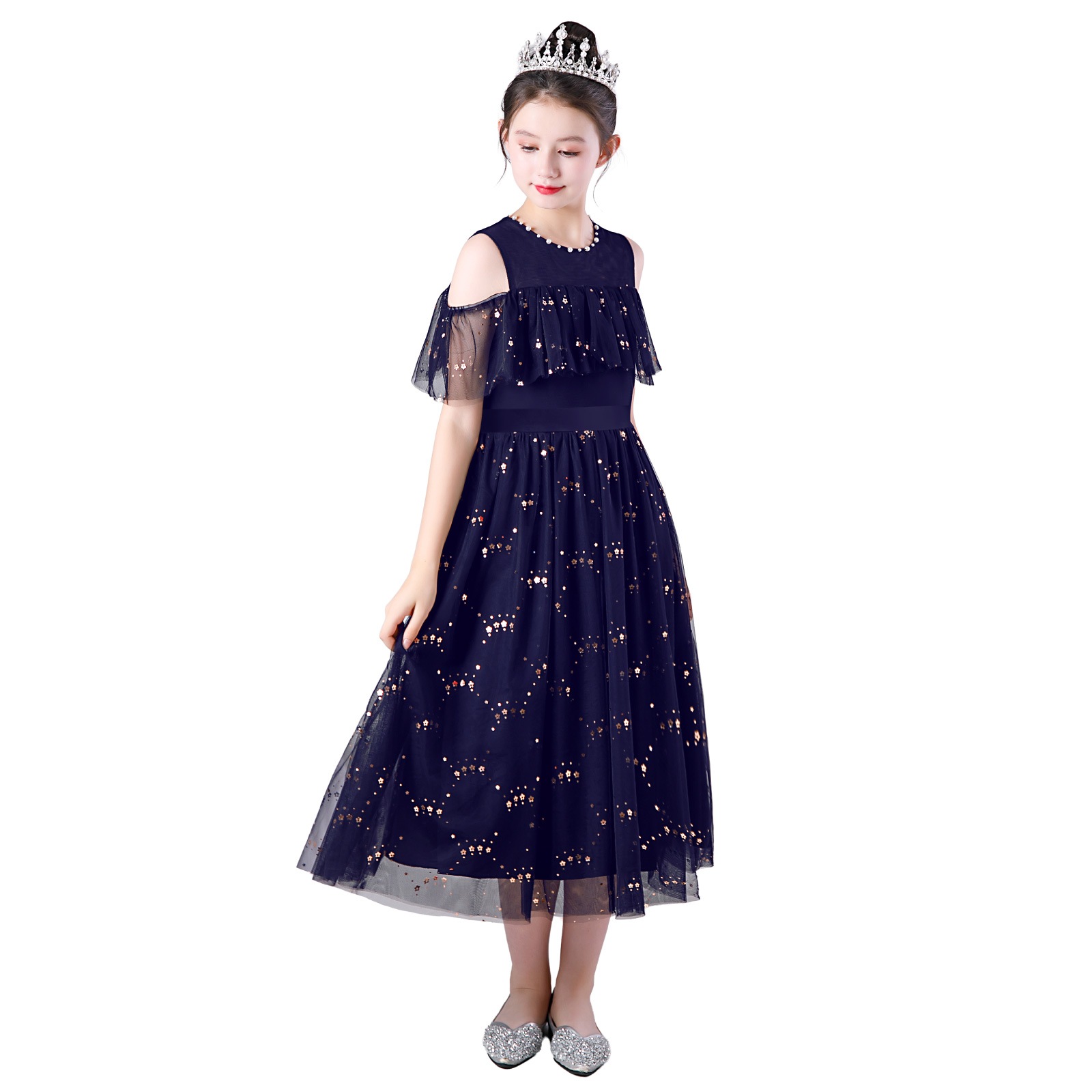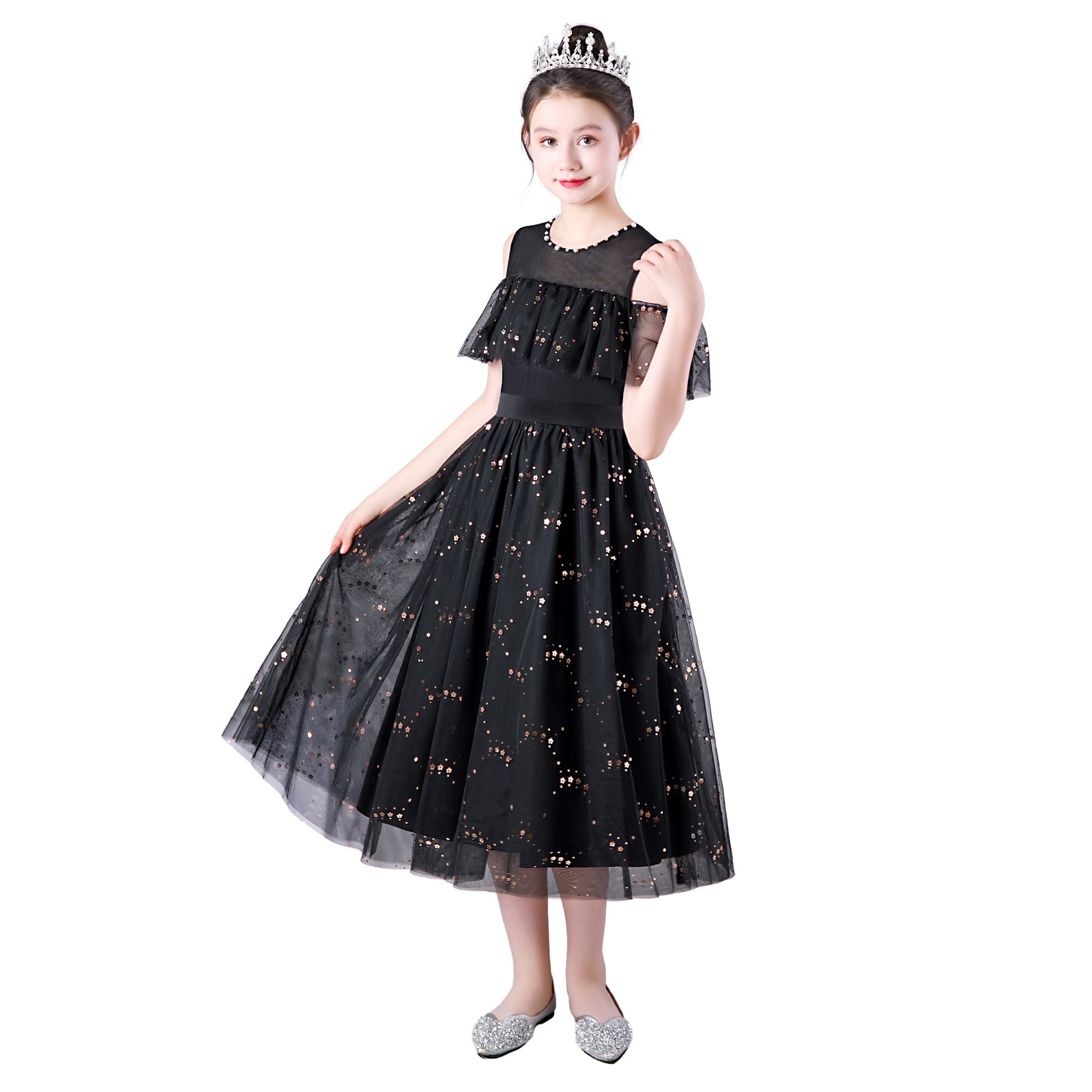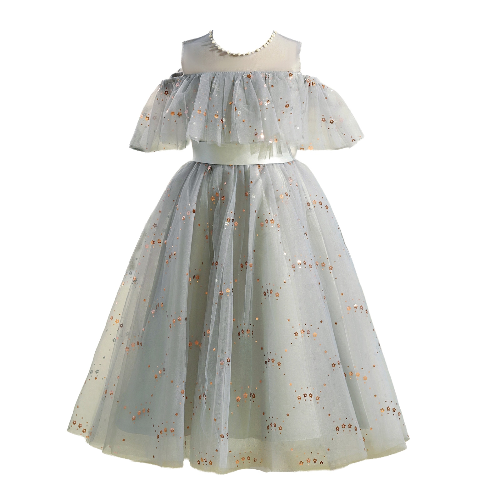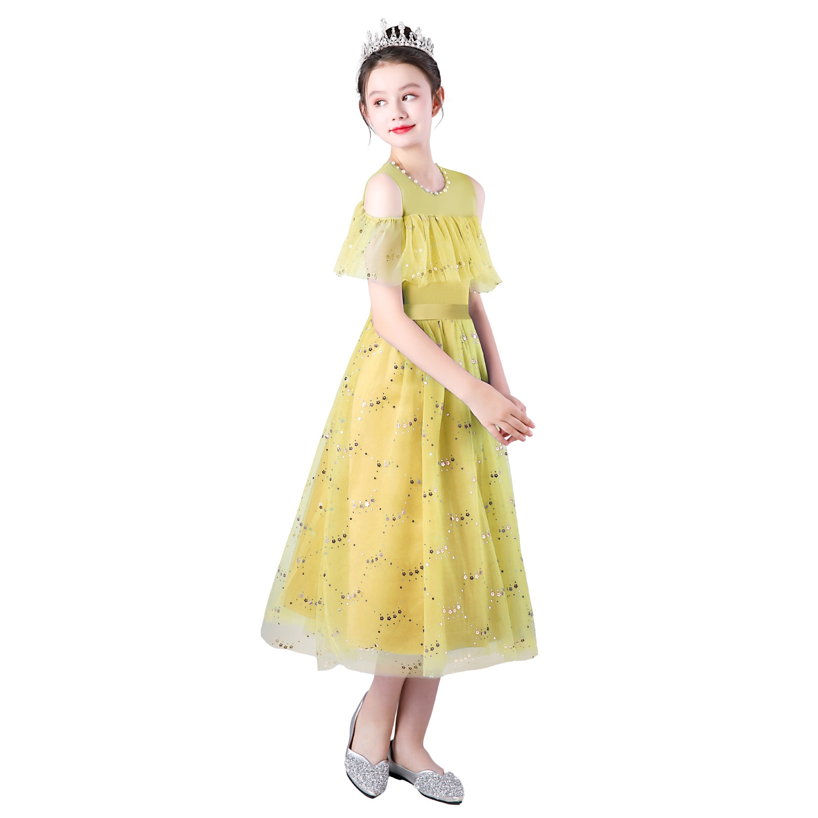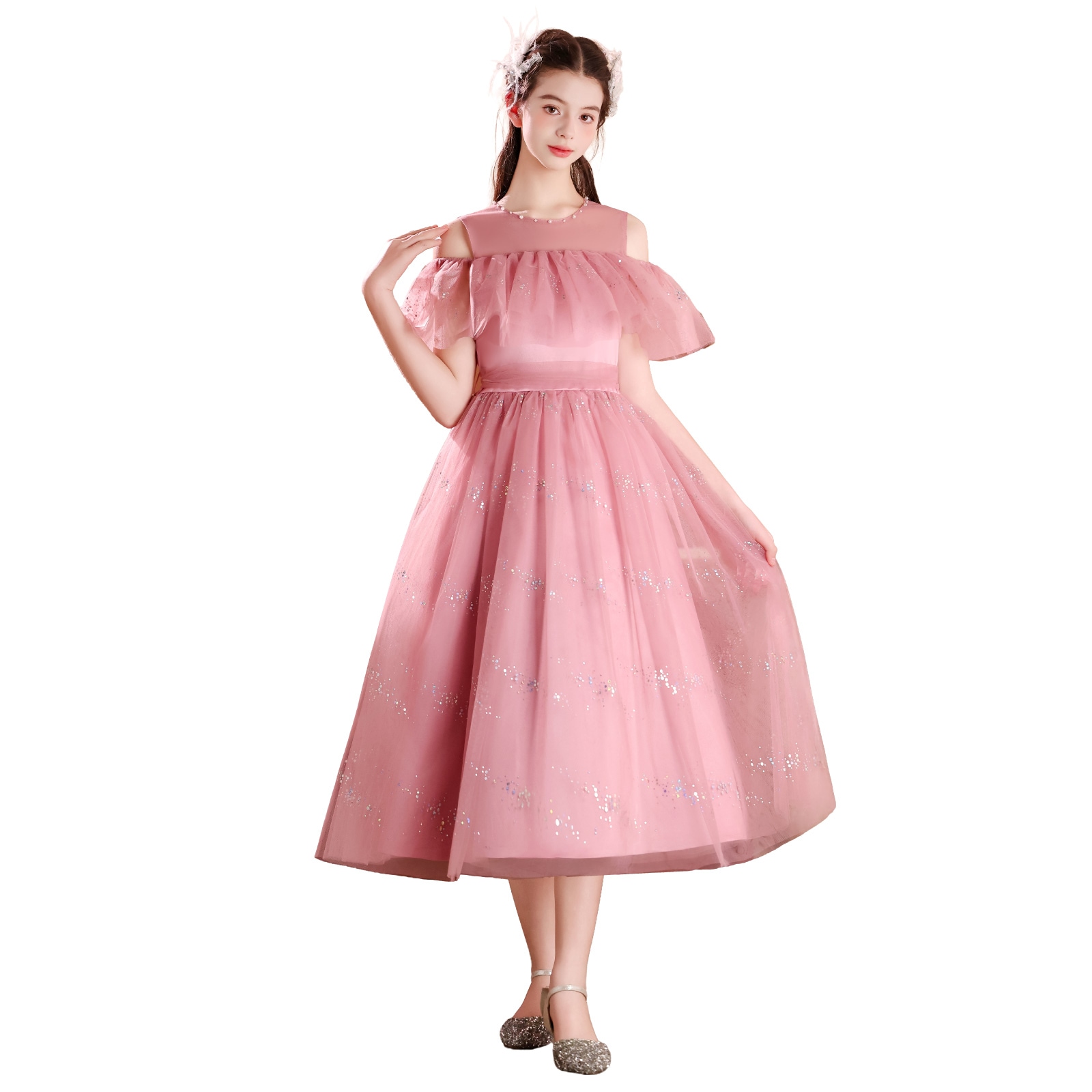 レインボーラメがきらめくチュール素材のスカートに、オフショルダーの肩開きデザインを取り入れた華やかドレス。星柄スパンコールが光を受けて美しく輝き、動きに合わせて存在感がアップ。首元には縫い付けパールを施し、上品で繊細な印象に。選べる16色のカラーバリエーションで、個性やシーンに合わせたスタイリングが楽しめます。
