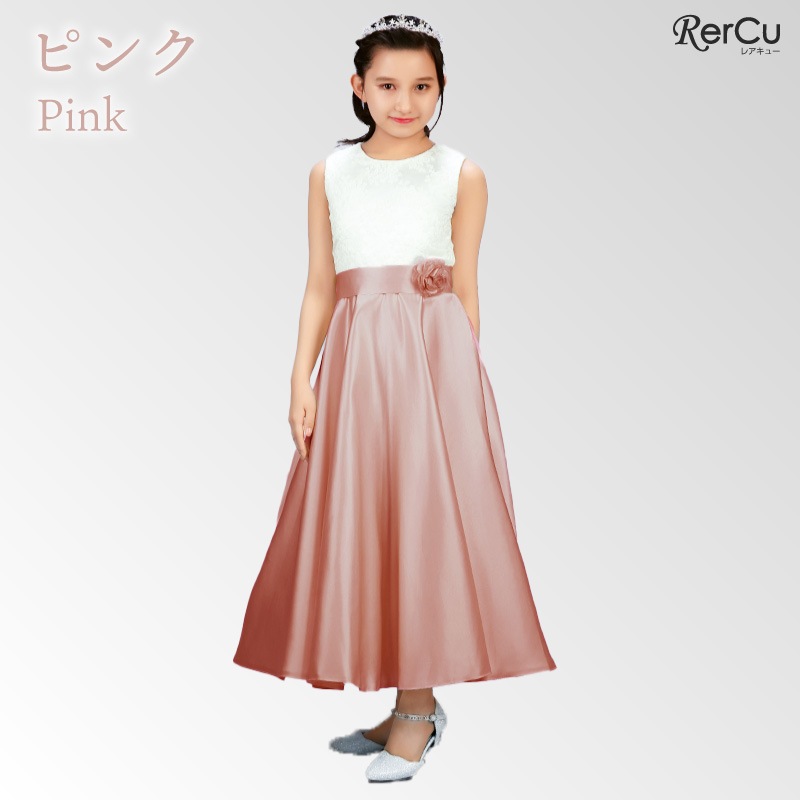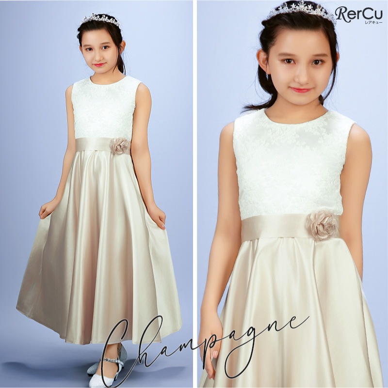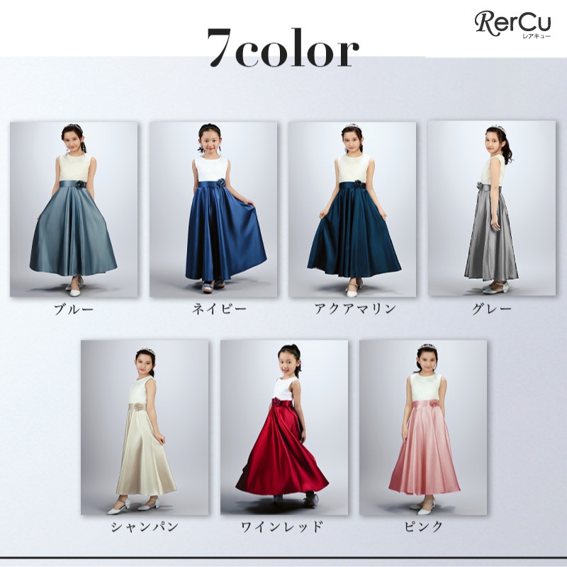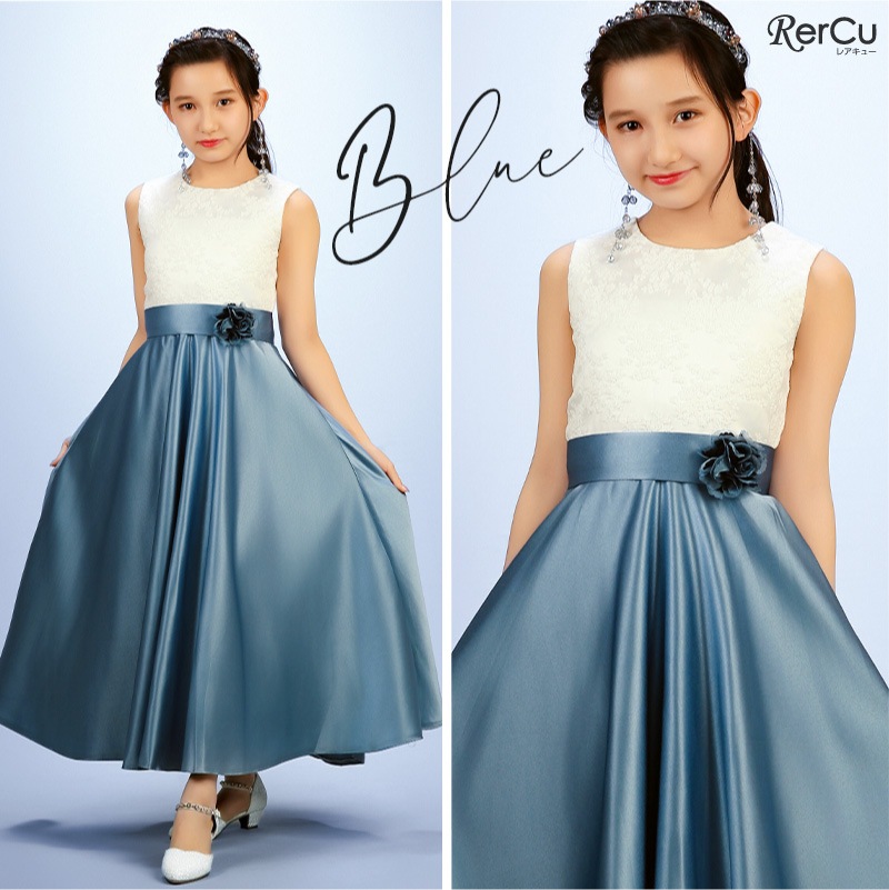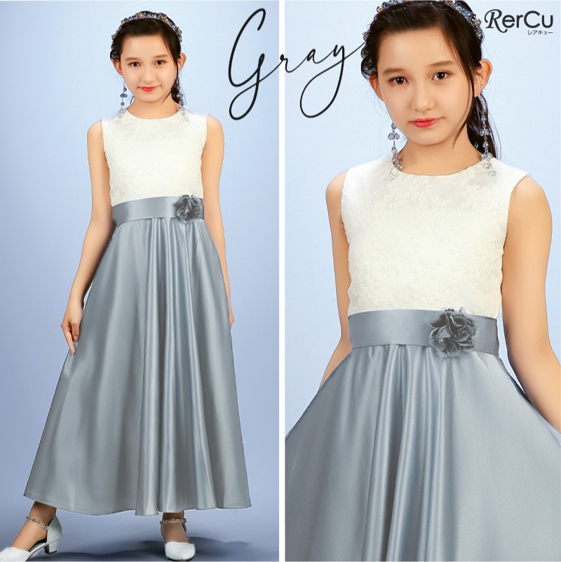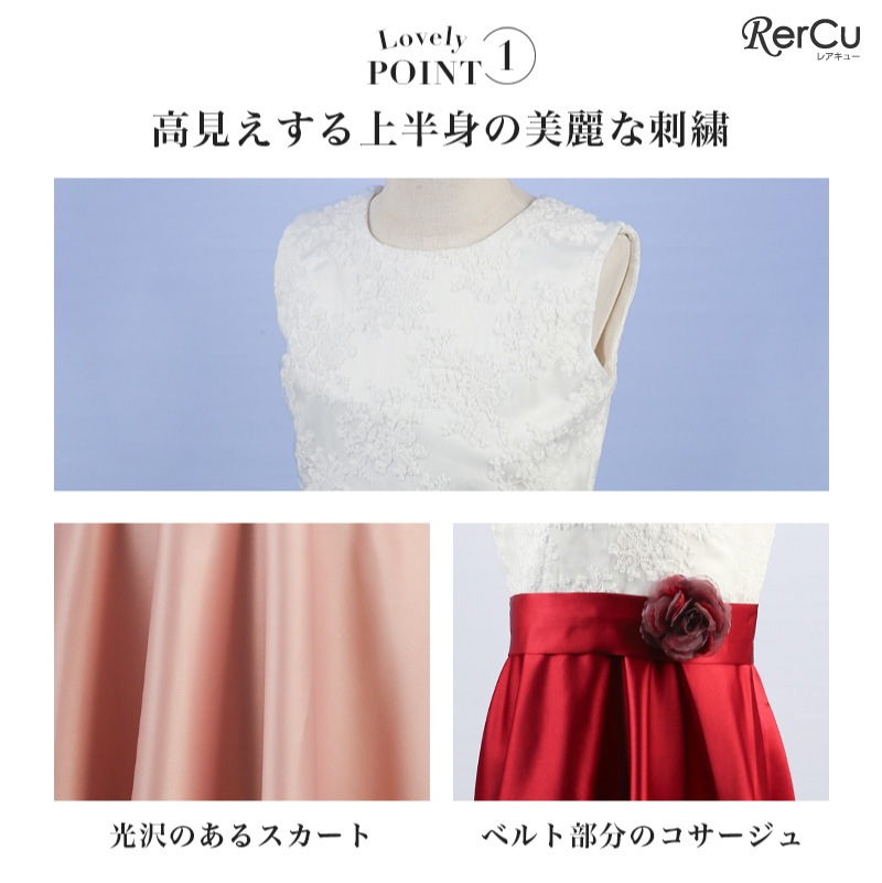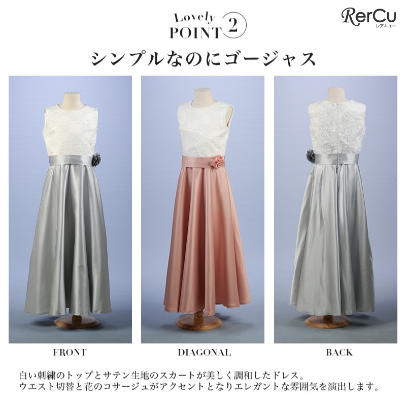 胸元には繊細な刺繍が施され、スカート部分は上質な光沢感を放つサテン生地で仕立てた華やかなロング丈ドレス。ウエストには同色のリボンと花のコサージュをあしらい、可憐な印象をプラスします。背中まで美しく見えるすっきりとしたシルエットで、写真映えも抜群の一着です。