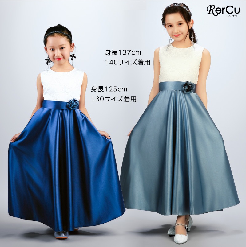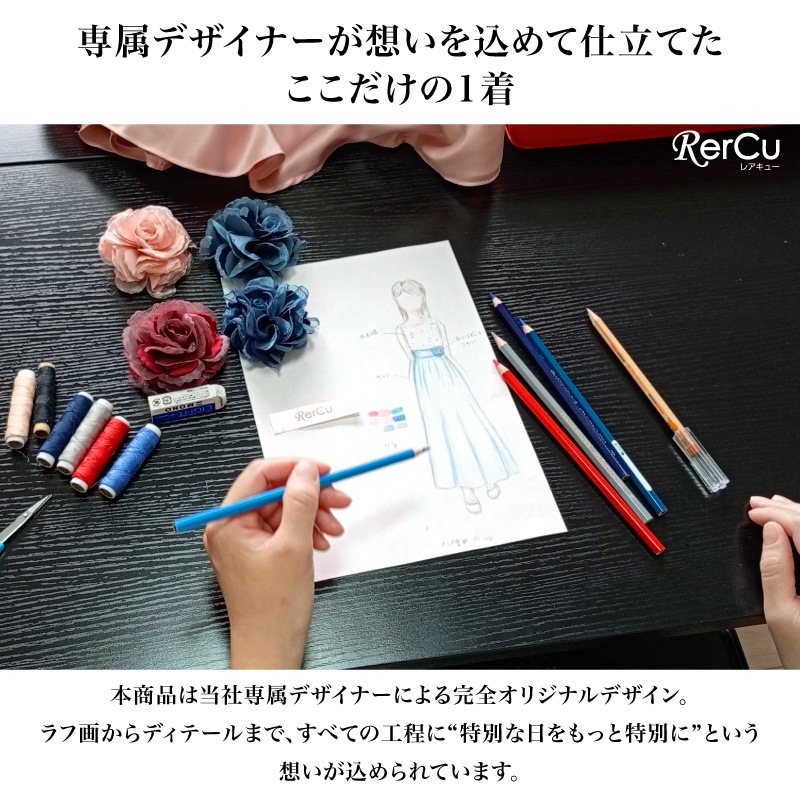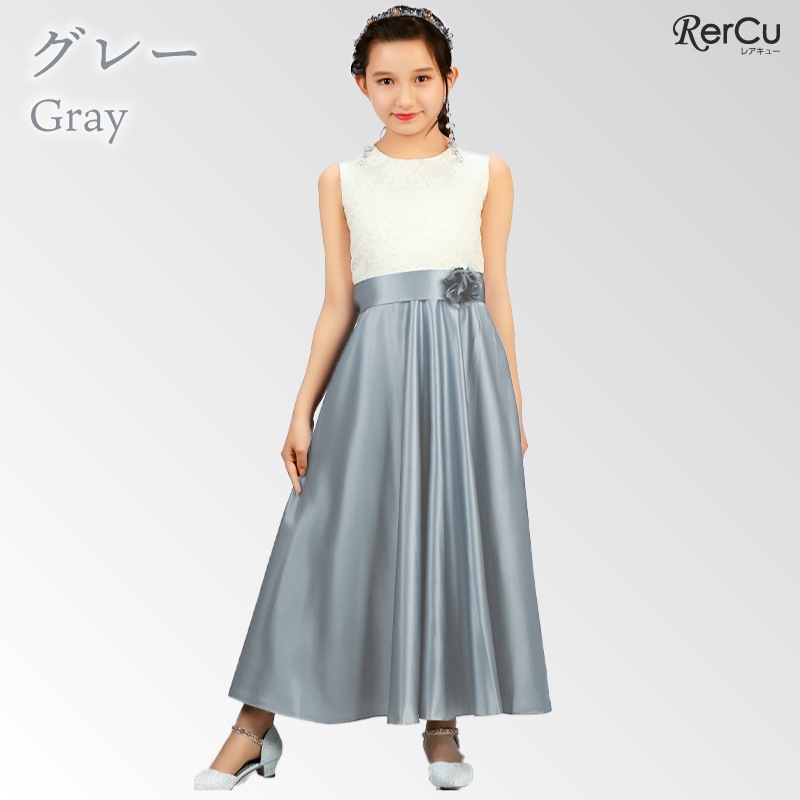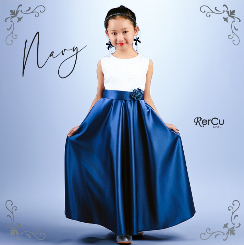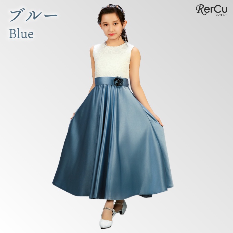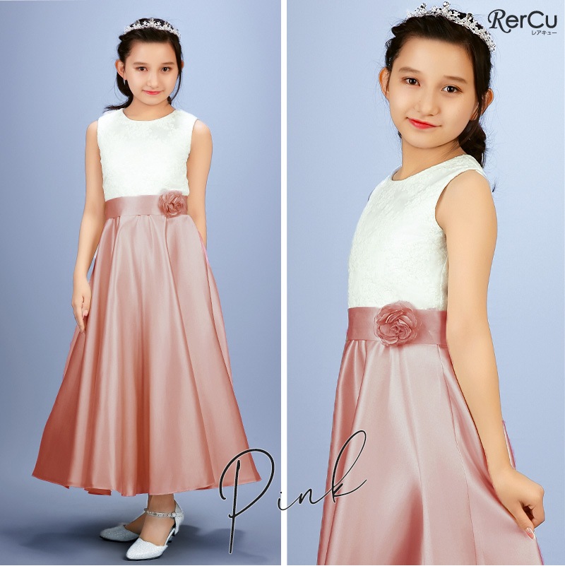 胸元には繊細な刺繍が施され、スカート部分は上質な光沢感を放つサテン生地で仕立てた華やかなロング丈ドレス。ウエストには同色のリボンと花のコサージュをあしらい、可憐な印象をプラスします。背中まで美しく見えるすっきりとしたシルエットで、写真映えも抜群の一着です。