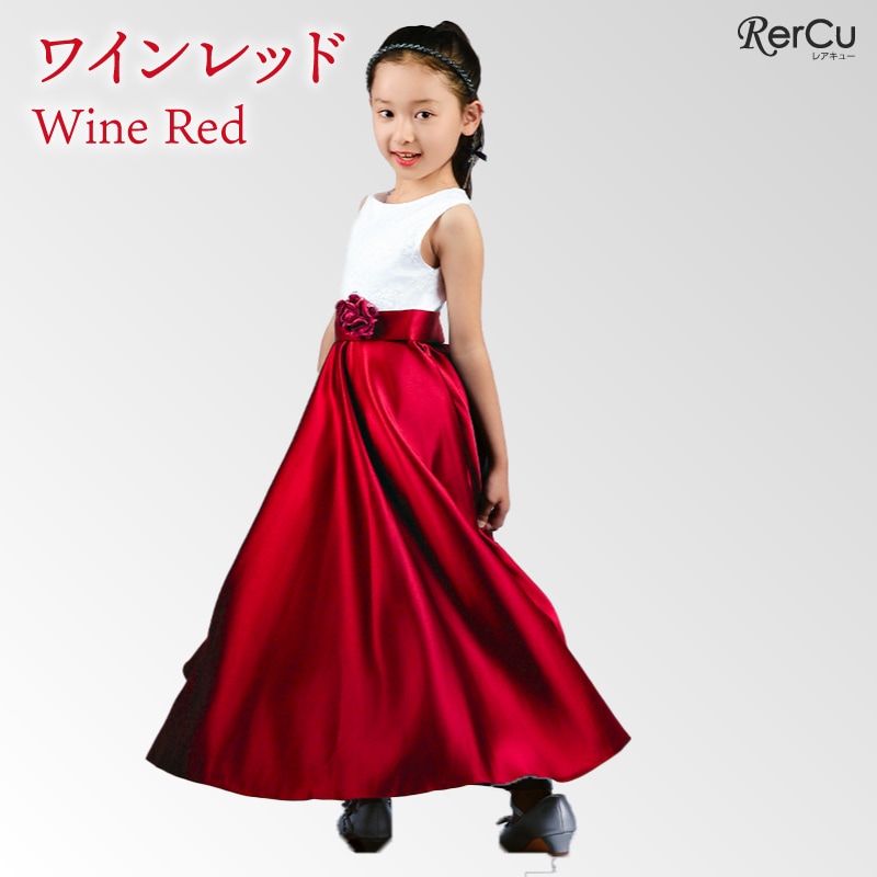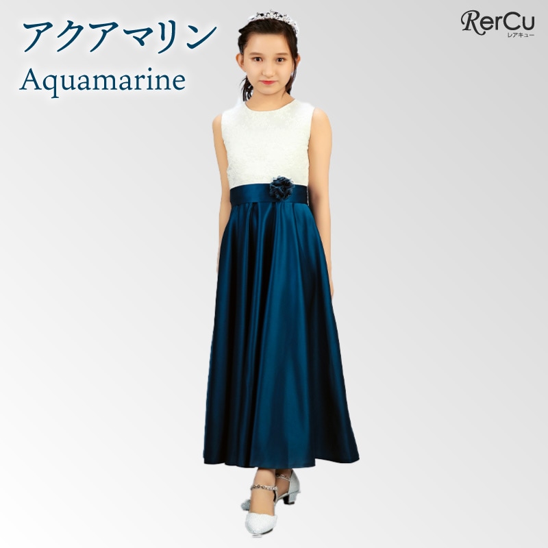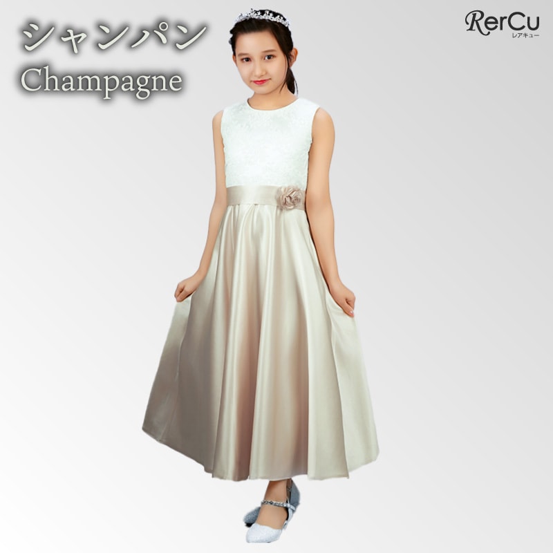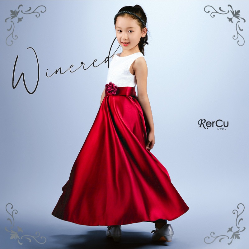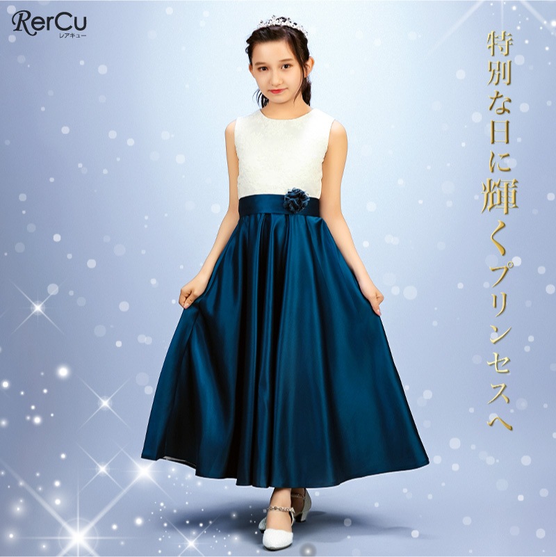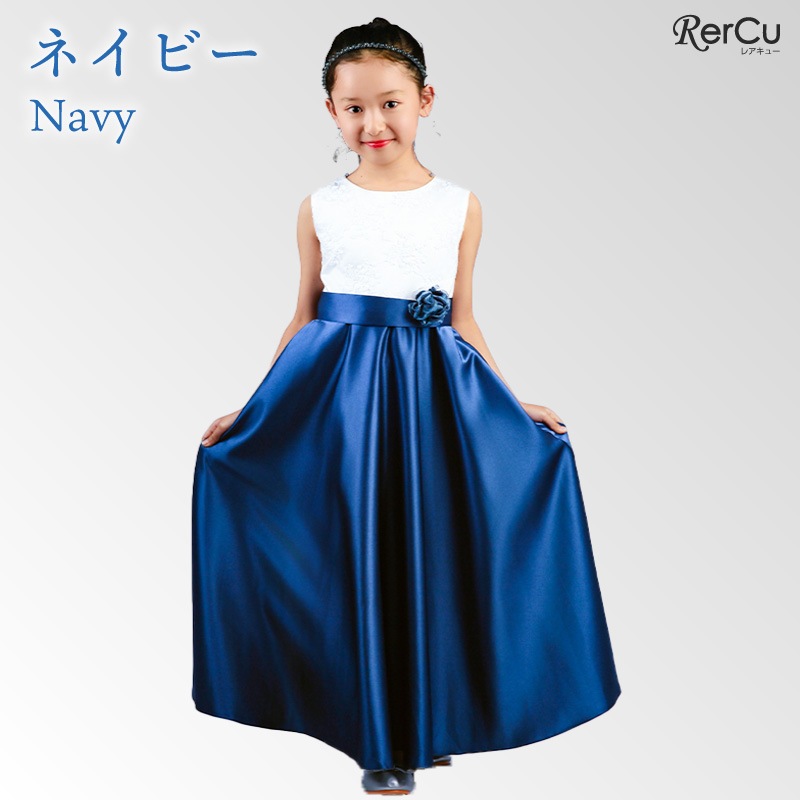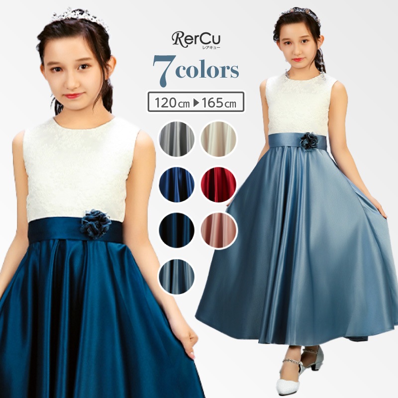 胸元には繊細な刺繍が施され、スカート部分は上質な光沢感を放つサテン生地で仕立てた華やかなロング丈ドレス。ウエストには同色のリボンと花のコサージュをあしらい、可憐な印象をプラスします。背中まで美しく見えるすっきりとしたシルエットで、写真映えも抜群の一着です。