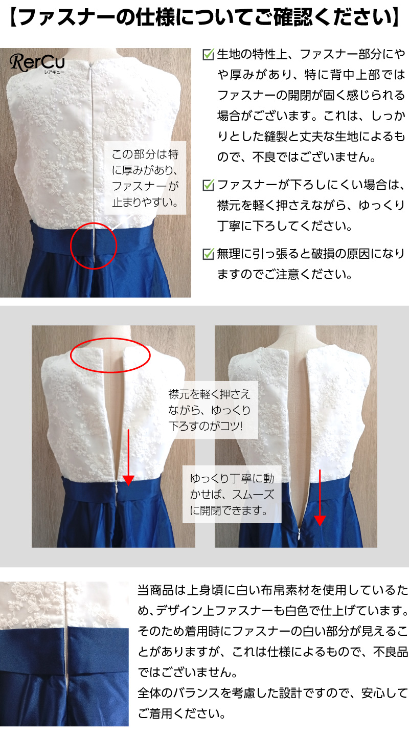 チクチクしにくいレース調の上身頃と、なめらかで肌当たりの良い裏地付きのサテン風生地を採用。透けにくく安心して着用でき、背中ファスナー仕様で着脱もスムーズ。長時間の着用でも快適な仕上がりです。