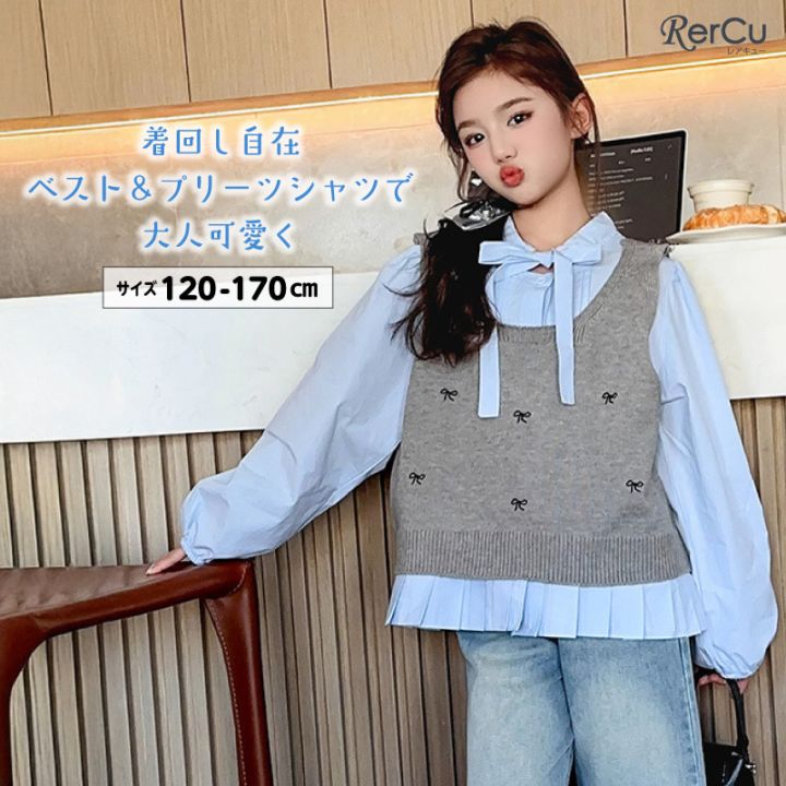 こども服 上着 長袖 リボン柄ベスト&プリーツブラウス2点セット シャツ ベスト 子供服 アウター キッズ ジュニア