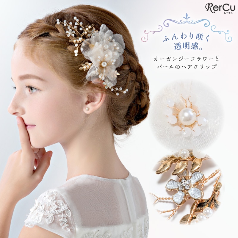 RerCu ヘアアクセサリー 発表会 入学式 ヘアクリップ 女の子 オーガンジー フラワー パール ゴールド 髪飾り 発表会 結婚式 イベント パーティー 記念写真 写真撮影 キッズ ドレス小物