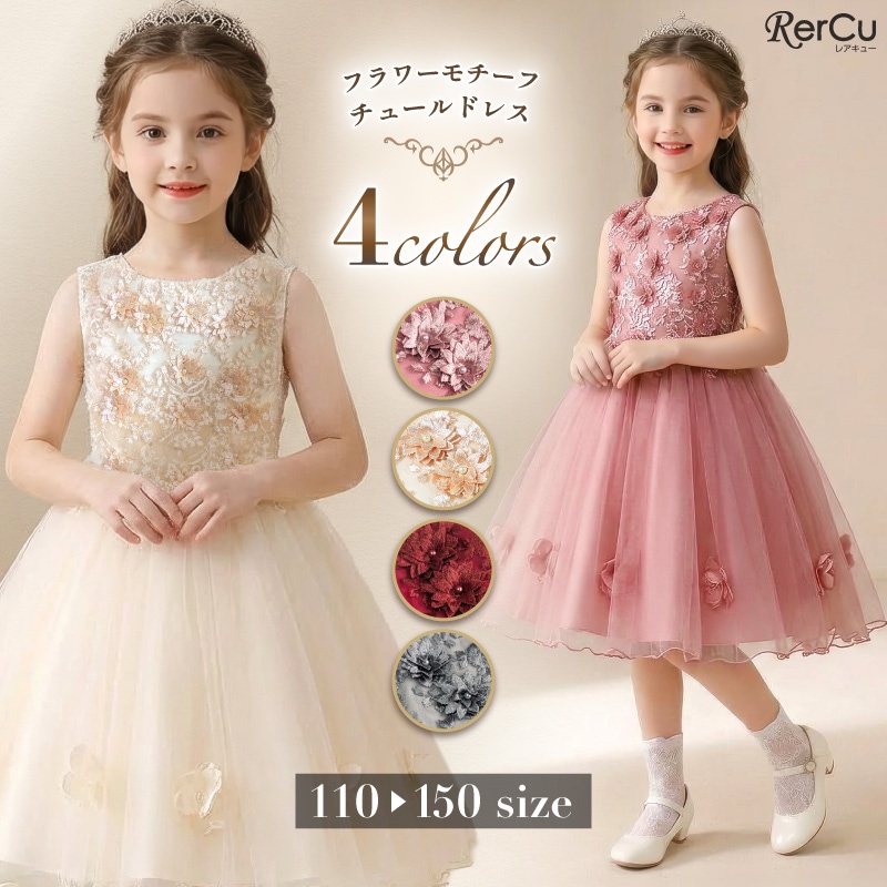 RerCu 子供ドレス フラワーモチーフ チュールスカートの華やか発表会ドレス