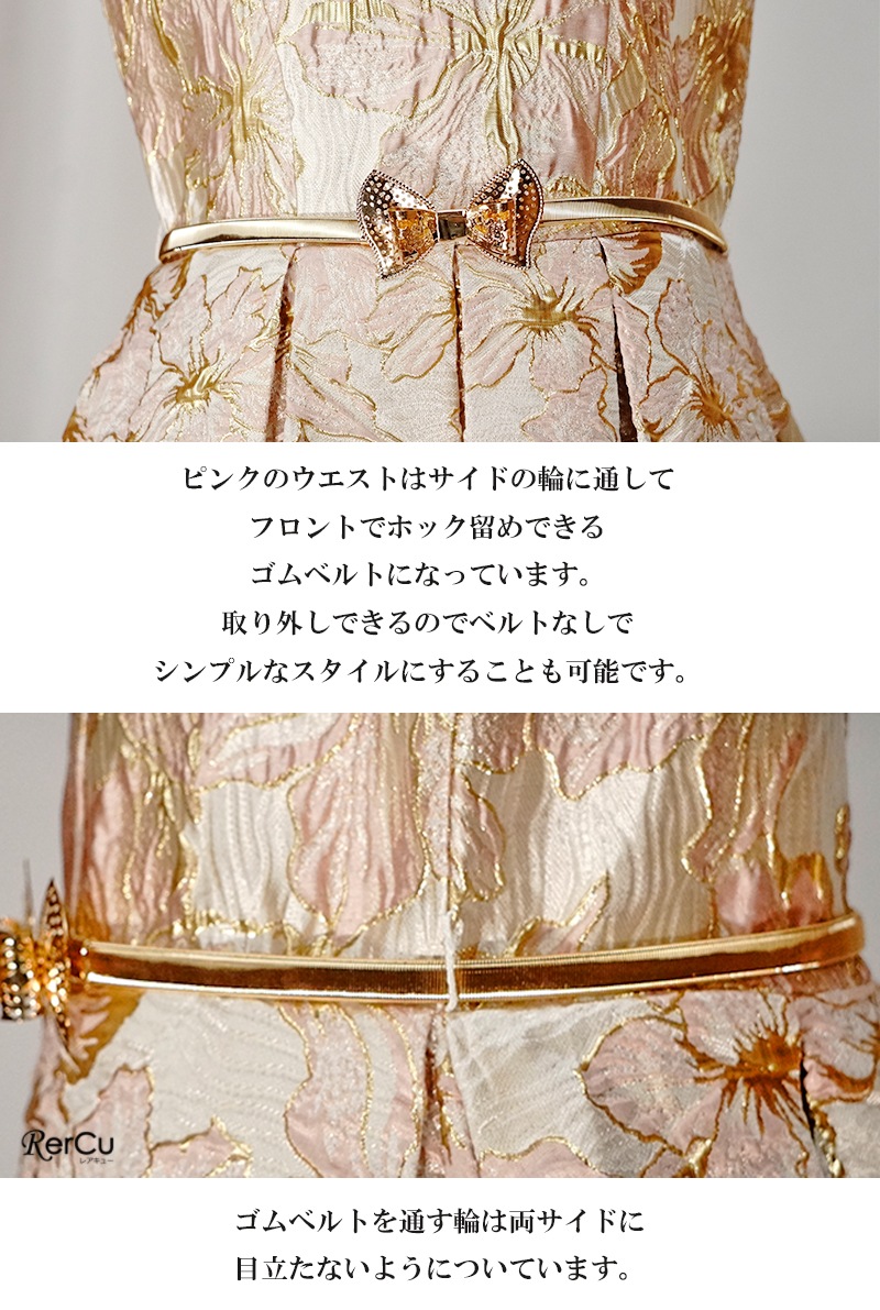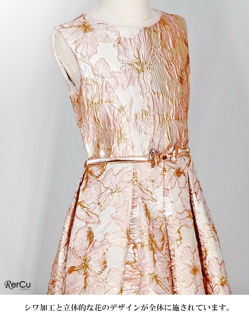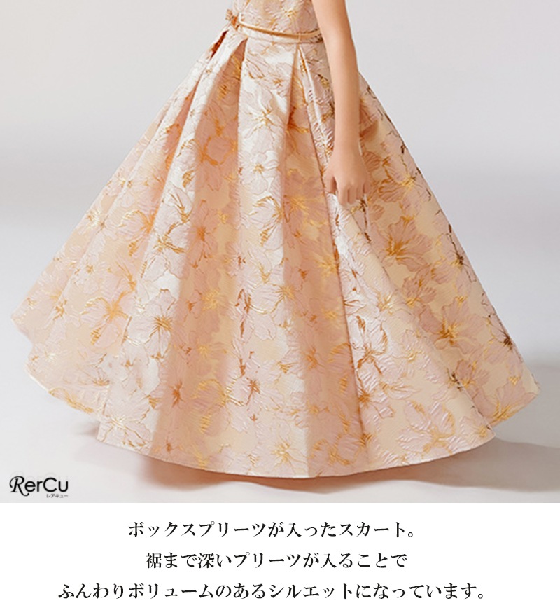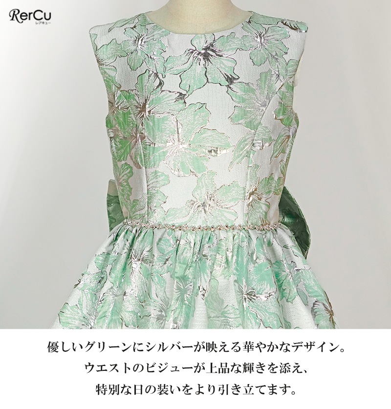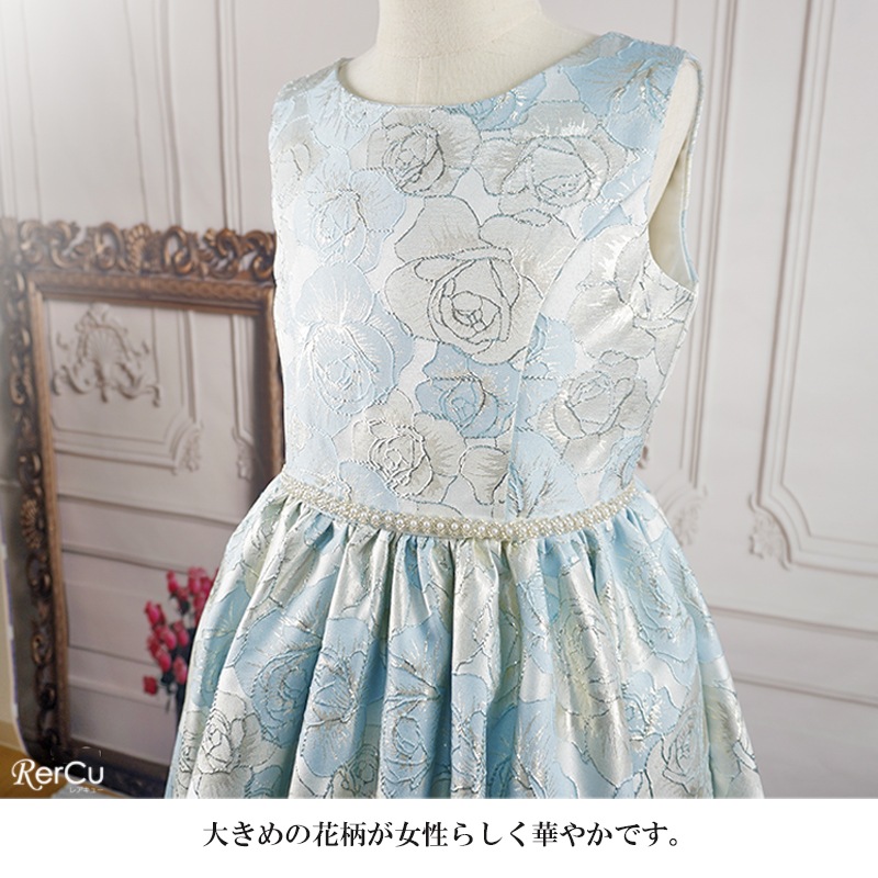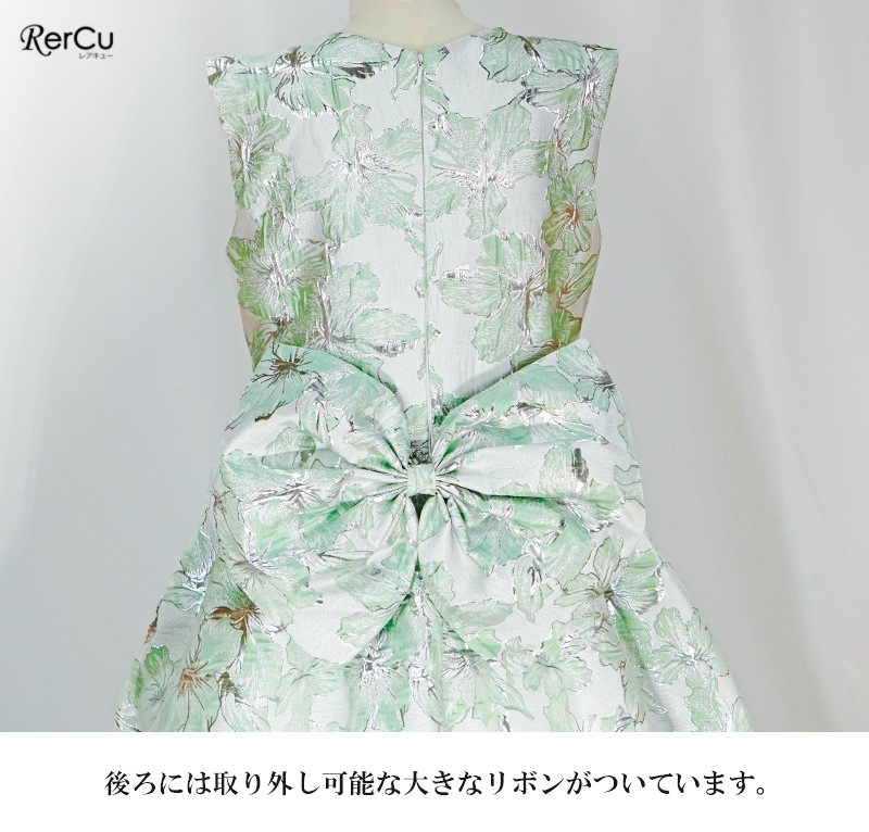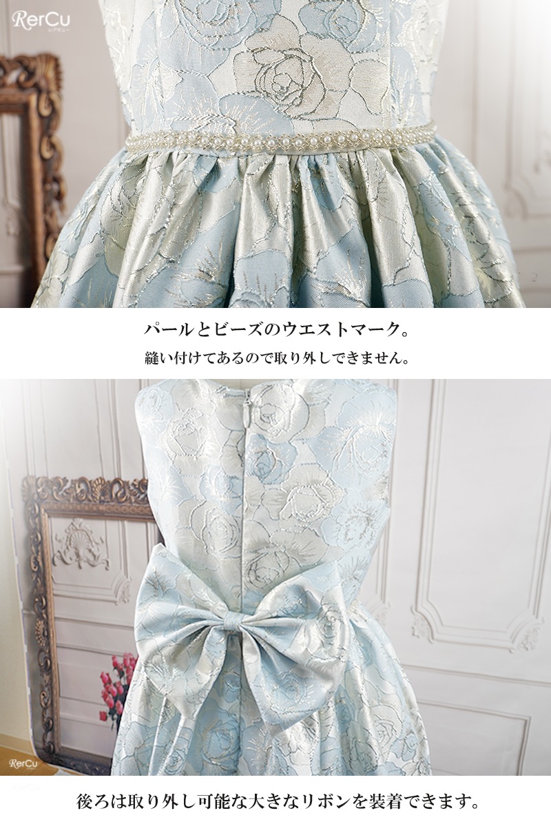 立体感のある花柄デザインを全面に施した華やかなドレス。ピンクは落ち着いたピンクとゴールドの組み合わせで優美に、ブルーは淡いブルーとシルバーの糸がきらめく上品な印象に、ミントグリーンはシルバーが映える爽やかで華やかな仕上がりに。ウエストのビジューと取り外し可能な大きなリボンが、特別感を引き立てます。