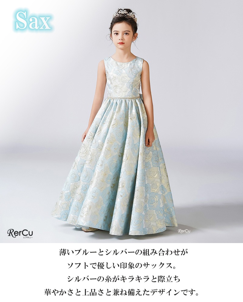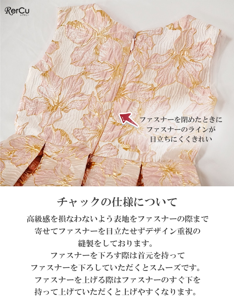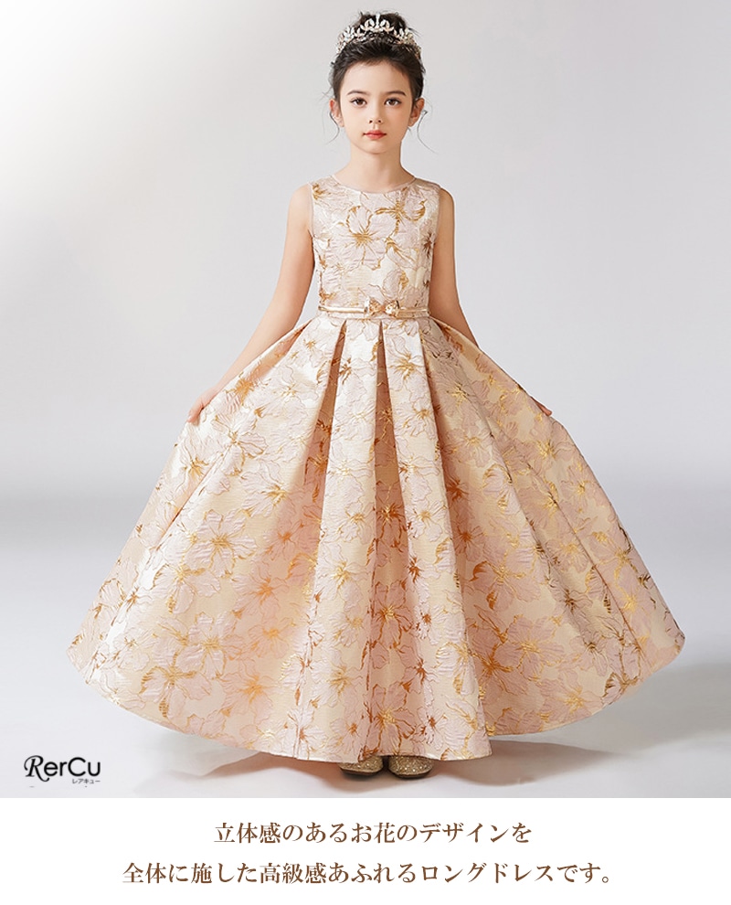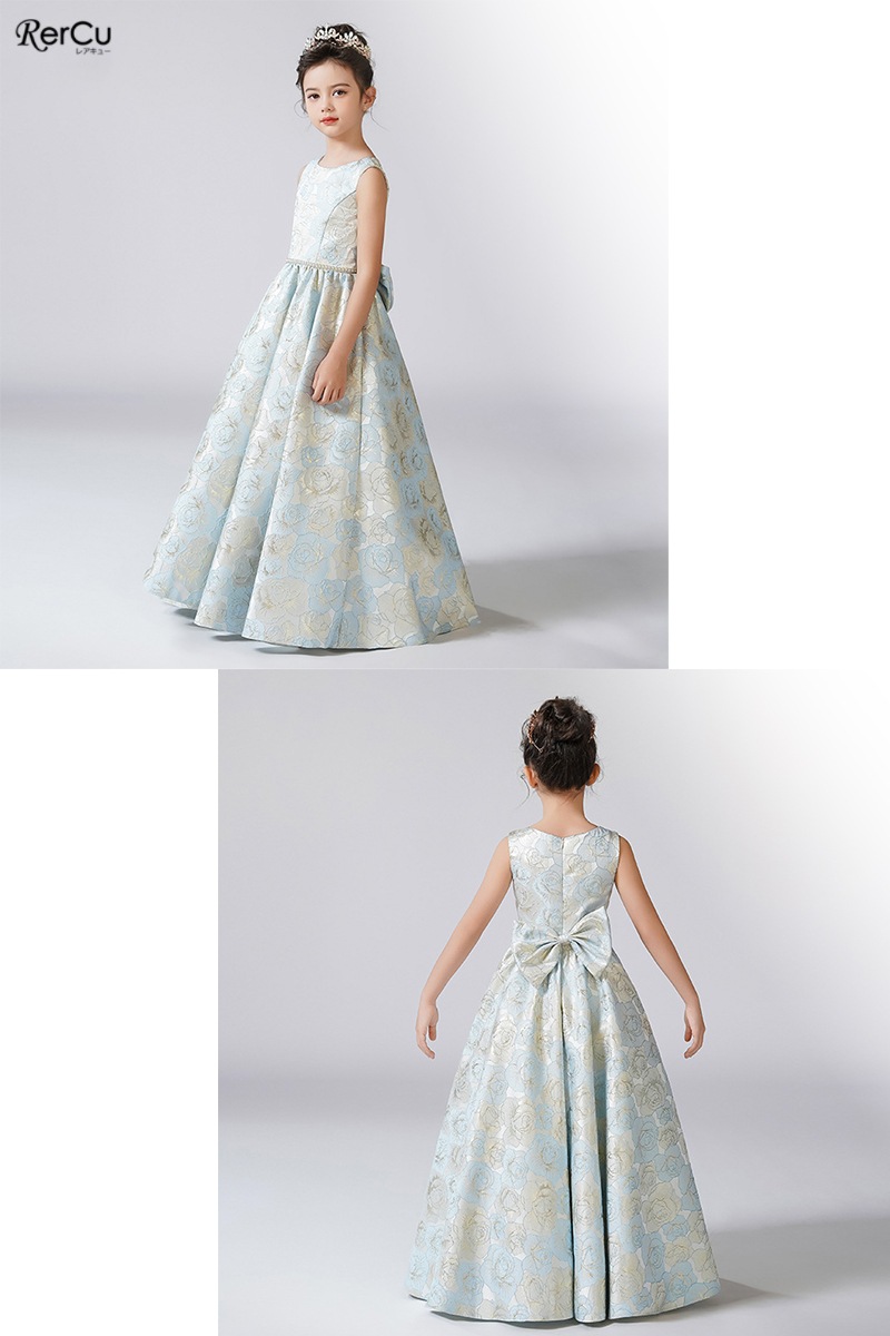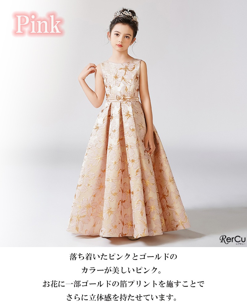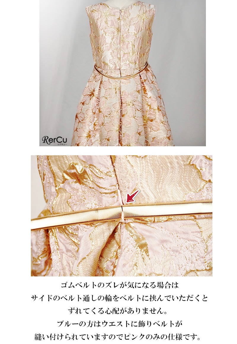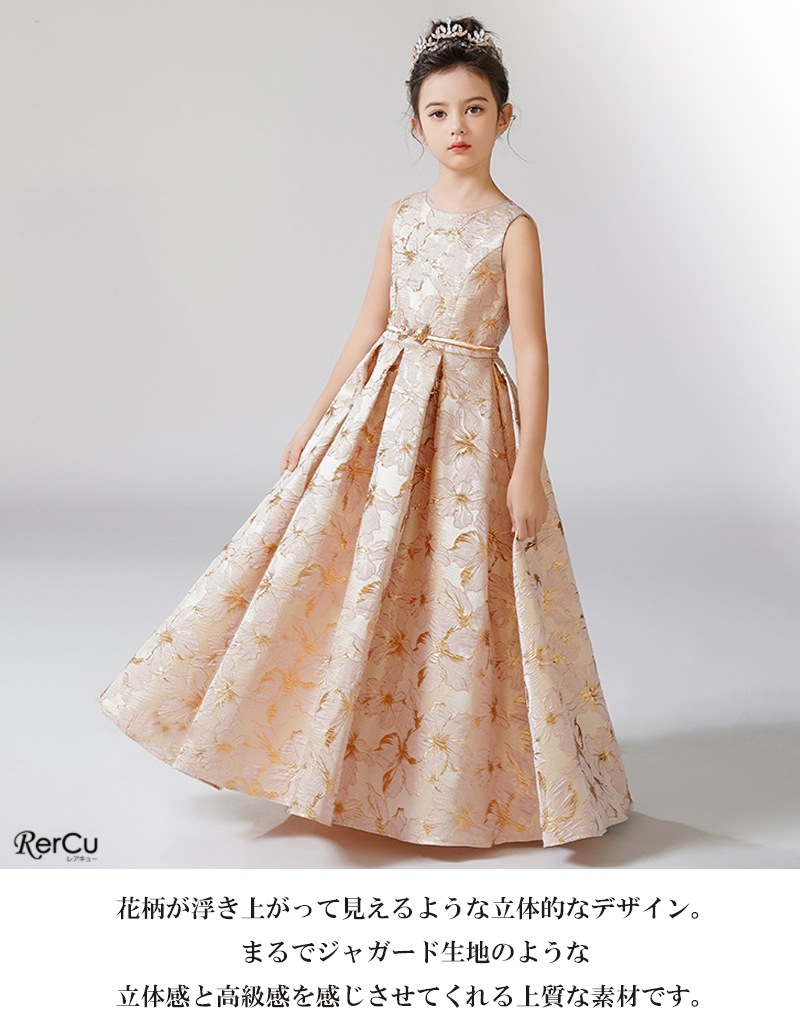 立体感のある花柄デザインを全面に施した華やかなドレス。ピンクは落ち着いたピンクとゴールドの組み合わせで優美に、ブルーは淡いブルーとシルバーの糸がきらめく上品な印象に、ミントグリーンはシルバーが映える爽やかで華やかな仕上がりに。ウエストのビジューと取り外し可能な大きなリボンが、特別感を引き立てます。