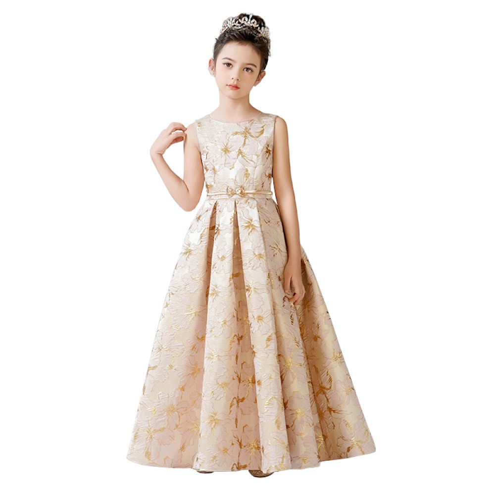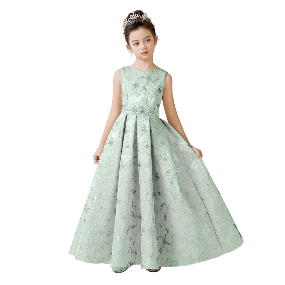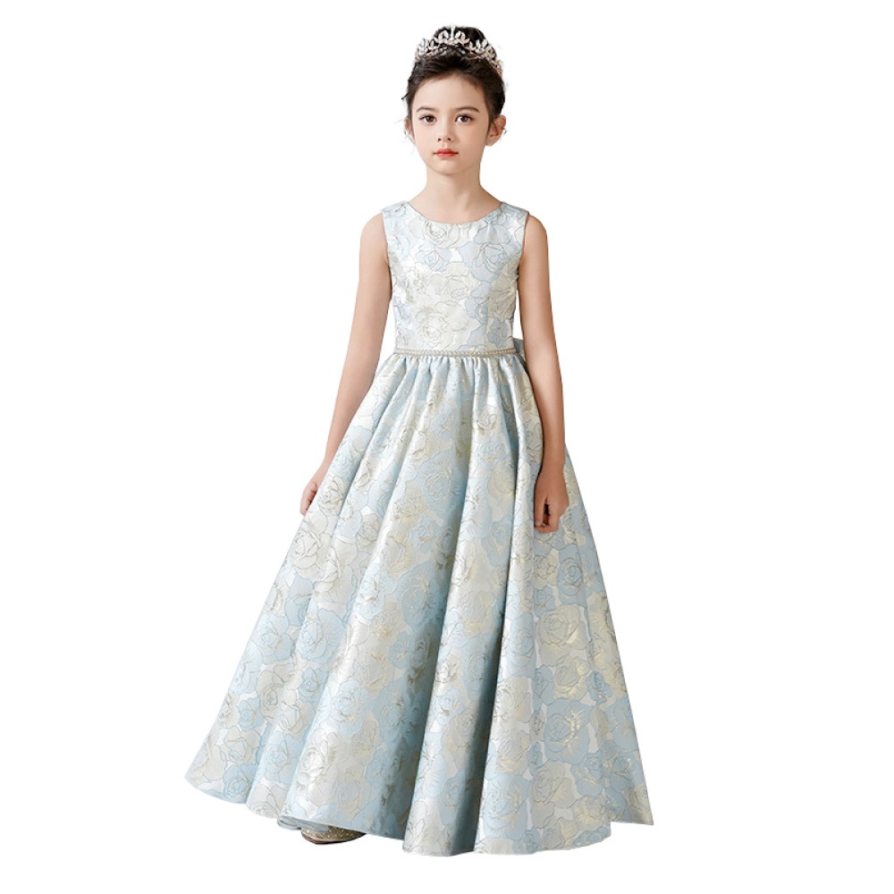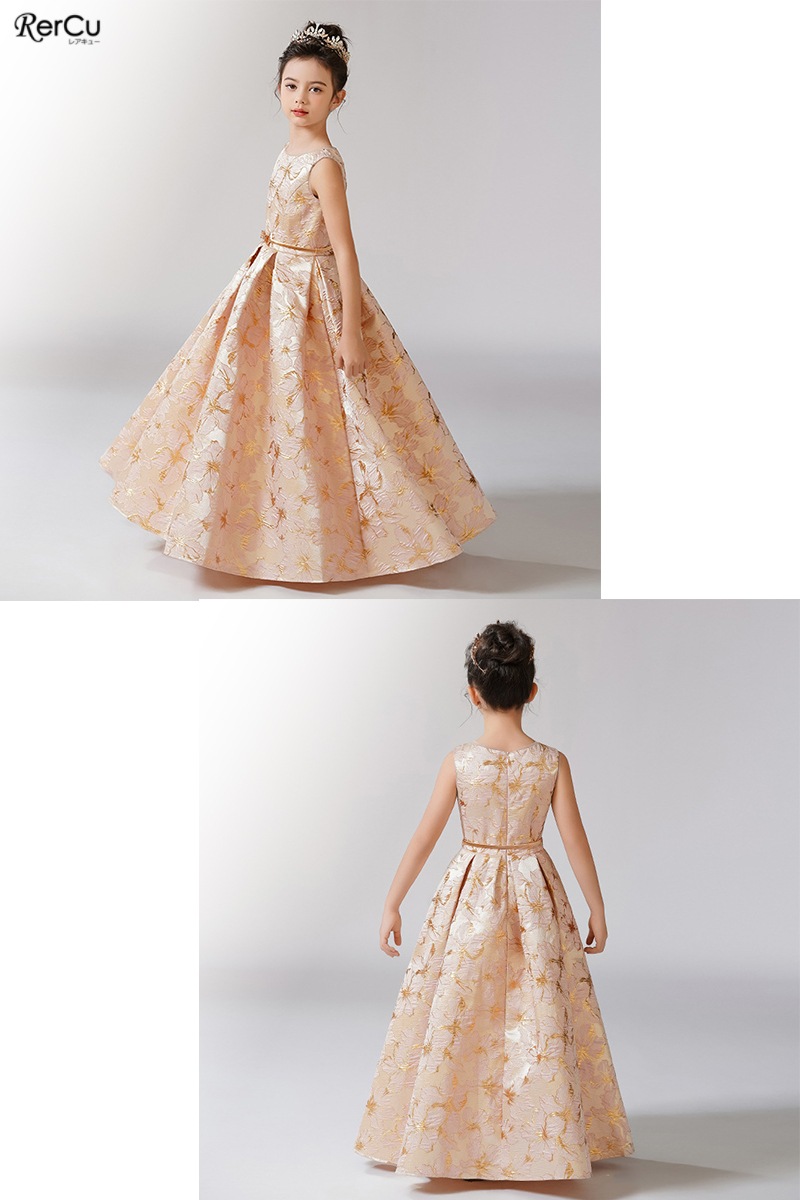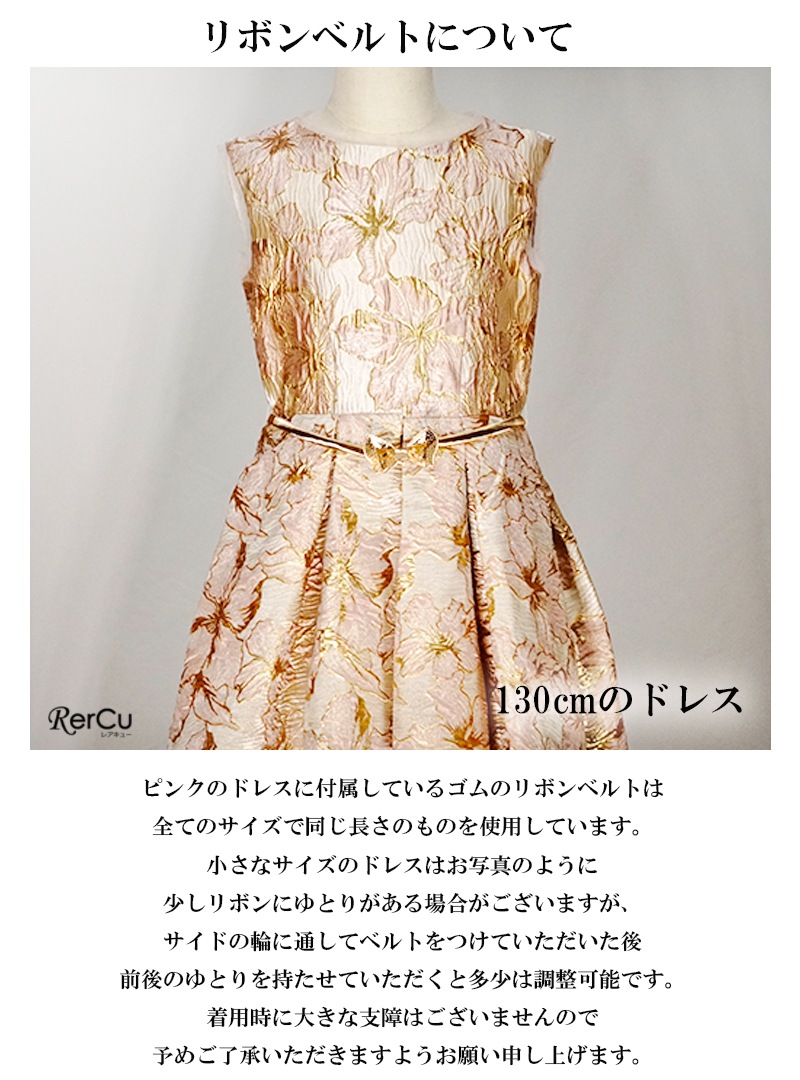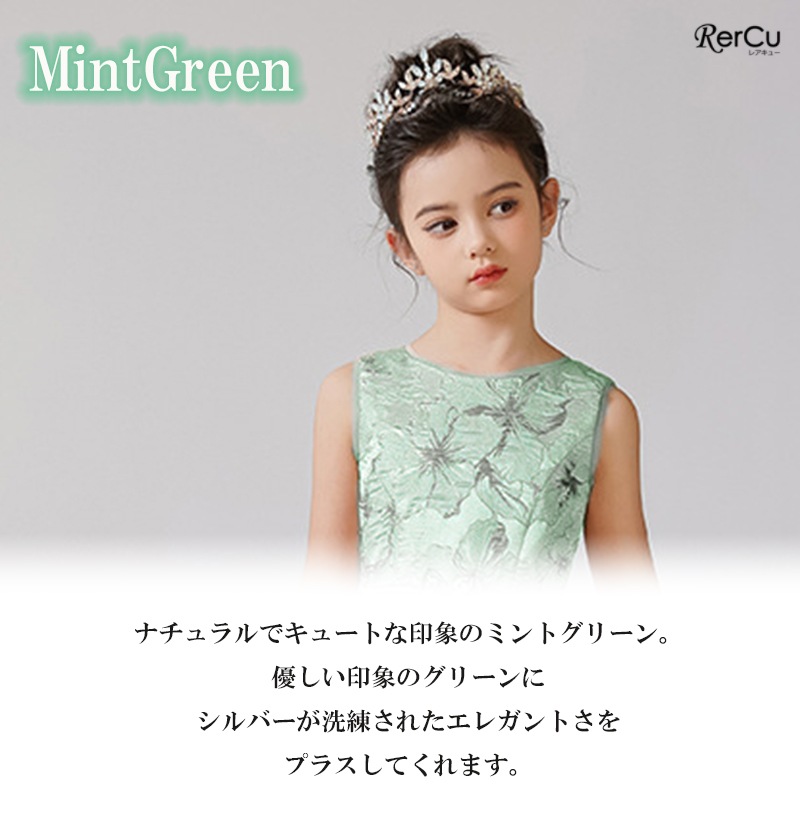 立体感のある花柄デザインを全面に施した華やかなドレス。ピンクは落ち着いたピンクとゴールドの組み合わせで優美に、ブルーは淡いブルーとシルバーの糸がきらめく上品な印象に、ミントグリーンはシルバーが映える爽やかで華やかな仕上がりに。ウエストのビジューと取り外し可能な大きなリボンが、特別感を引き立てます。
