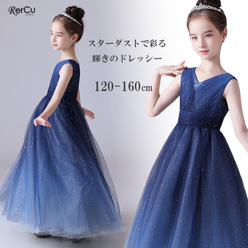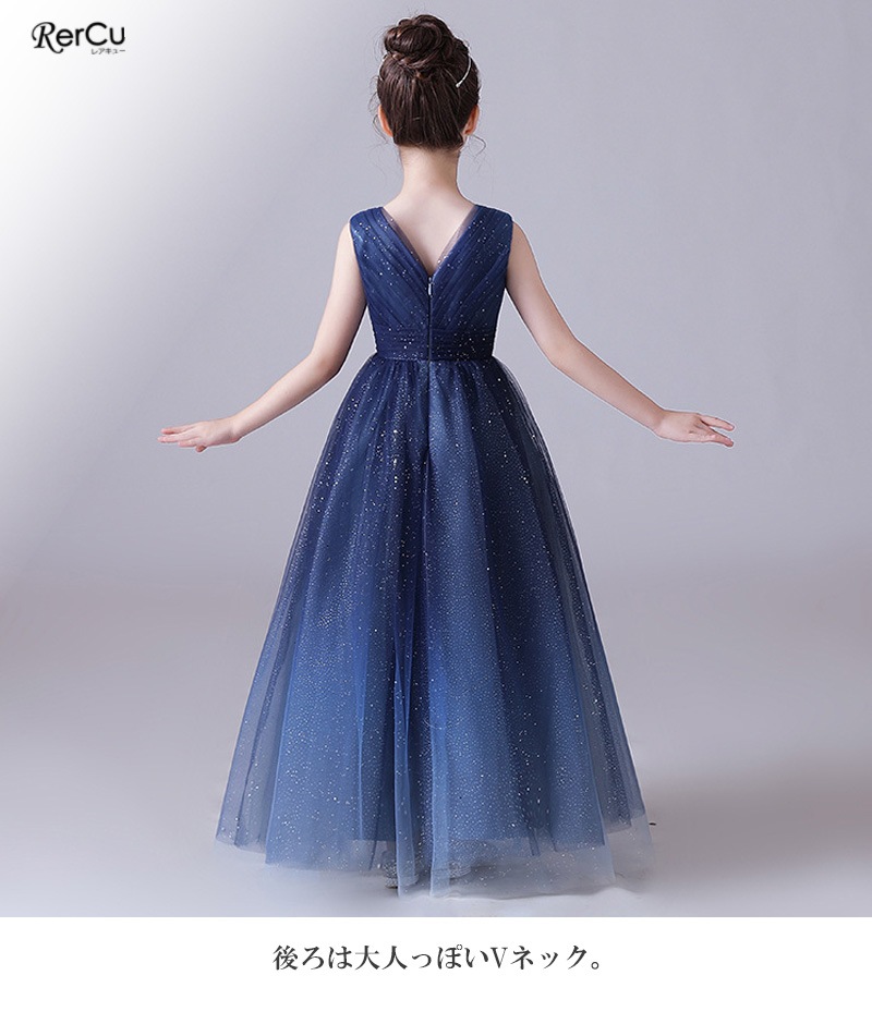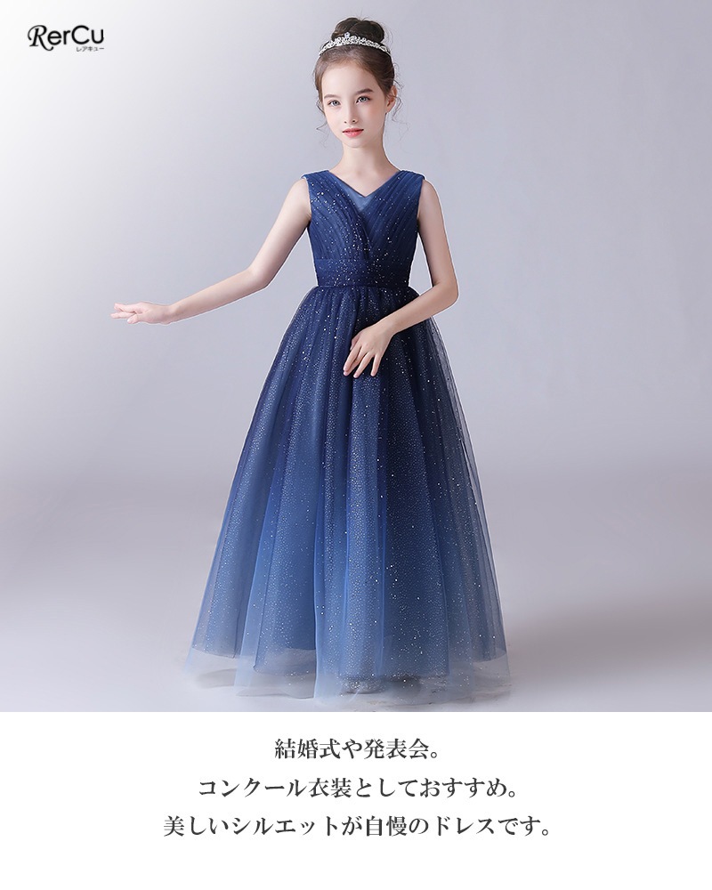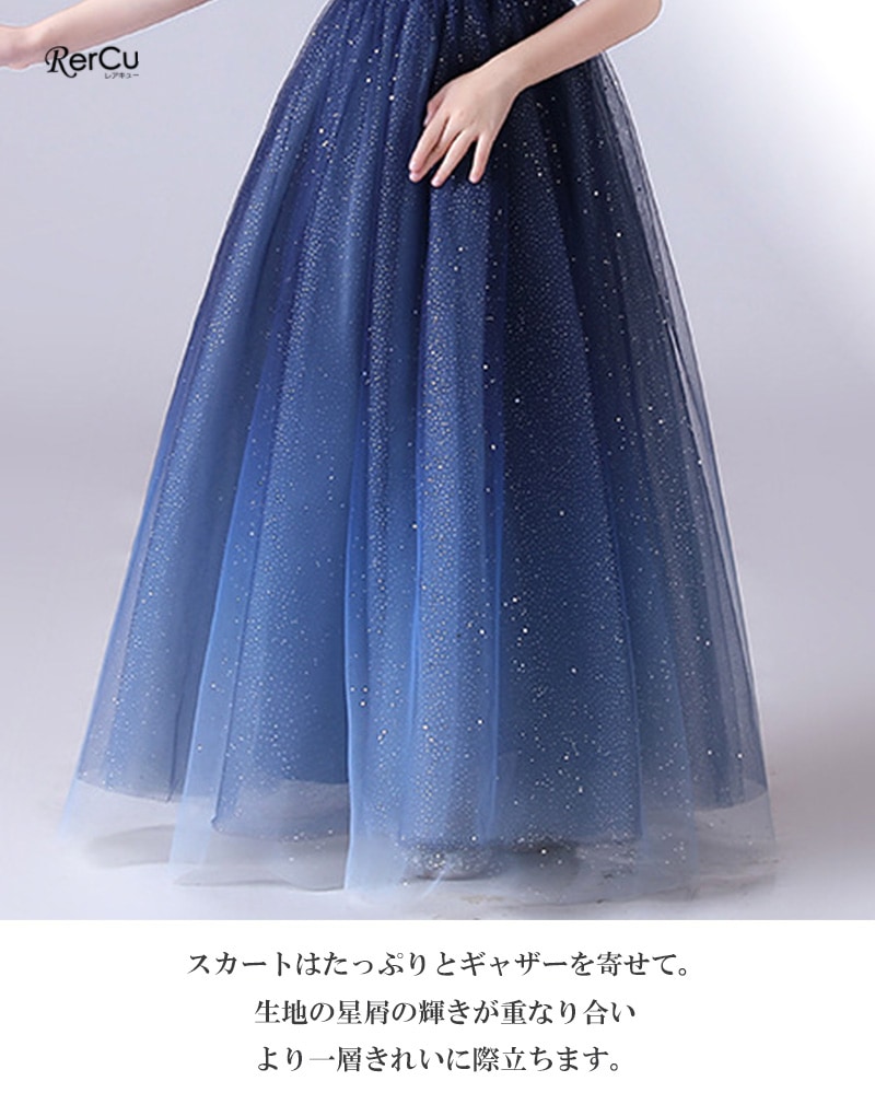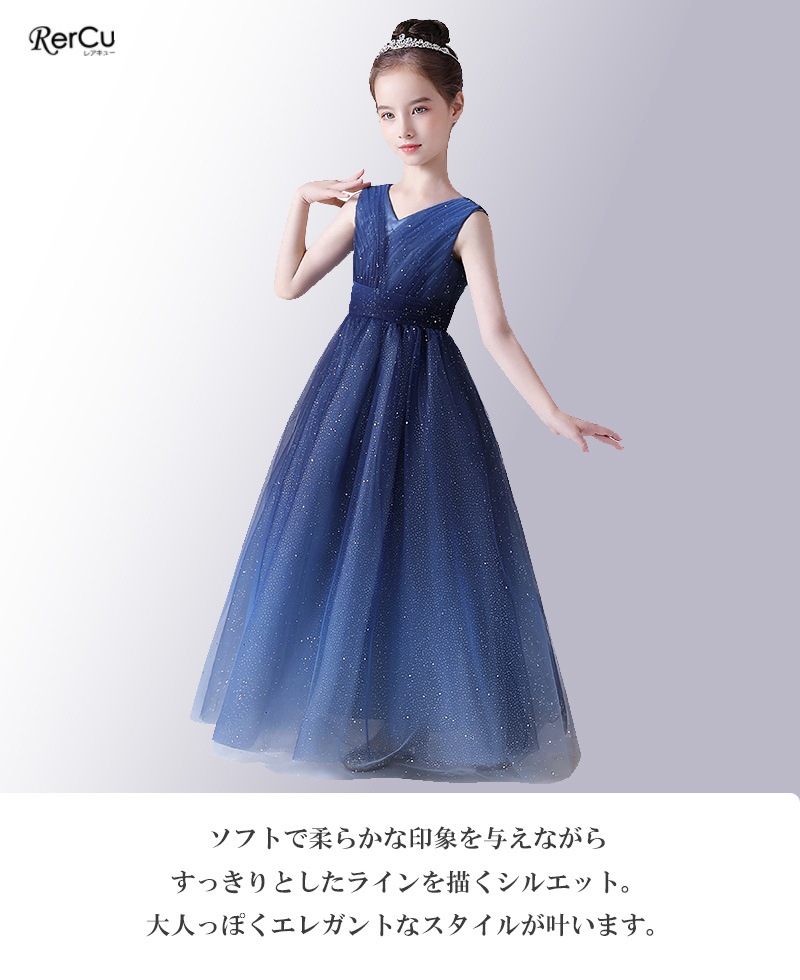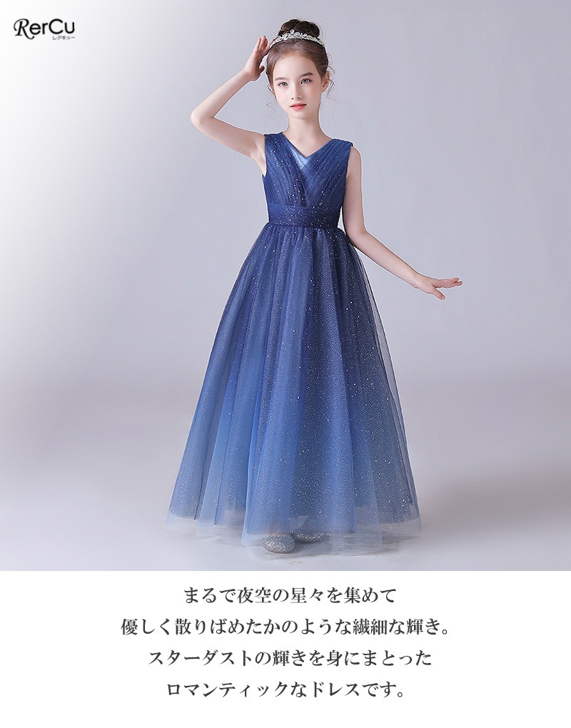 キラキラと輝くスパンコールを全体に施した、華やかで高級感のあるロングドレス。まるで夜空の星々を集めて散りばめたような繊細な輝きが、お子さまをロマンティックに包み込みます。ソフトなチュールがふんわりと広がり、柔らかさの中にもすっきりとした美しいラインを描くシルエット。大人っぽく上品なスタイルが叶う一着です。
