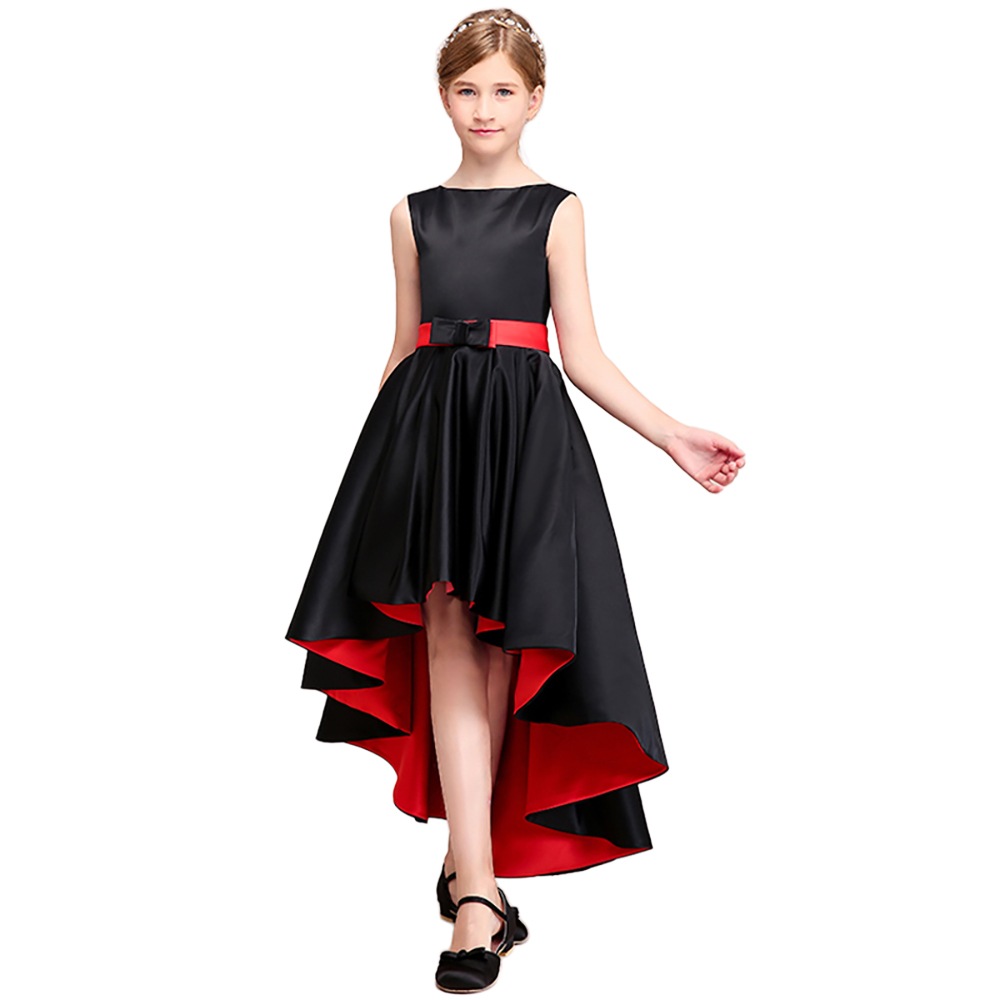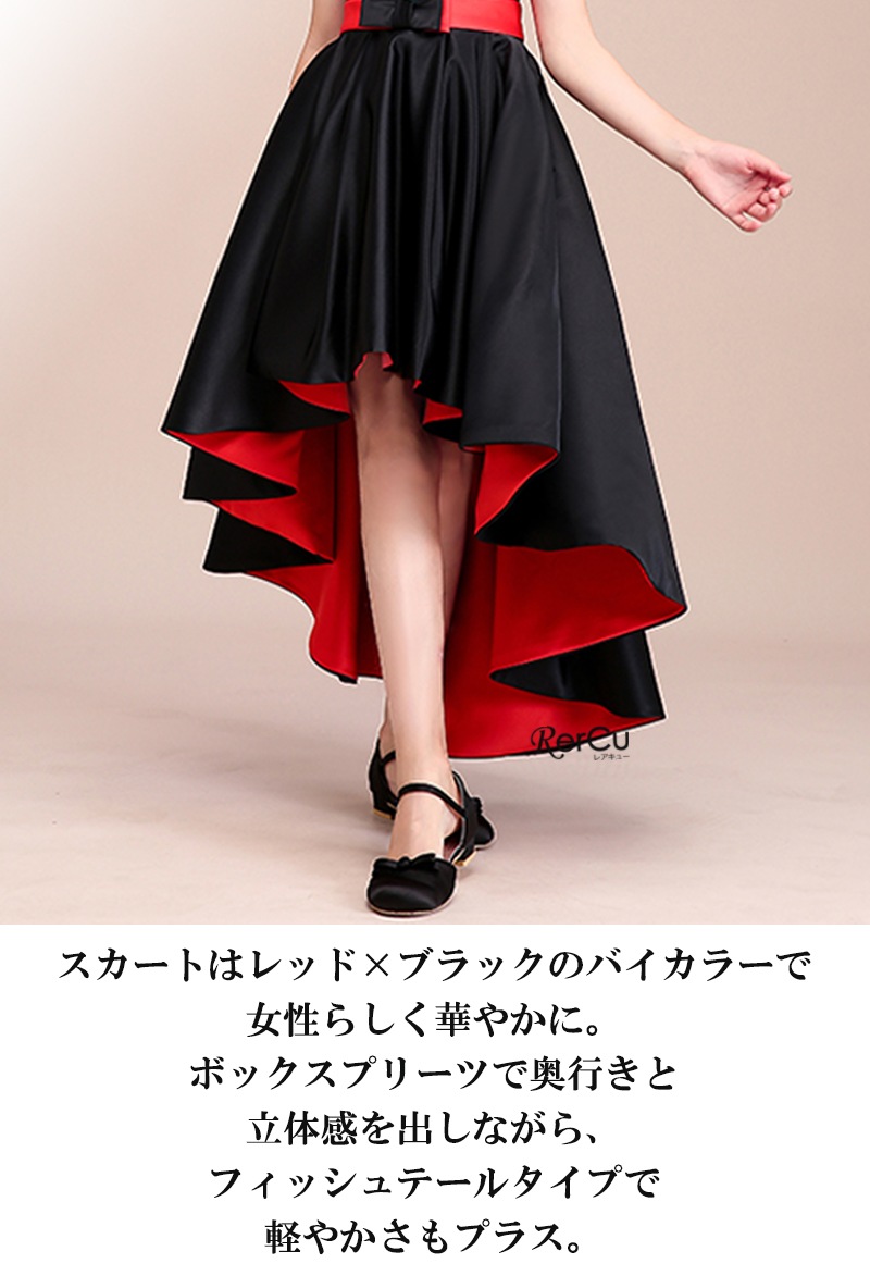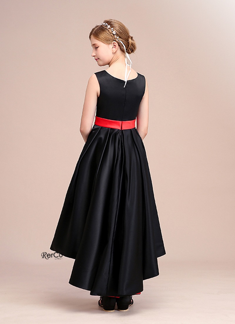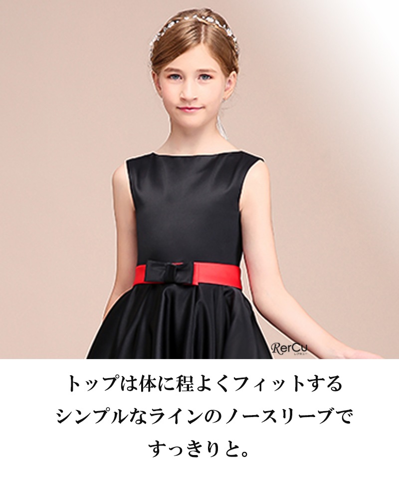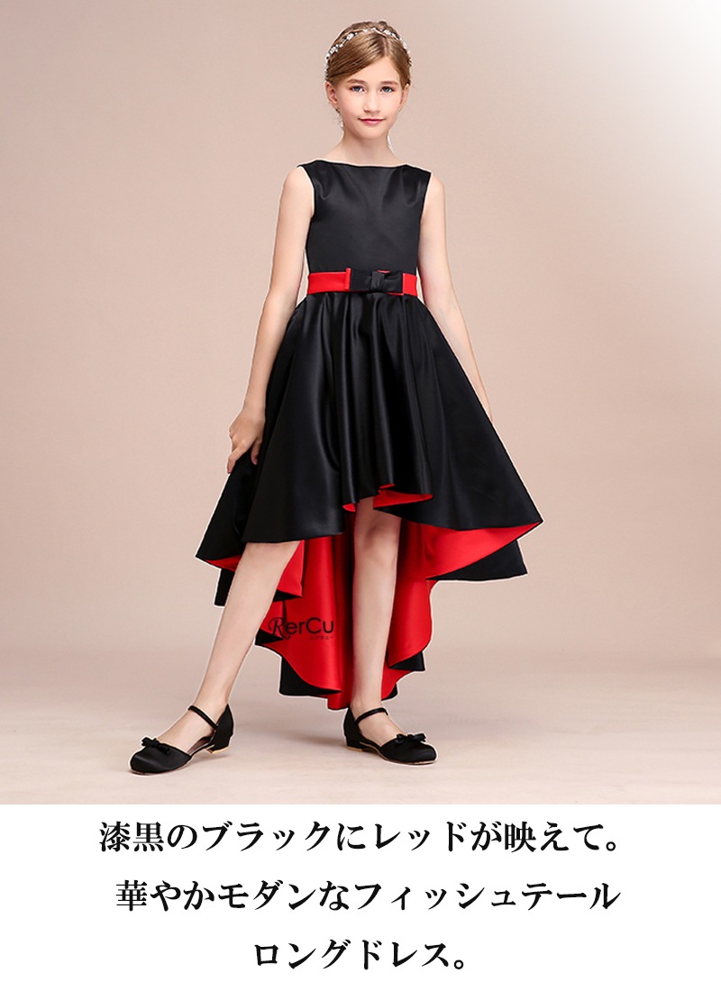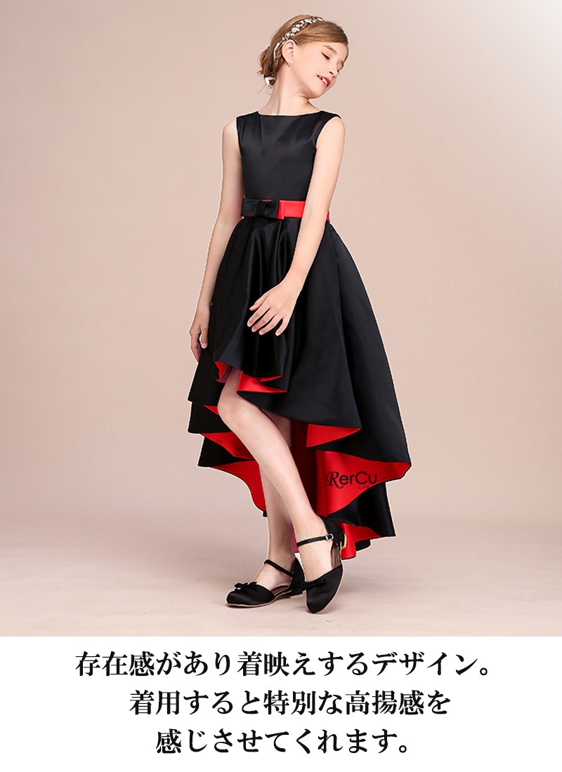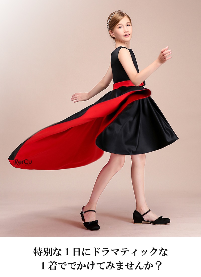深みのあるブラックに鮮やかなレッドが映えるバイカラーデザインが魅力の子供ドレス。程よく体にフィットするノースリーブのトップと、立体感のあるフィッシュテールスカートが、モダンで上品なシルエットを演出します。光沢のあるサテン生地が華やかな印象を加え、ウエストのリボンが可愛らしさをプラス。動くたびに揺れる裾が存在感たっぷりです。