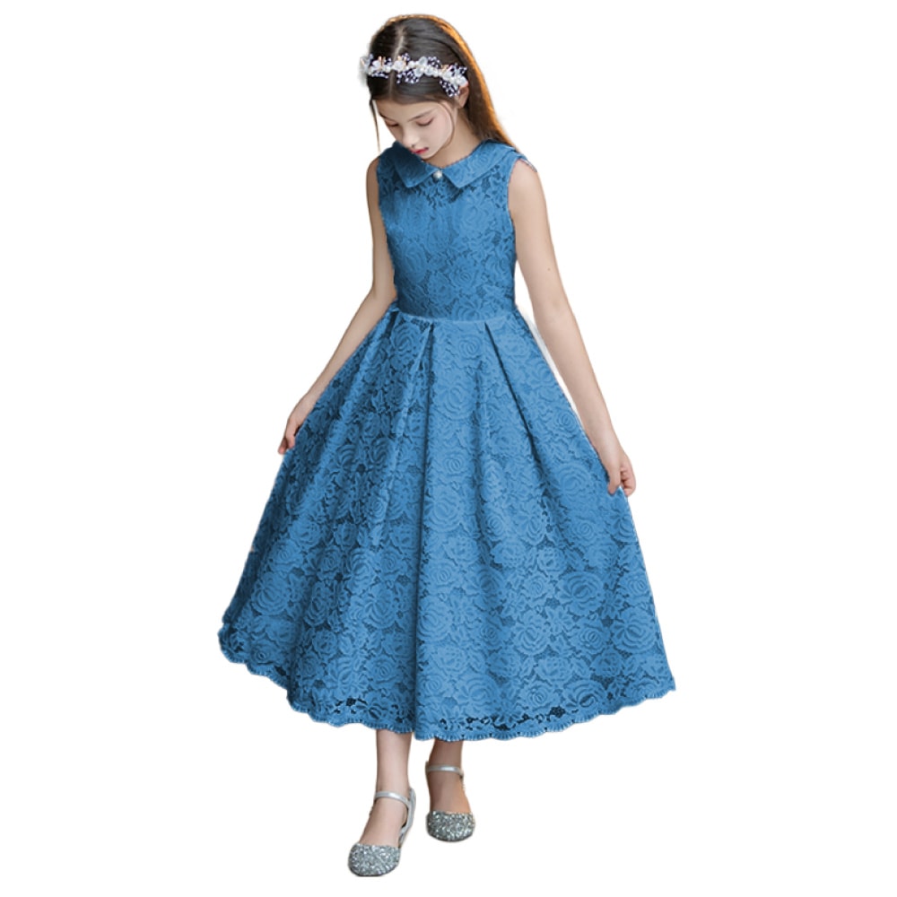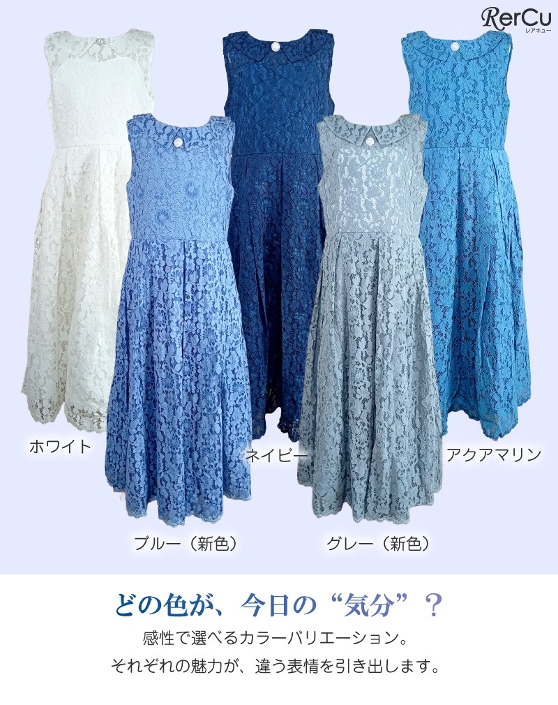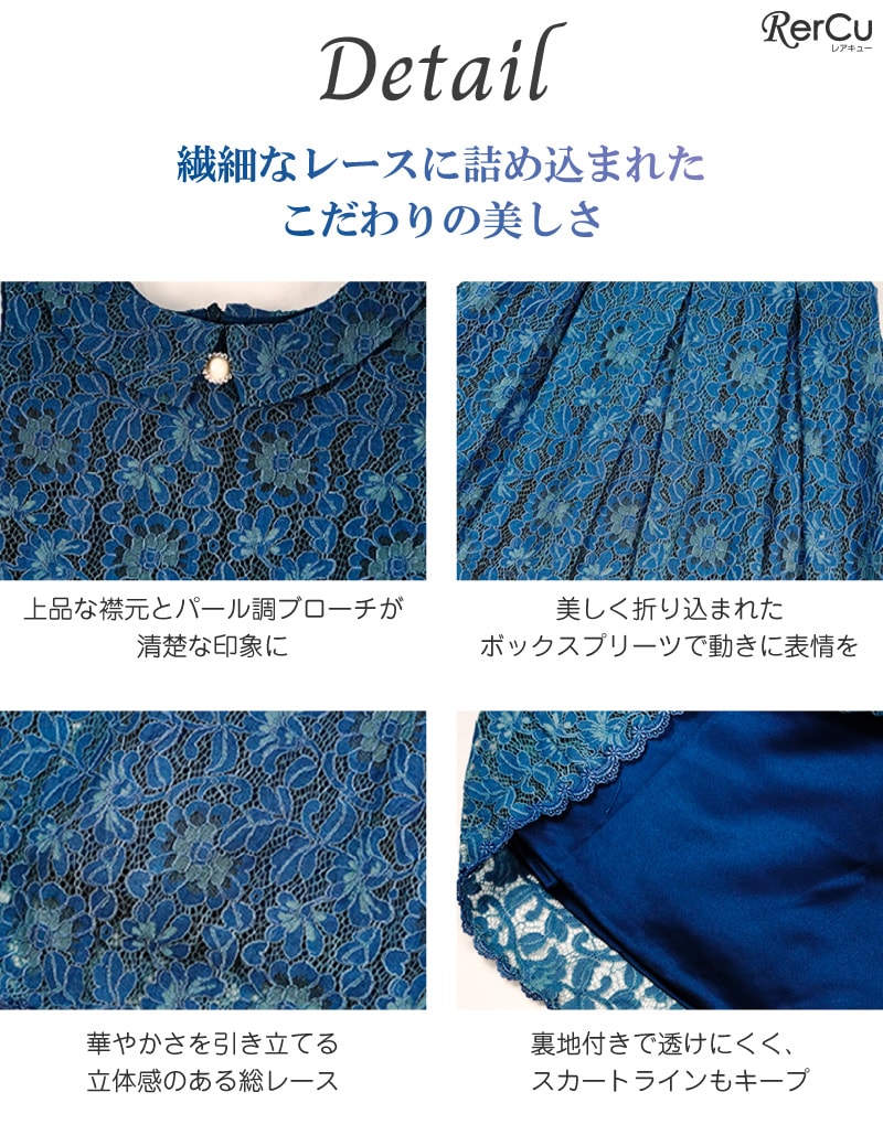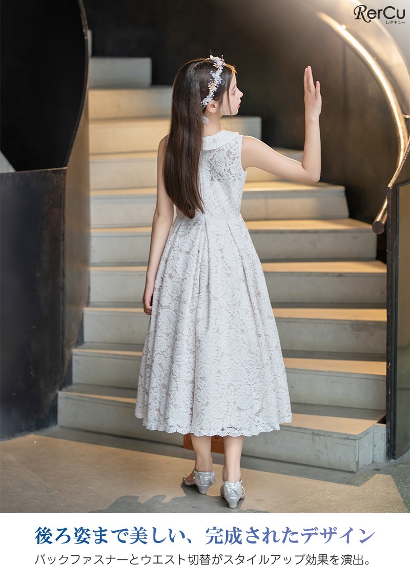 繊細なフラワーレースを贅沢に使用した、クラシカルなロング丈ドレス。新登場の爽やかなブルーとシックなグレーが仲間入りし、より幅広いテイストに対応可能です。上品な襟元には取り外し可能なパール調ブローチが施され、フォーマル感を引き立てます。動きのあるボックスプリーツとウエスト切替の立体感が美しいシルエットを演出。どの角度から見ても美しく、写真撮影にも映える一着です。