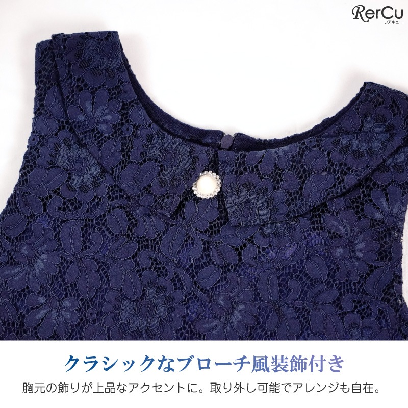 裏地付きで透けにくく、チクチクしにくい肌当たり。軽やかなレース素材と広がりすぎないスカートラインで、動きやすさも確保。背面ファスナー仕様で着脱もスムーズです。
