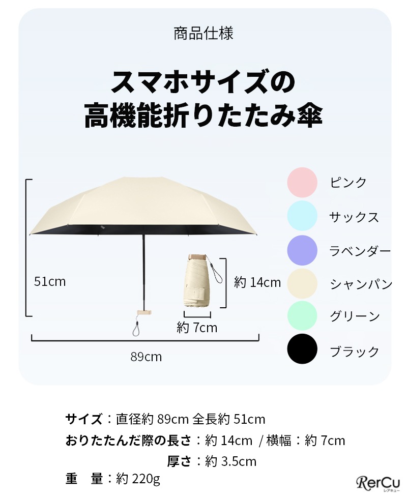 | 商品詳細 | 【商品詳細】 ・99.9%UVカット折りたたみ傘です。 ・コンパクトで軽量、シンプルでおしゃれなカラーはバッグに入れて携帯用にもオススメです。 ・直径約89cmの晴雨兼用の傘で急な雨にも活躍してくれます。 ・日常的に持ち運びたいデザイン、UVカット効果もしっかり!な日傘でUV対策をしてみませんか? サイズ:直径89cm 全長51cm おりたたんだ際の長さ:約14cm 重量:約220g |