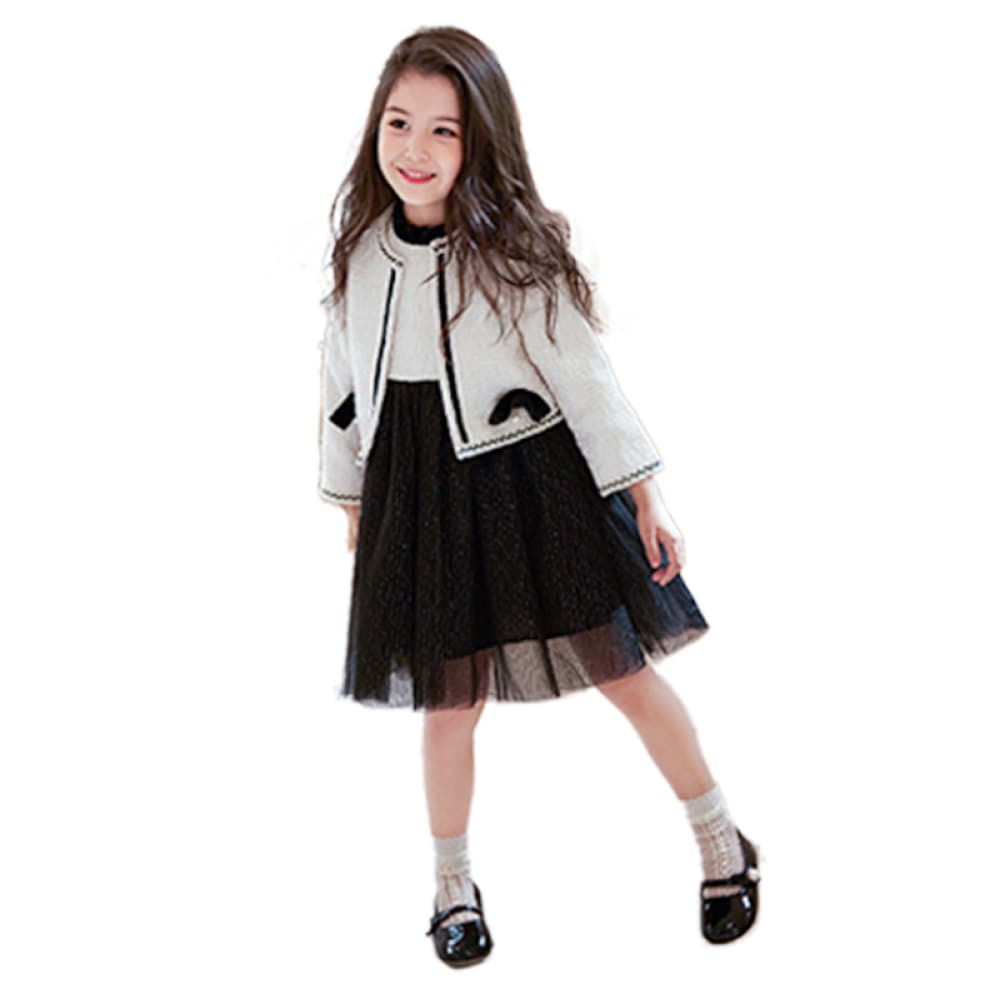 ワンピースは、ツイード風の身頃×チュールスカートのバイカラーがポイント。高めの切り替えがスタイルを美しく見せ、揺れるチュールが華やかさを添えます。