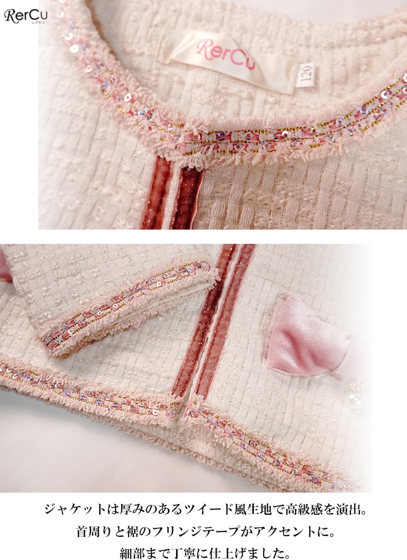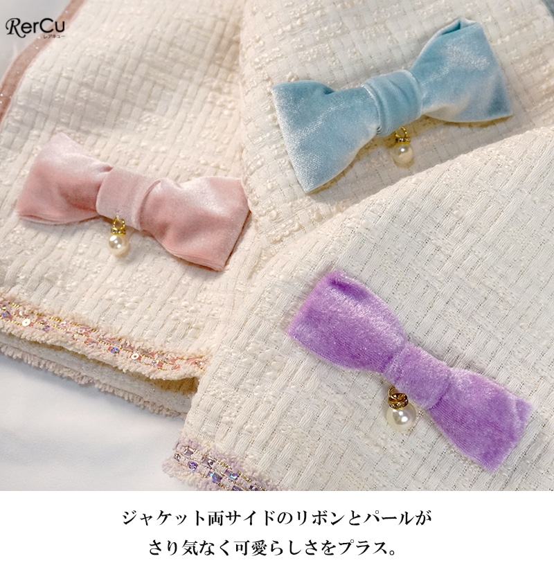 ショート丈のツイード風ジャケットは、フリンジテープと取り外し可能なリボン&パールで上品かつ可愛らしい印象に。