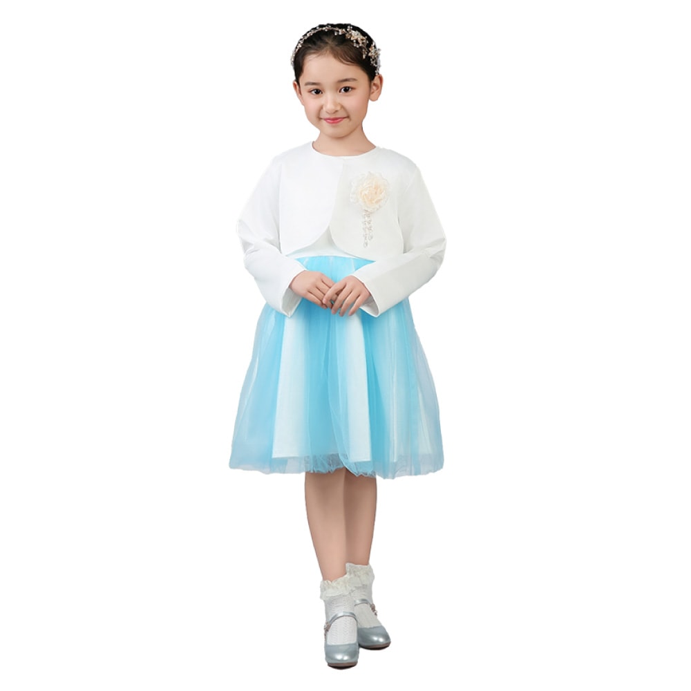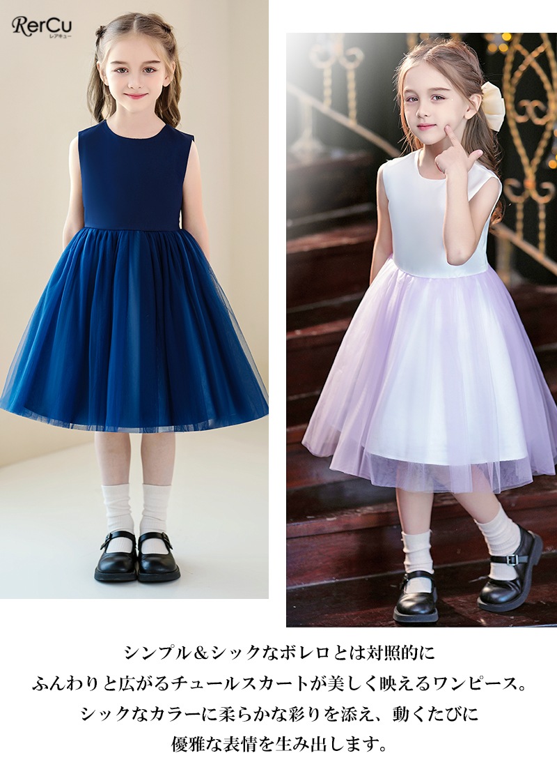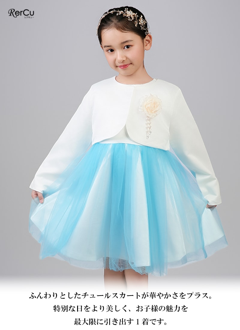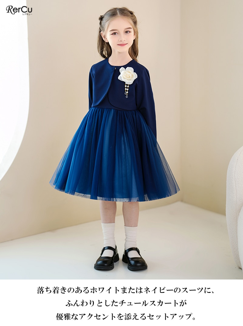 上質なスーツ生地で仕立てたショート丈ボレロと、ふんわり広がるチュールスカートのワンピースを組み合わせた上品なセットアップ。ワンピースはシンプルなノースリーブデザインで、歩くたびに揺れるボリュームチュールが優雅な雰囲気を演出します。高めのウエスト切り替えがスタイルをきれいに見せ、可愛らしさもプラス。ボレロはホワイト・ネイビーの落ち着いた色味で、取り外しができるコサージュが華やかなアクセントになります。