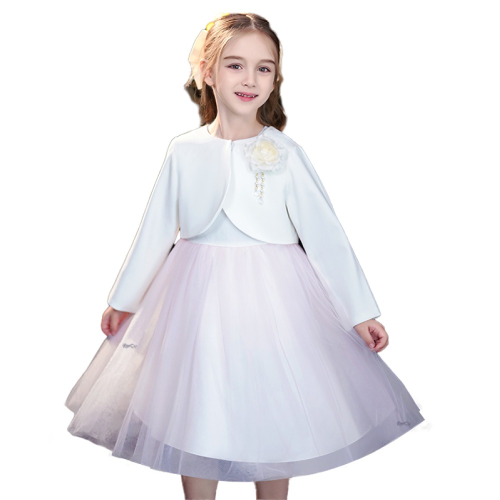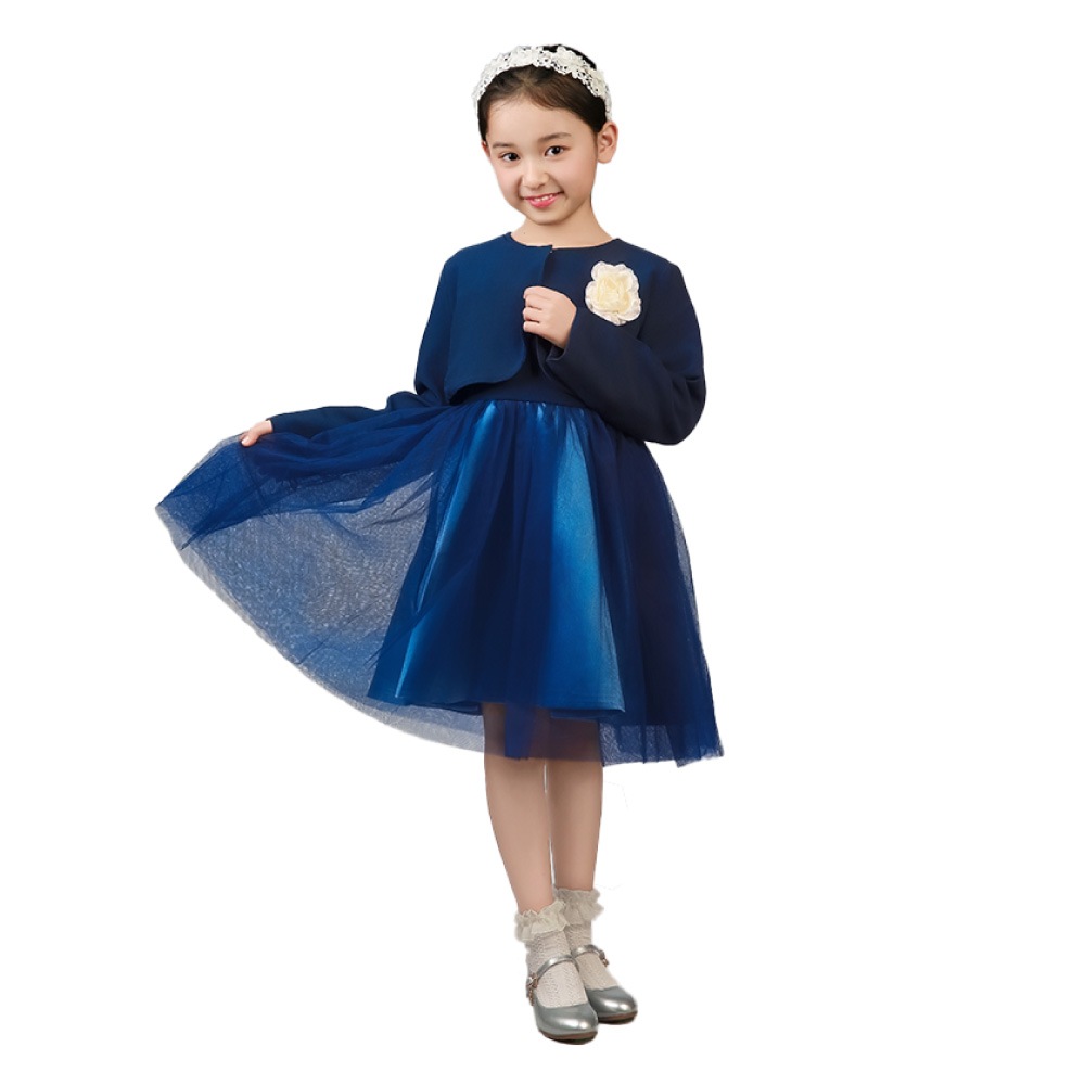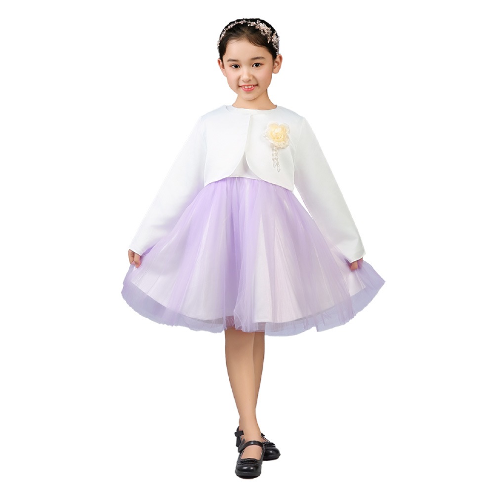 上質なスーツ生地で仕立てたショート丈ボレロと、ふんわり広がるチュールスカートのワンピースを組み合わせた上品なセットアップ。ワンピースはシンプルなノースリーブデザインで、歩くたびに揺れるボリュームチュールが優雅な雰囲気を演出します。高めのウエスト切り替えがスタイルをきれいに見せ、可愛らしさもプラス。ボレロはホワイト・ネイビーの落ち着いた色味で、取り外しができるコサージュが華やかなアクセントになります。