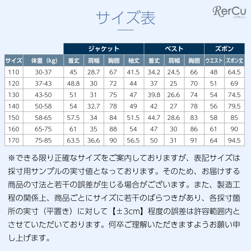 | 素材 | ジャケット・ベスト・ズボン ポリエステル98% レーヨン2% シャツ ポリエステル100% ネクタイ・ポケットチーフ ポリエステル100% ※ロット違いにより、色ブレの場合がございます |