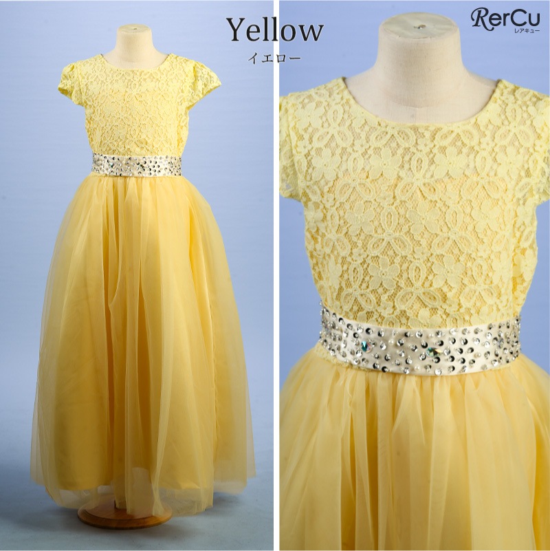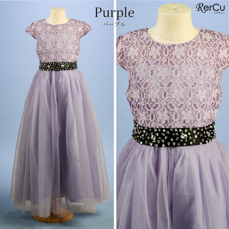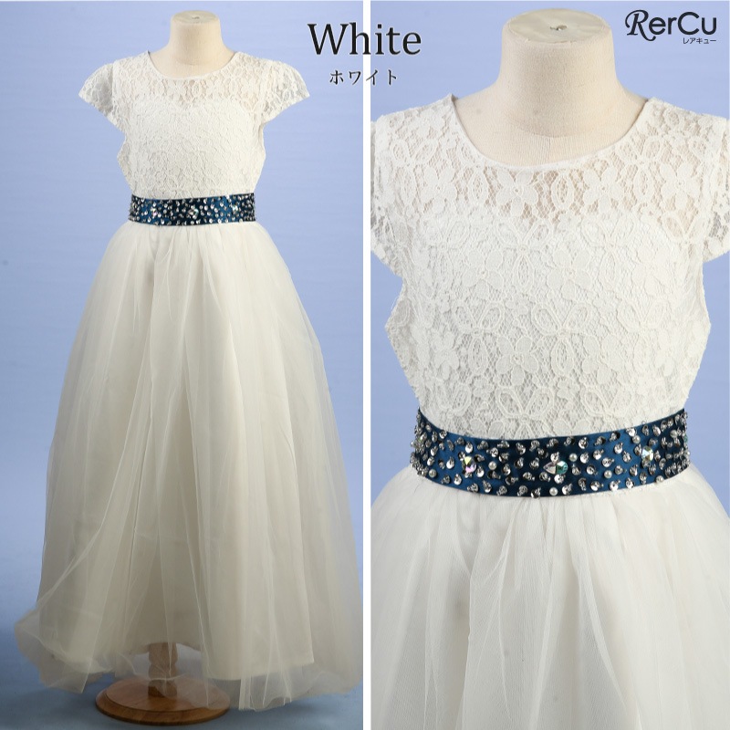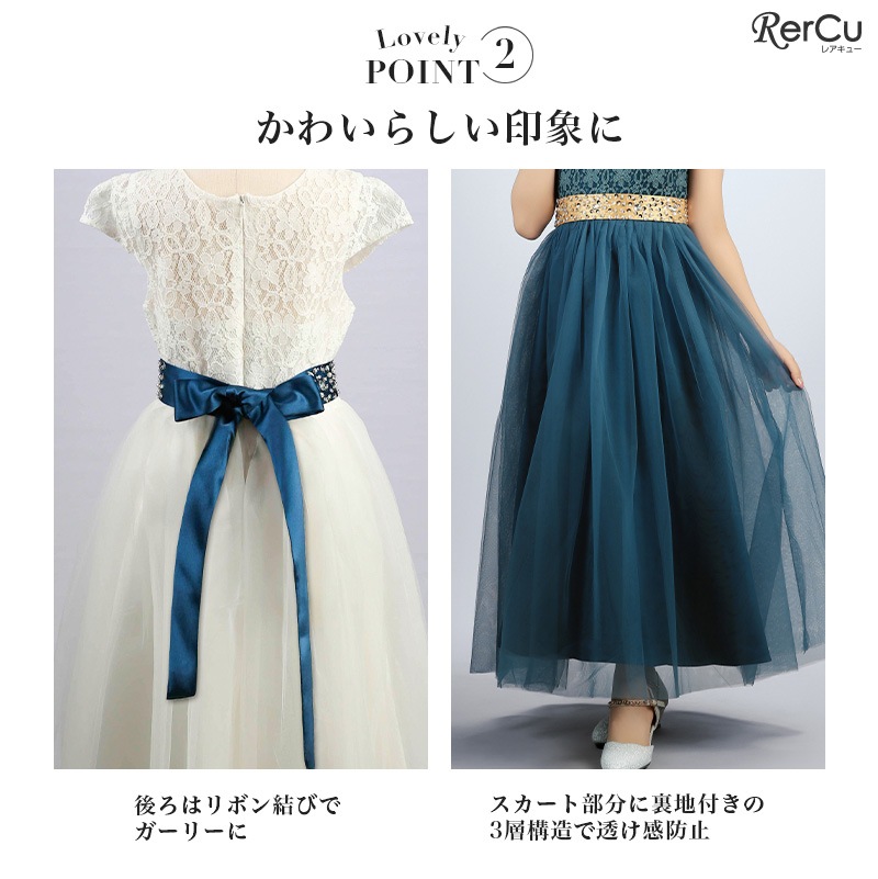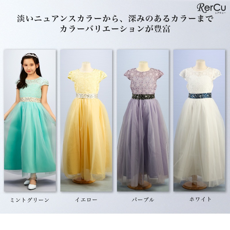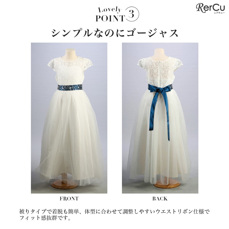 繊細なフラワーレースの上身頃と、ふんわり広がるチュールスカートが優雅な印象を演出。ウエストにはラインストーン付きのサテンリボンをあしらい、前からも後ろからも華やかな存在感を放ちます。全8色展開で、好みに合わせたコーディネートが可能です。