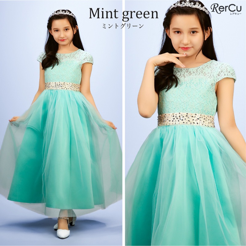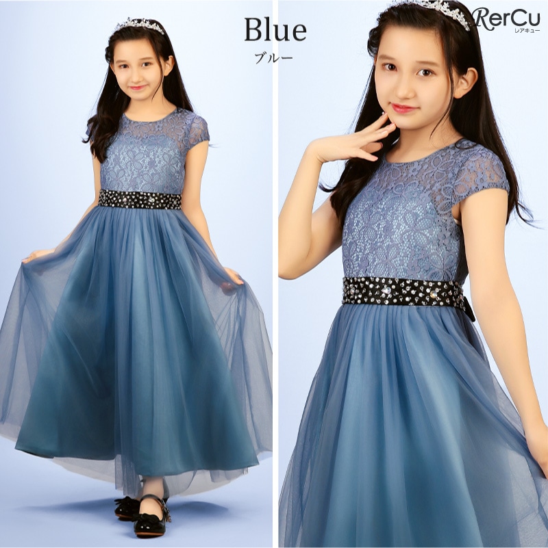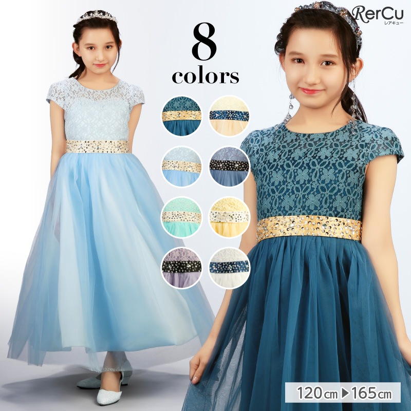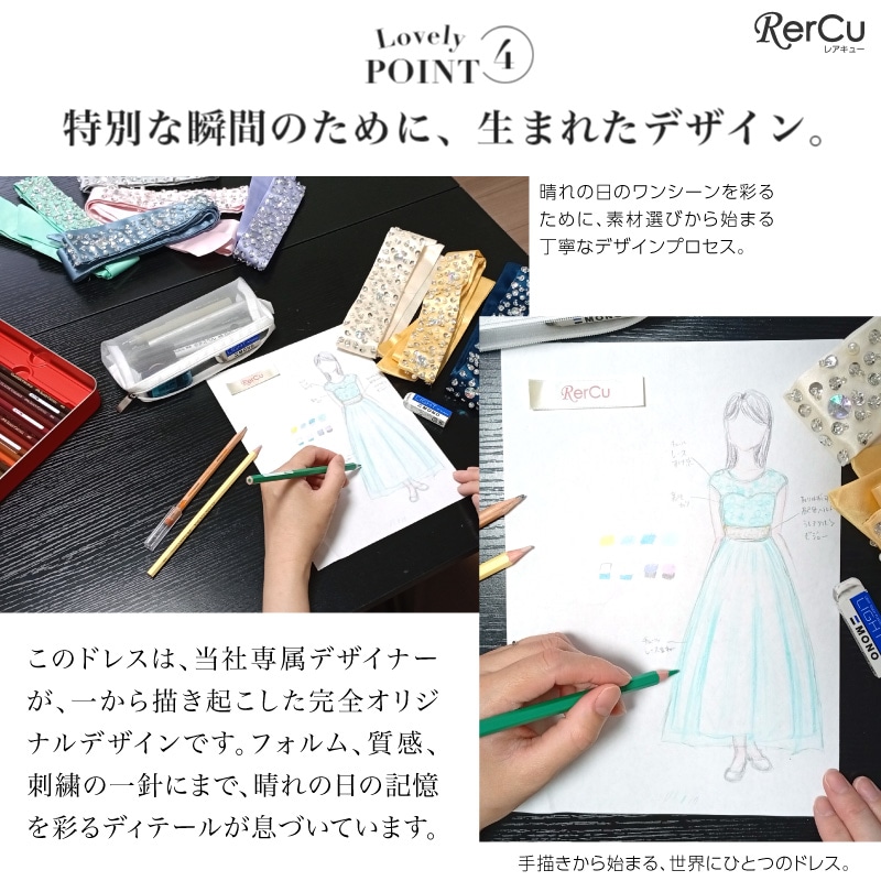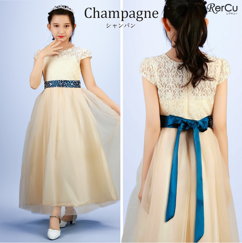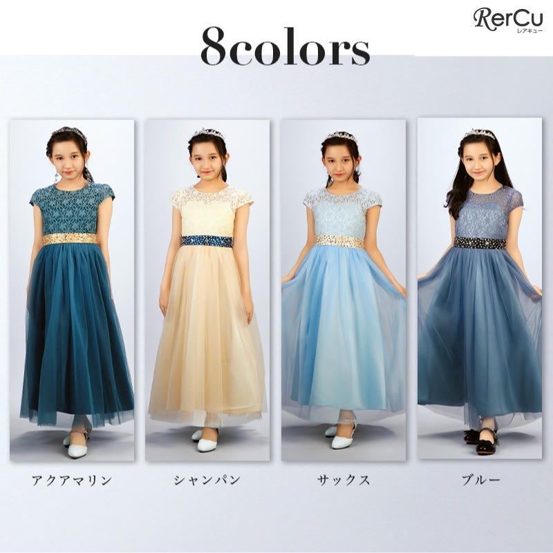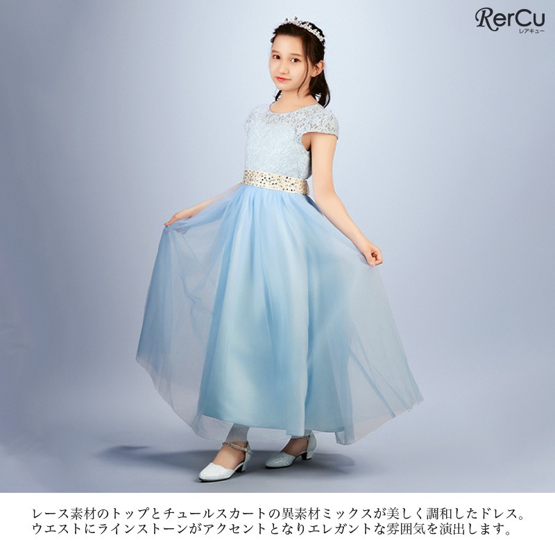 繊細なフラワーレースの上身頃と、ふんわり広がるチュールスカートが優雅な印象を演出。ウエストにはラインストーン付きのサテンリボンをあしらい、前からも後ろからも華やかな存在感を放ちます。全8色展開で、好みに合わせたコーディネートが可能です。