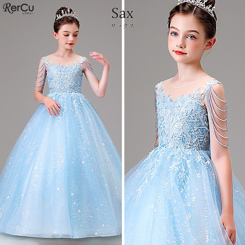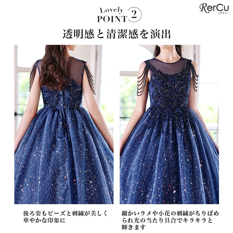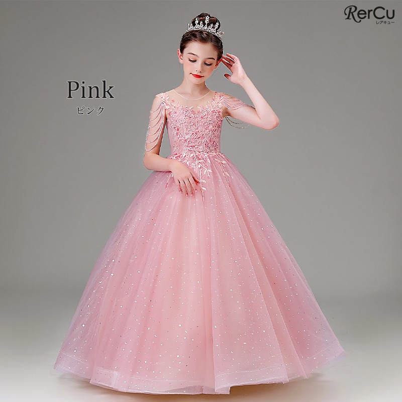 繊細な刺繍とスパンコールが煌めく、華やかなプリンセス風ロングドレス。立体的なフラワーモチーフが上身頃を彩り、シアー素材のデコルテが上品な抜け感を演出。肩から流れるビーズチェーンが特別感を高めてくれます。