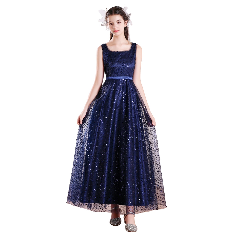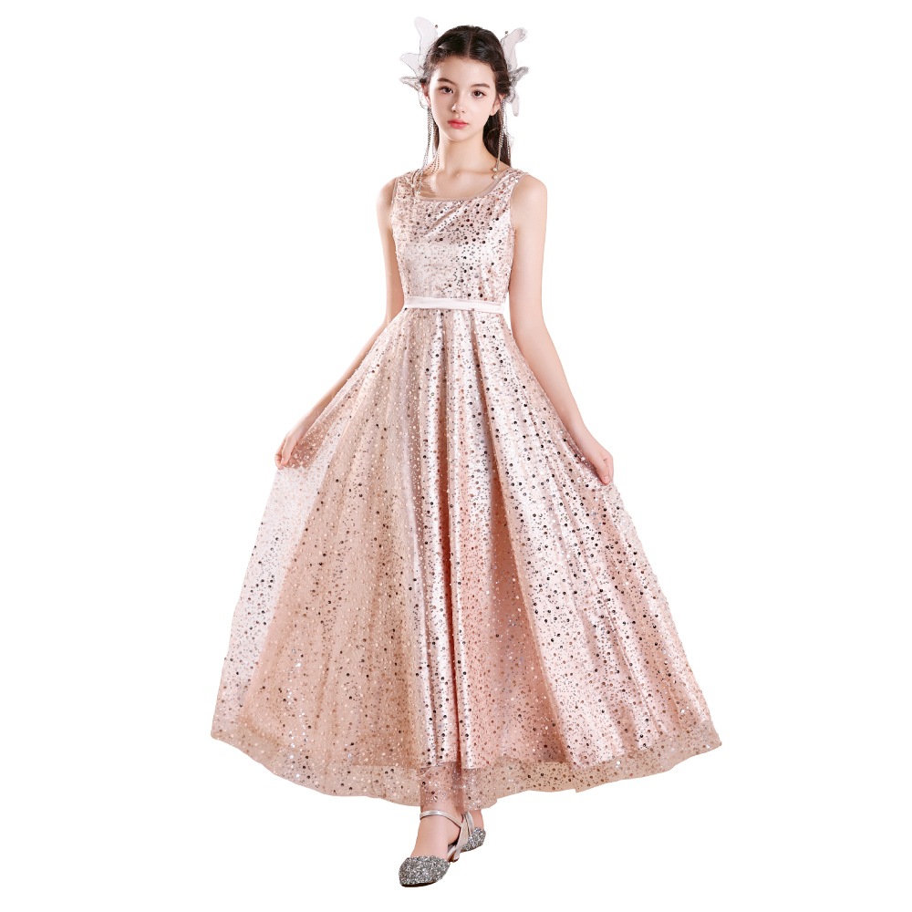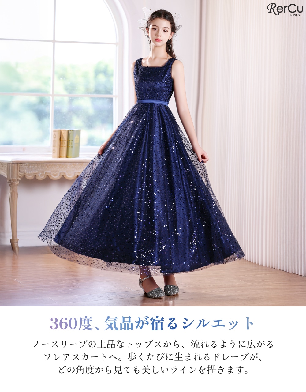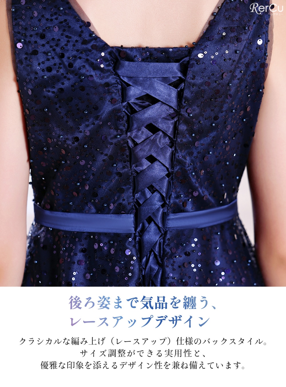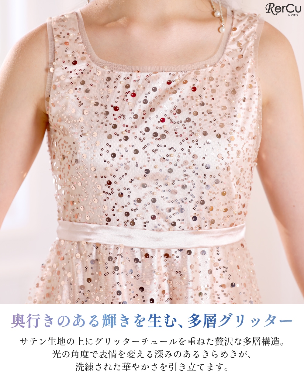 微細なグリッターとスパンコールが、夜空の星のようにきらめく多層構造のチュールスカート。気品が漂うノースリーブと、控えめな光沢のサテンウエストラインが、上品なクラシカルスタイルを演出します。背中の編み上げ(レースアップ)でサイズ調整が可能です。