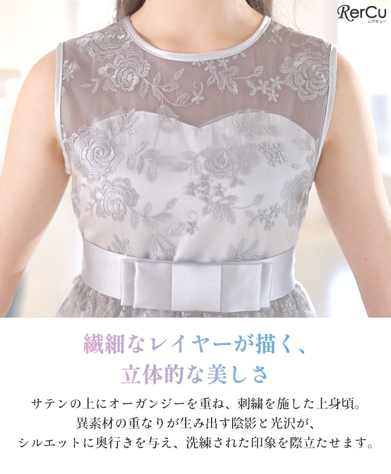 サテンの上にオーガンジーを重ね、繊細な刺繍を施した上質な身頃。異素材の重なりが生み出す陰影と光沢が、立体的な美しさを際立たせます。フロントリボンと背中のサテンリボンがエレガントな後ろ姿を演出し、優美な印象を与えます。