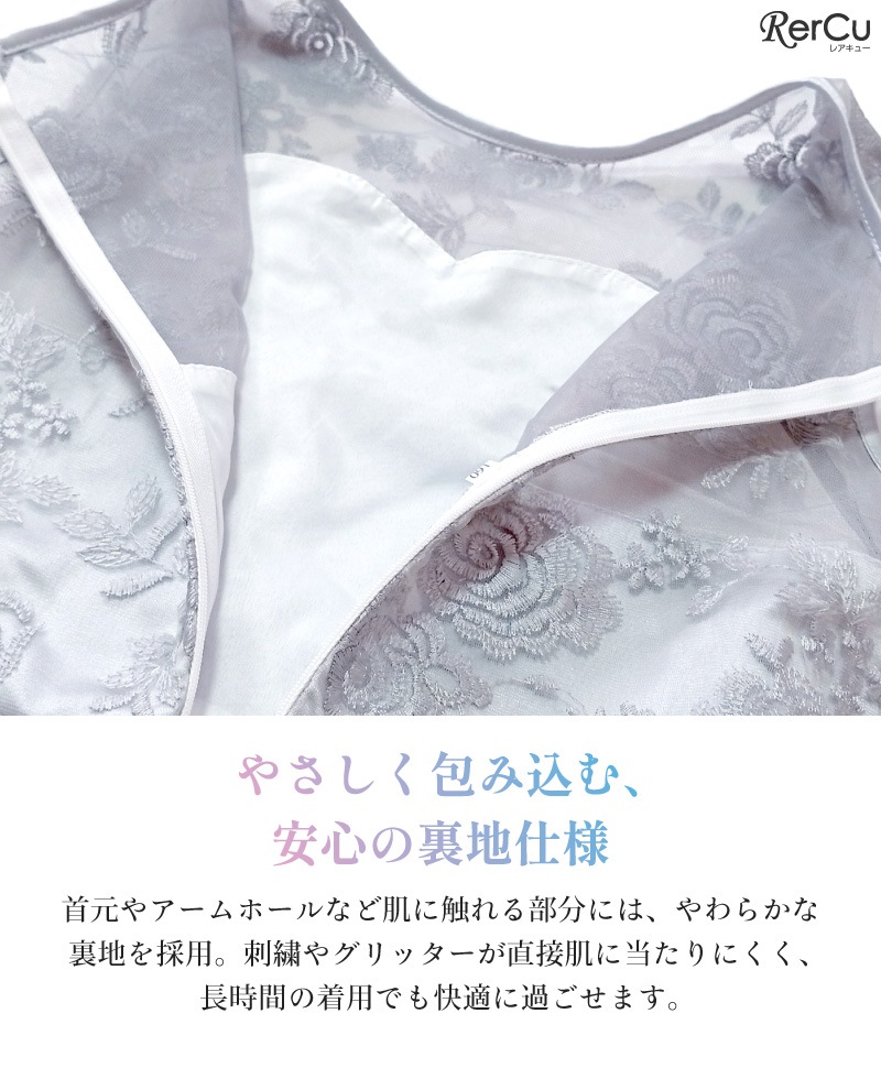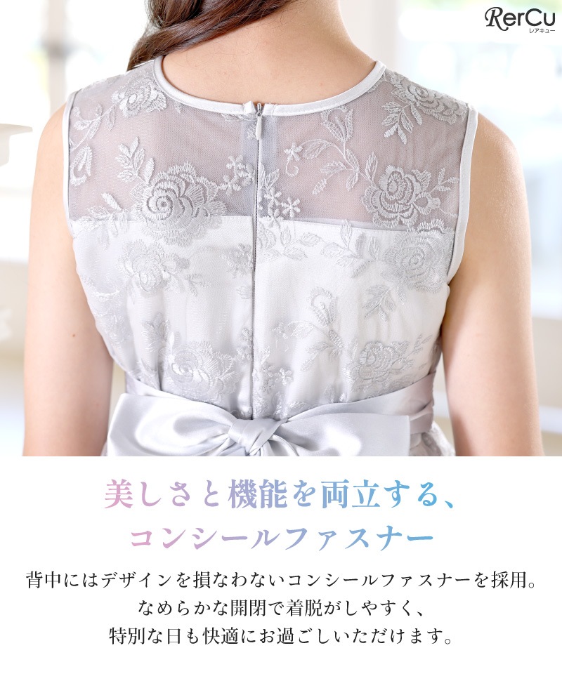 肌に触れる裏地にはやわらかな素材を採用し、刺繍やグリッターが直接肌に当たりにくい安心の仕立て。長時間の着用でも快適に過ごせます。背中にはデザインを損なわないコンシールファスナーを採用し、着脱しやすく、なめらかな開閉で着崩れしにくい工夫がされています。