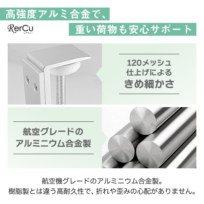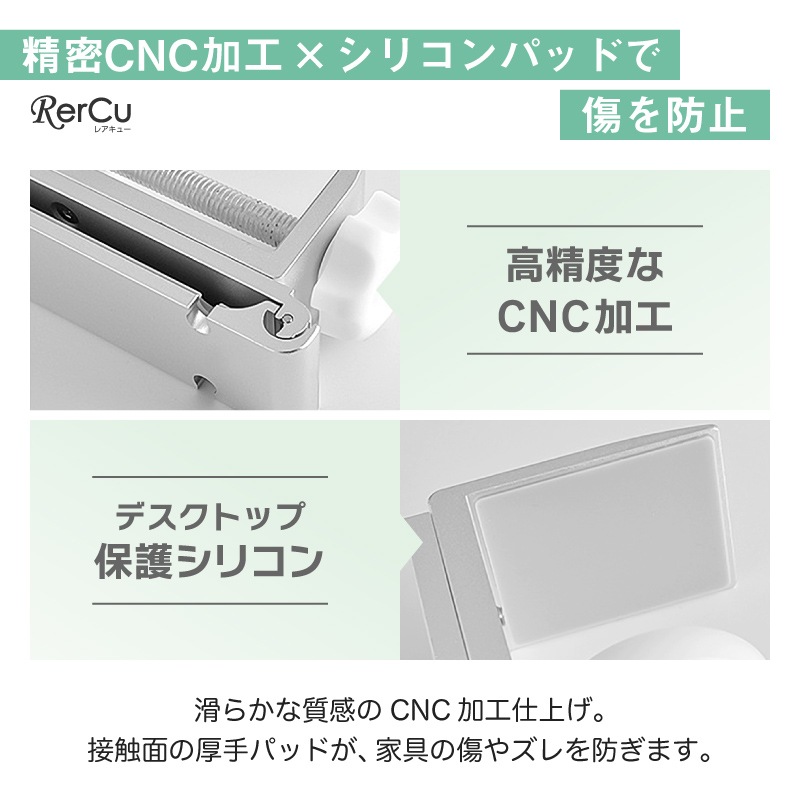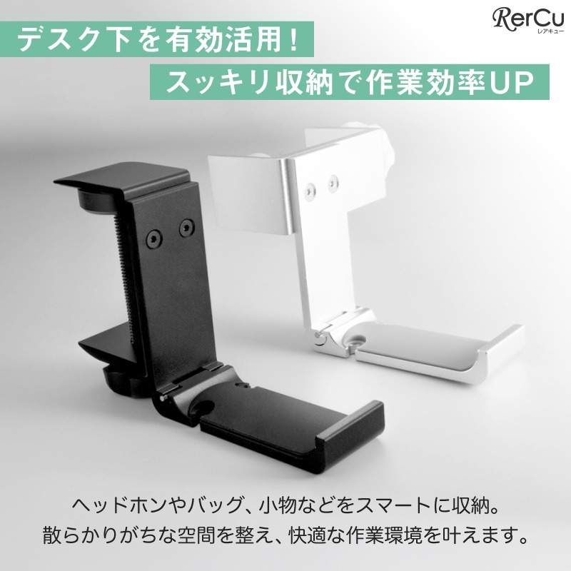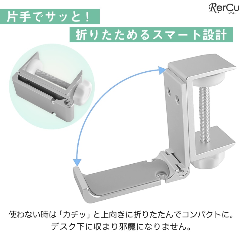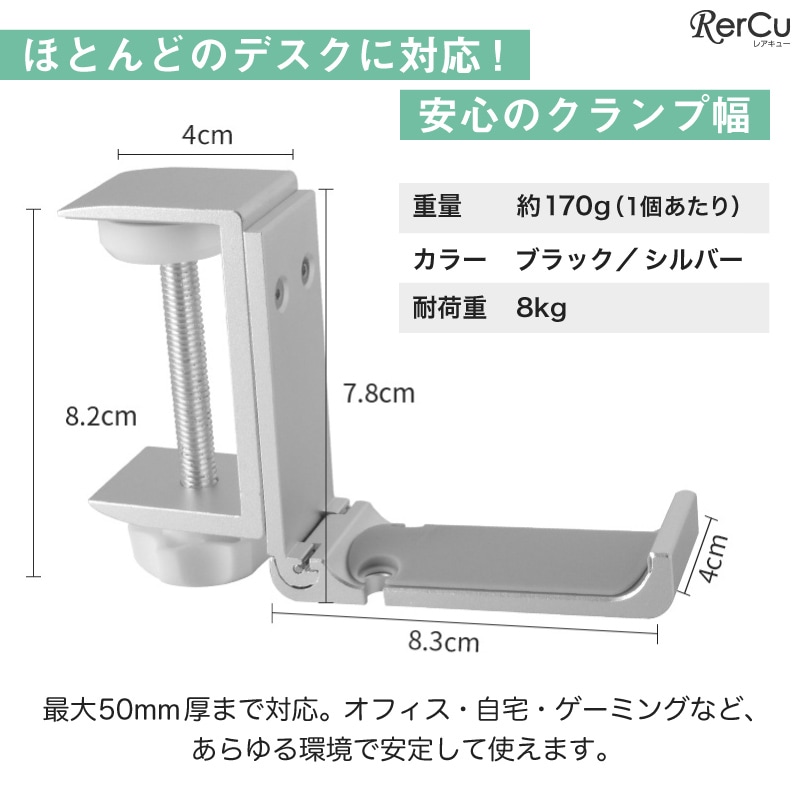 航空機グレードのアルミニウム合金を採用し、高強度かつ軽量。耐荷重8kgの頑丈設計で、重めのバッグや機材も安心して掛けられます。接触部分にはシリコンパッドを配置し、デスクへの傷付きを防止。滑り落ちにくく、しっかり安定して荷物をホールドします。