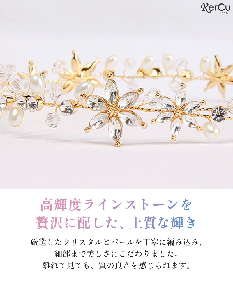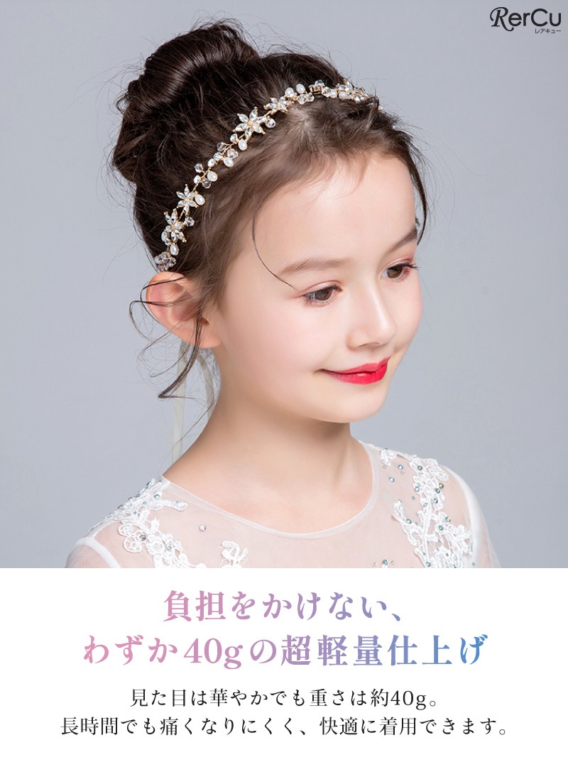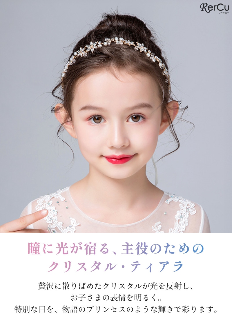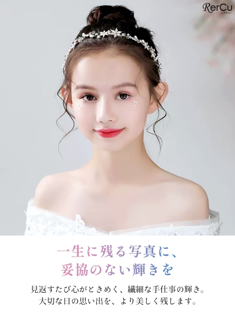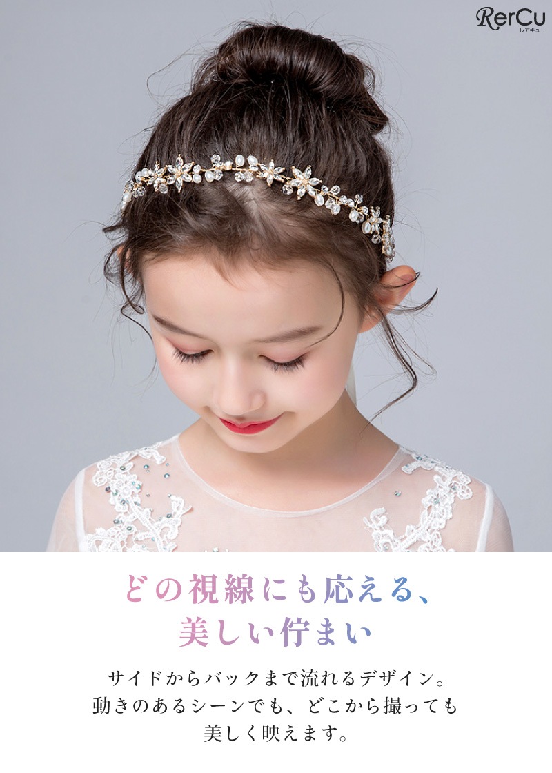 高輝度ラインストーンとパールを丁寧に編み込み、360度どこから見ても美しい仕上がりに。透明感のあるシルバーと、華やかなゴールドの2色展開で、お子さまの表情を明るく引き立てます。