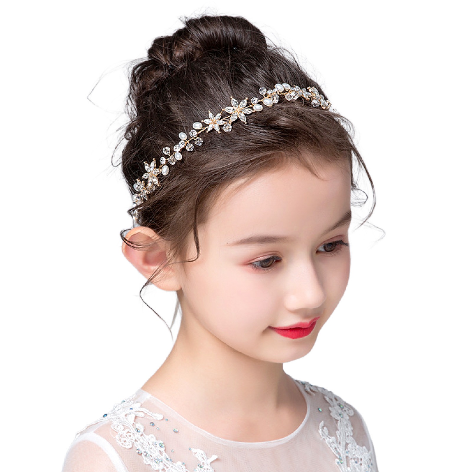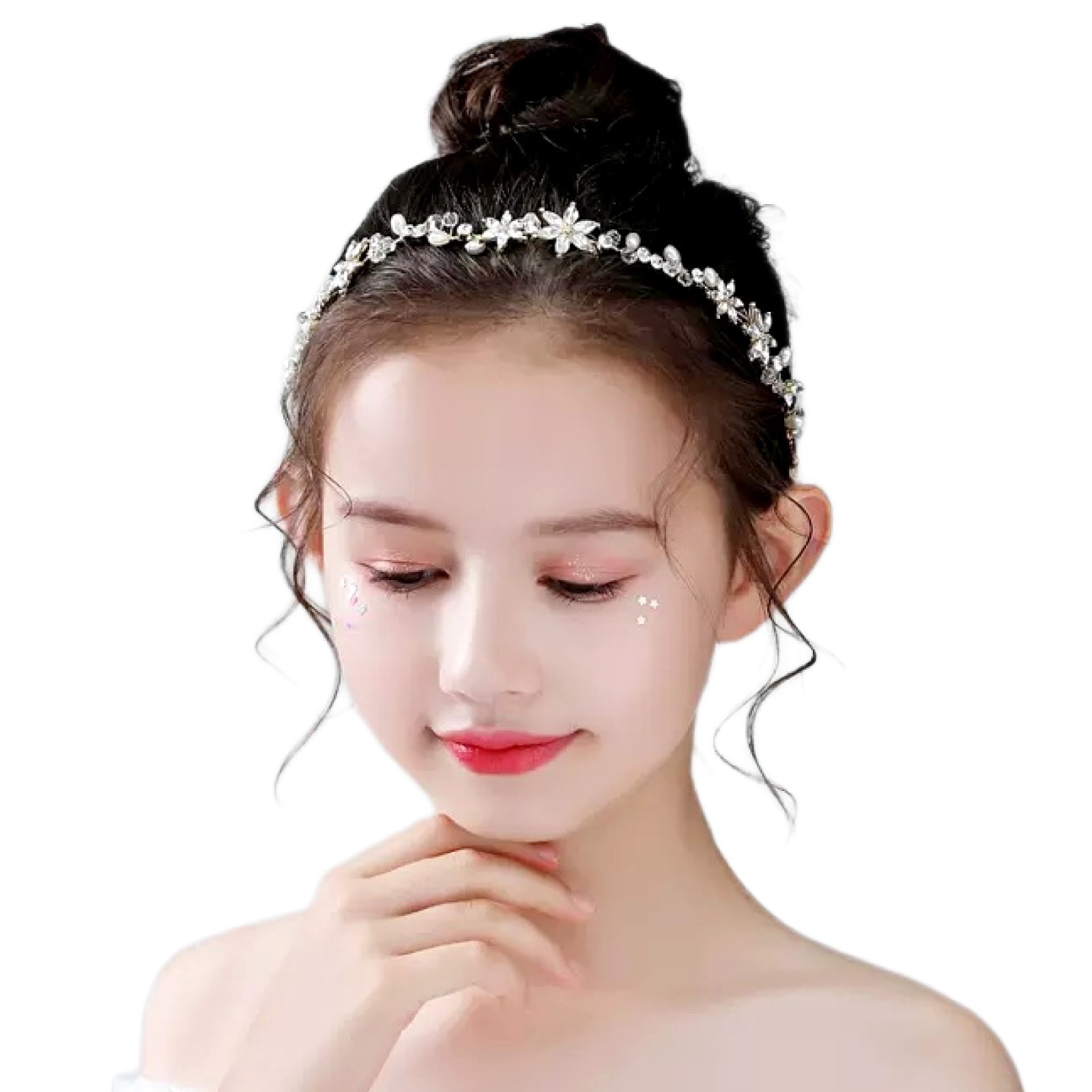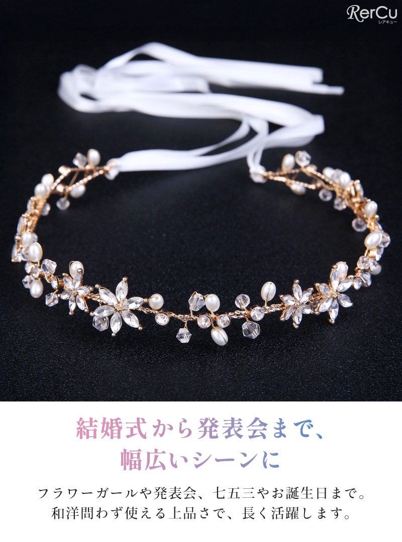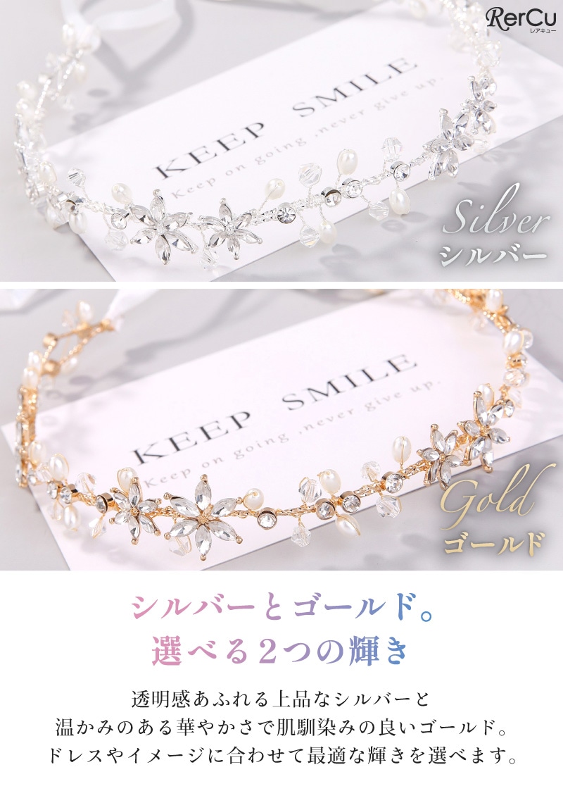 高輝度ラインストーンとパールを丁寧に編み込み、360度どこから見ても美しい仕上がりに。透明感のあるシルバーと、華やかなゴールドの2色展開で、お子さまの表情を明るく引き立てます。