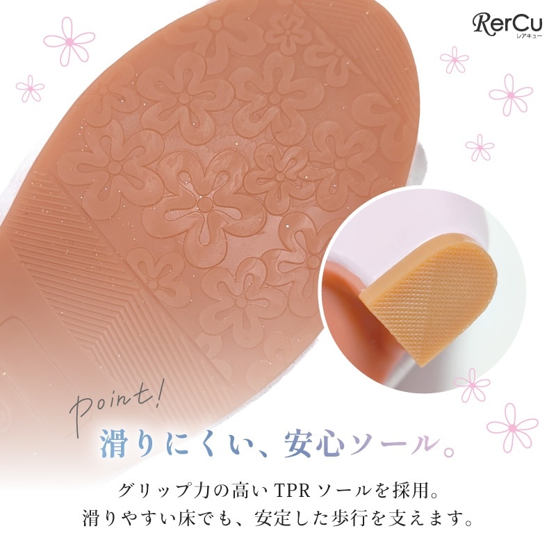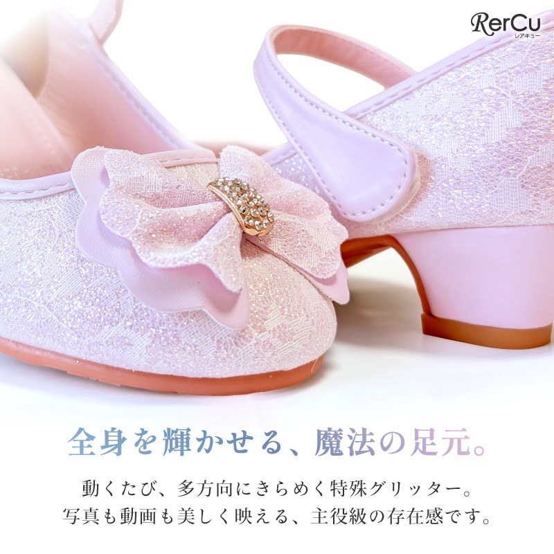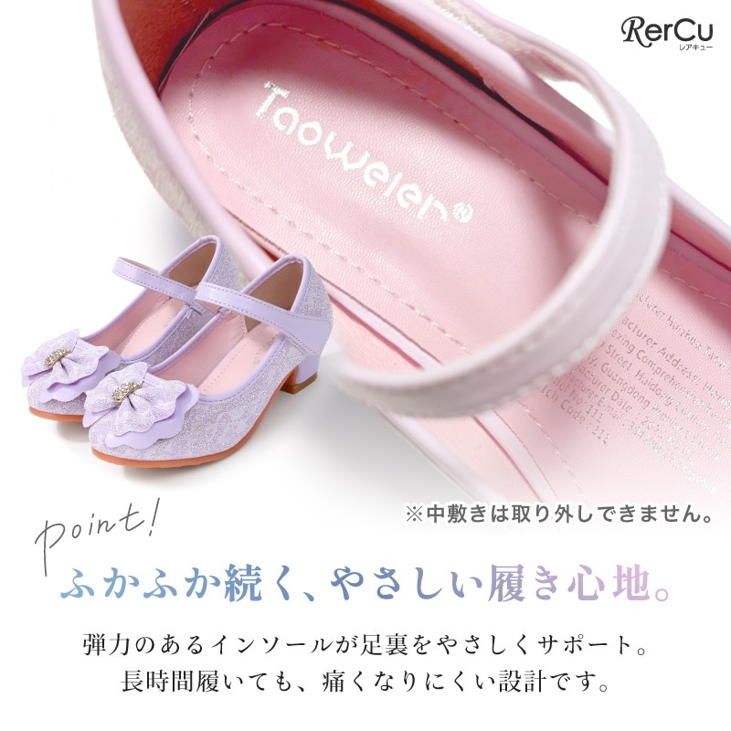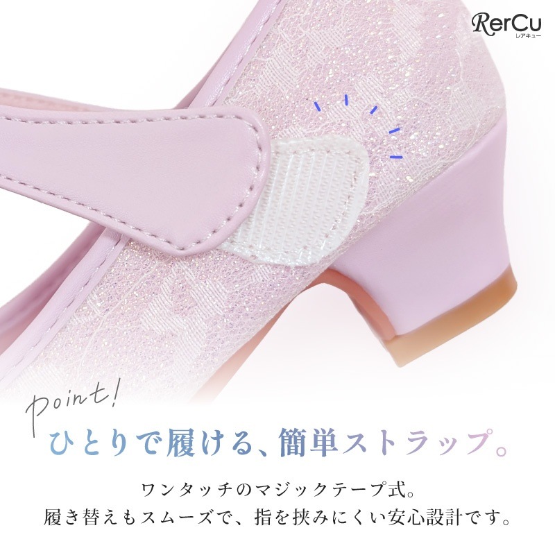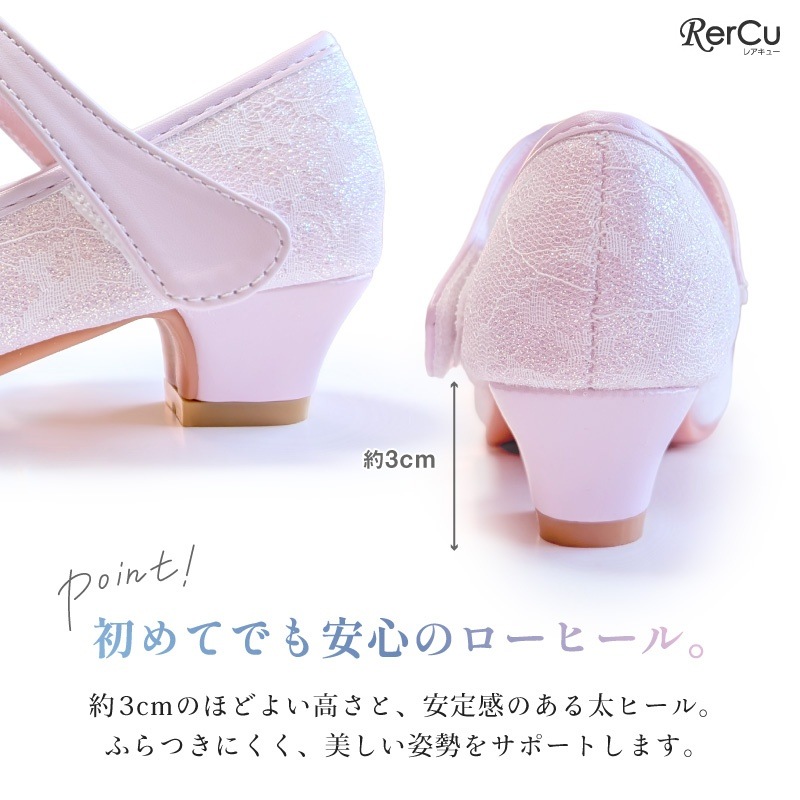 「初めてのヒールでも安心」をコンセプトに、安定感のある約3cmの太ヒールを採用。ふらつきにくく、お子様の美しい姿勢をサポートします。ストラップはワンタッチのマジックテープ式で、お子様一人でも脱ぎ履きがスムーズ。弾力のあるインソールが足裏をやさしく支え、長時間の着用でも痛くなりにくい設計です。