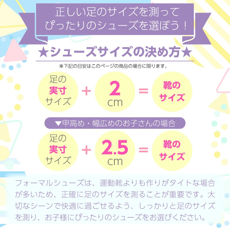 実寸より+2~2.5cm程度のサイズがおすすめです。丸みのあるつま先で幅広のお子様にもフィットしやすい設計です。