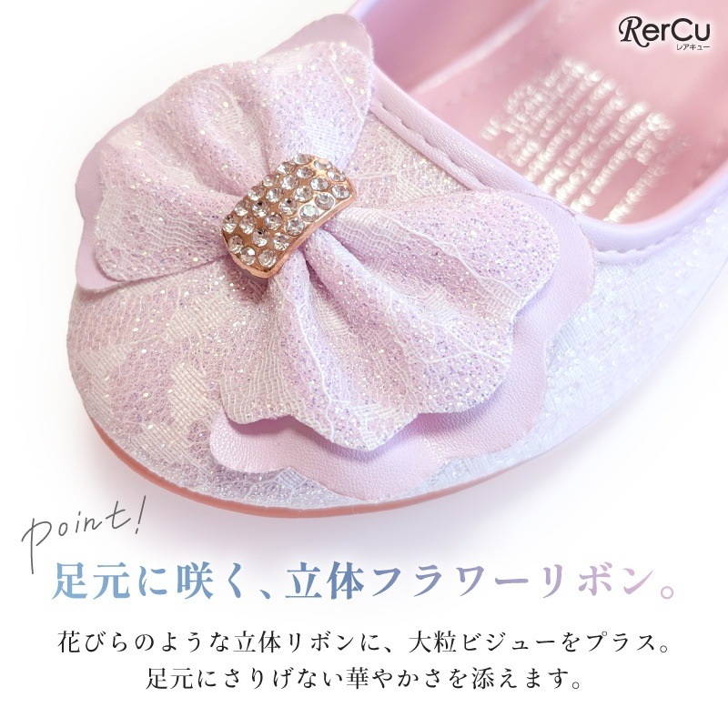 ・アッパー素材:合成皮革(ラメレース重ね) ・インソール:合成皮革(クッション入り) ・アウトソール:TPRソール(滑り止め仕様) ・装飾:立体リボン、大粒ビジュー |