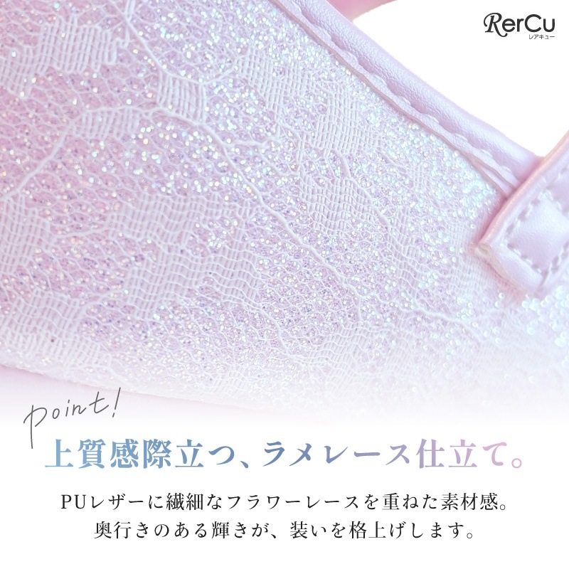 繊細なフラワーレースに、宝石のようなグリッターを散りばめた贅沢な仕立て。光を多方向に反射する特殊グリッターが、写真や動画でも圧倒的な存在感を放ちます。つま先には花びらのような立体フラワーリボンと大粒のビジューをあしらい、どこから見ても華やかな「主役級」のデザインに仕上げました。
