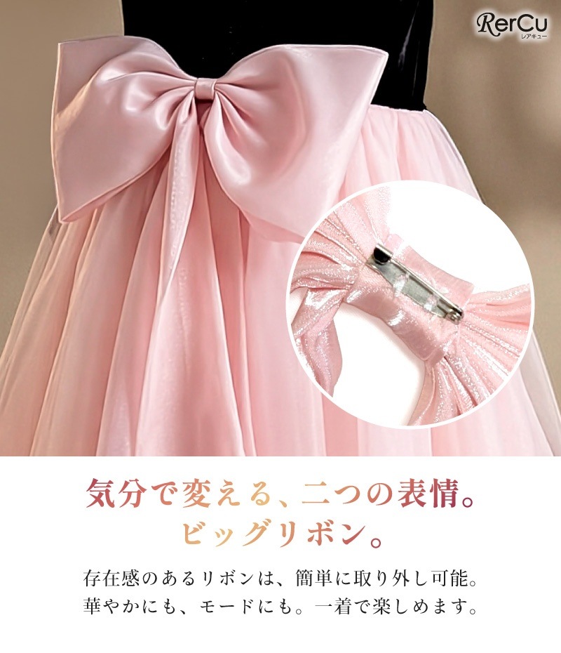 重厚なブラックベルベットと、シルクのように艶めくピンクサテンの美しいコントラスト。露出を抑えた知的なハイネックが、一歩先の「お嬢様スタイル」を叶えます。存在感のあるビッグリボンは、気分に合わせて取り外しが可能。華やかにも、モードにも、一着で二つの表情を楽しめるクラシカルなデザインです。