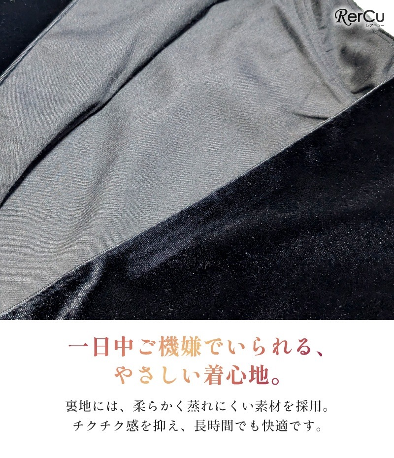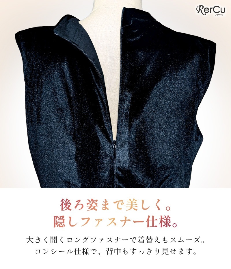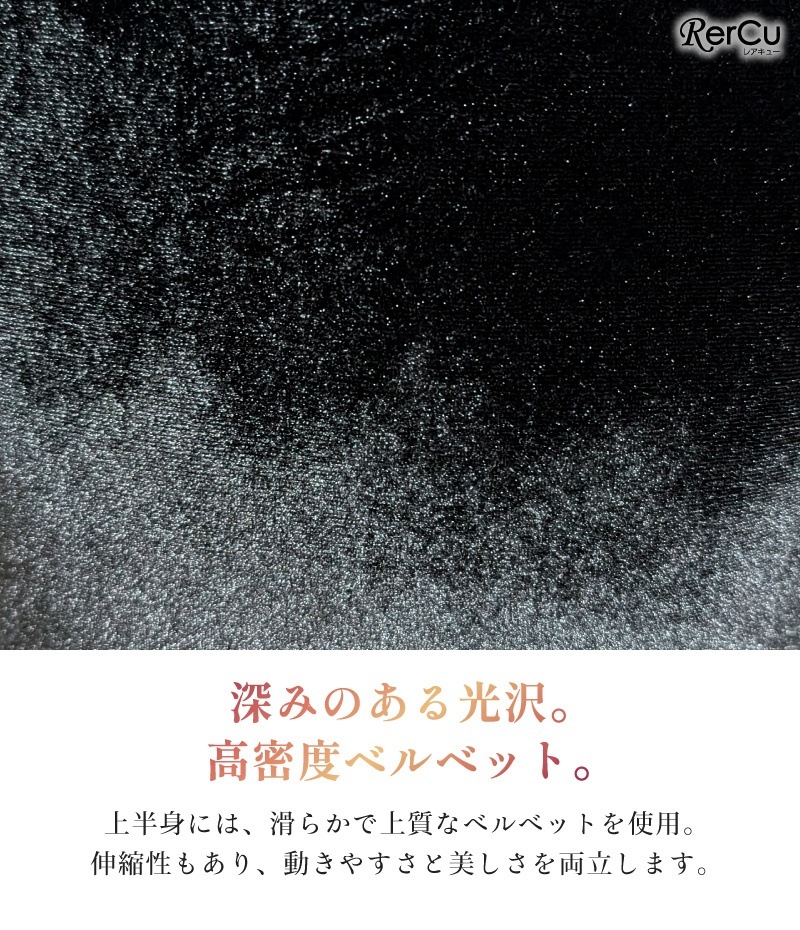 上半身には伸縮性のある高密度ベルベットを使用し、動きやすさと美しさを両立。裏地には柔らかく蒸れにくい素材を採用しているため、チクチク感を抑え、長時間でも快適に過ごせます。背面の隠しファスナーは大きく開くロング仕様で、お着替えもスムーズ。360度どこから見ても隙のない美しさです。